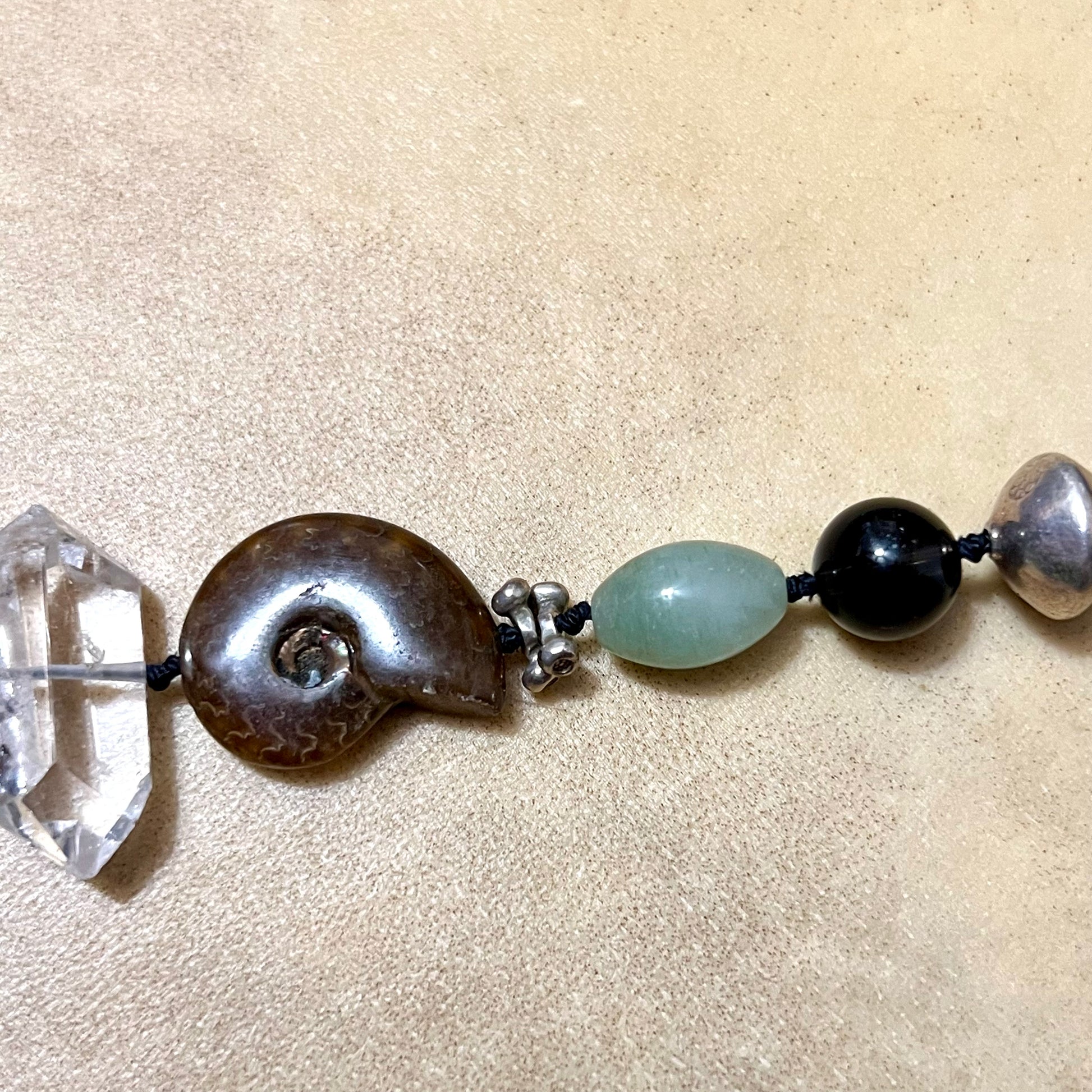 This hand knotted necklace is a true STUNNER! Featuring a rainbow of colors and materials including Coral, Amethyst, Aventurine, Glass, Ammonite, Quartz, Tourmaline, Citrine, Charoite, Lava Stone, and more. Closes with a decorative box clasp with Peridot green glass.