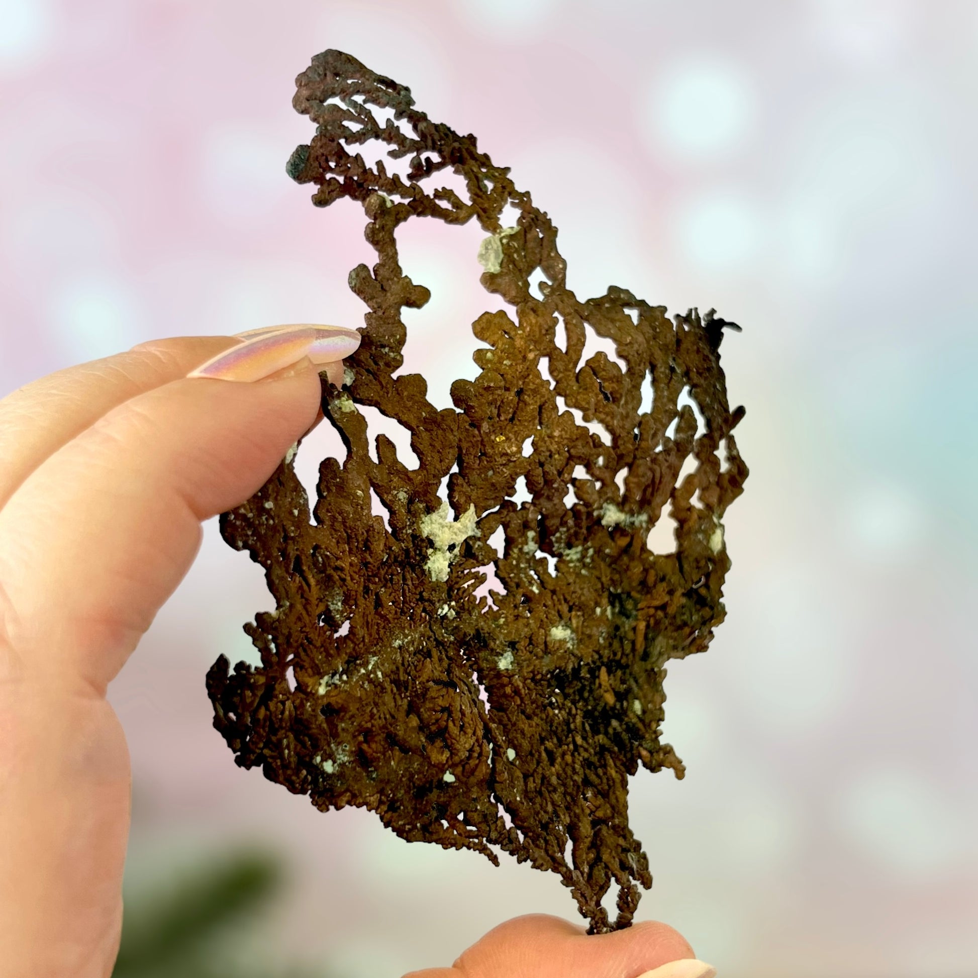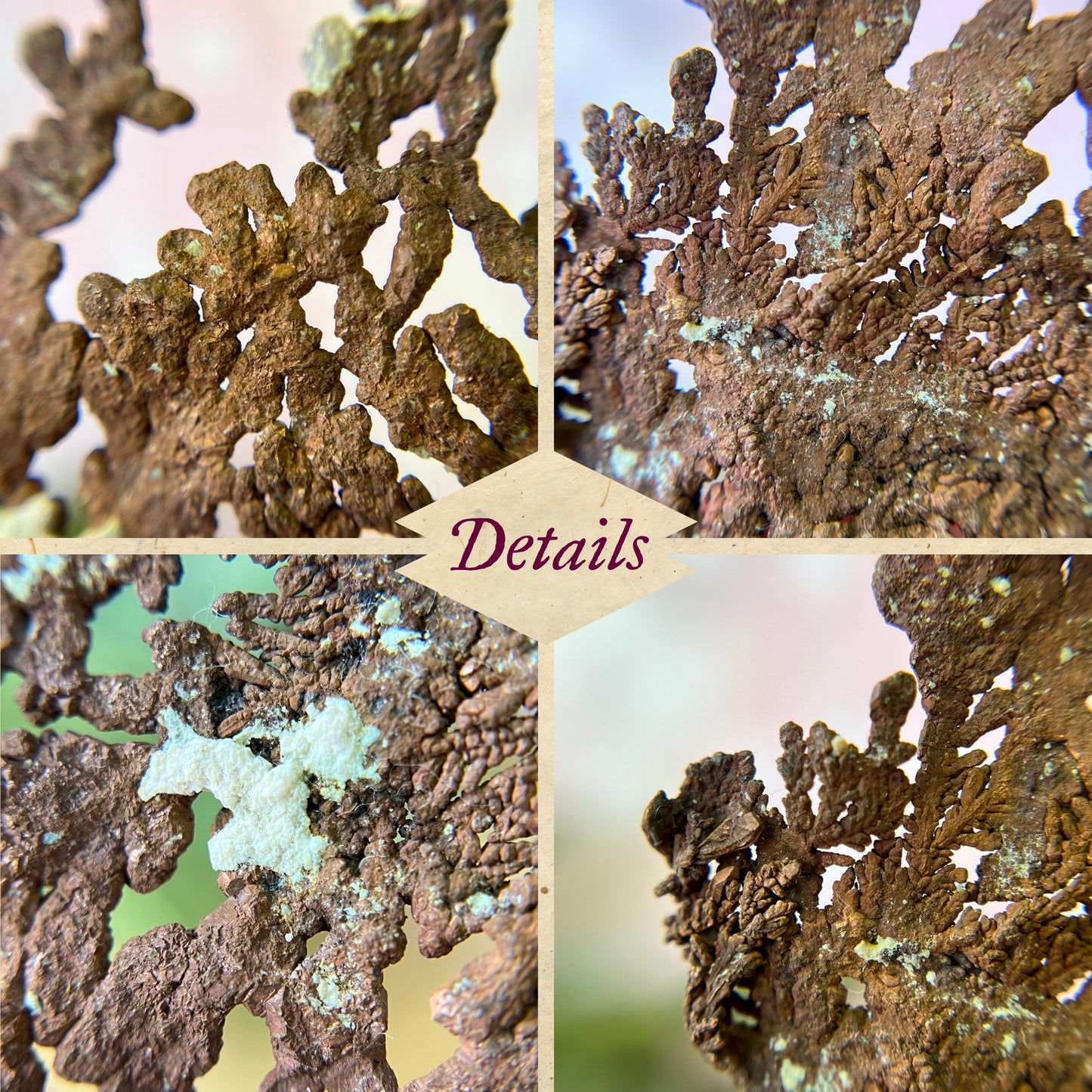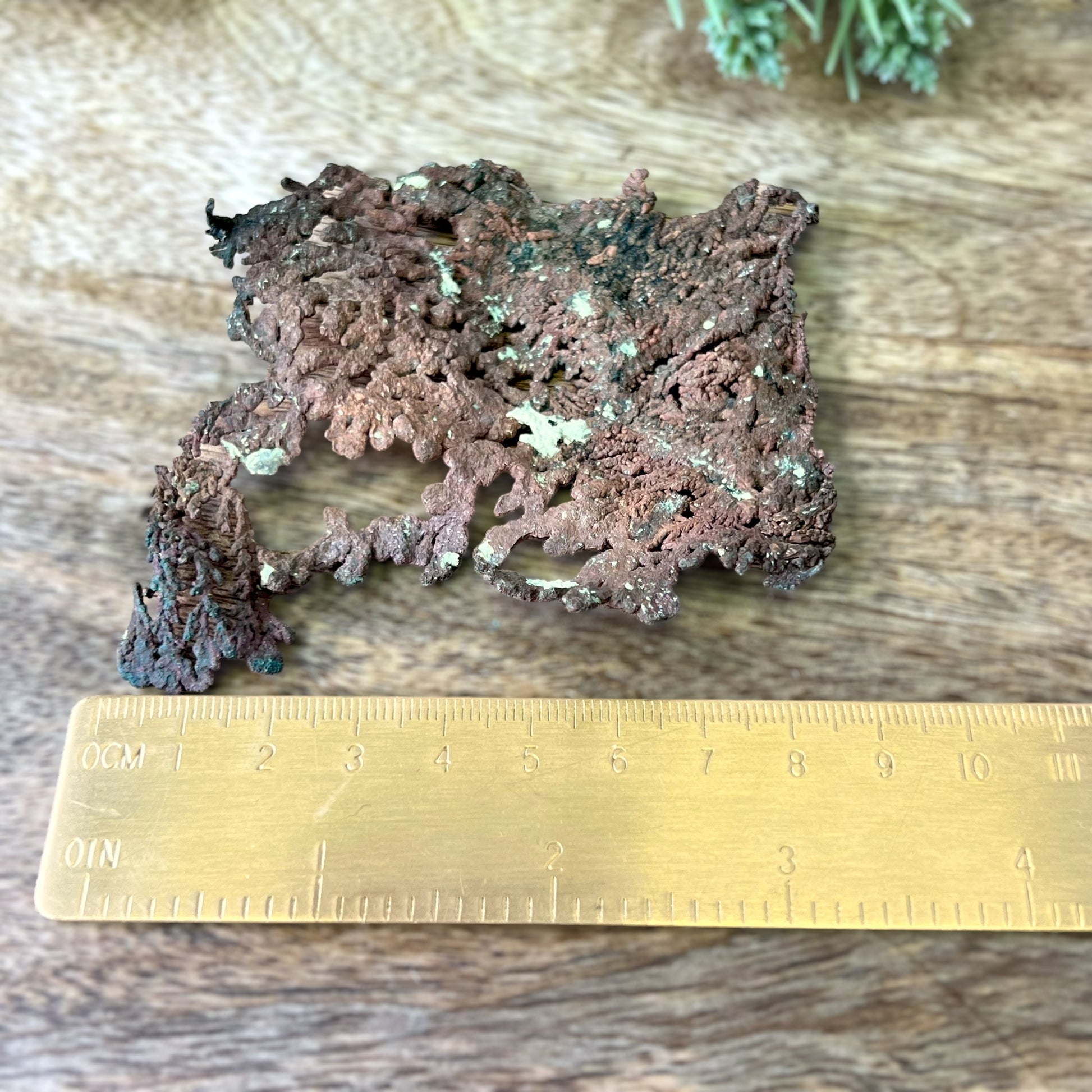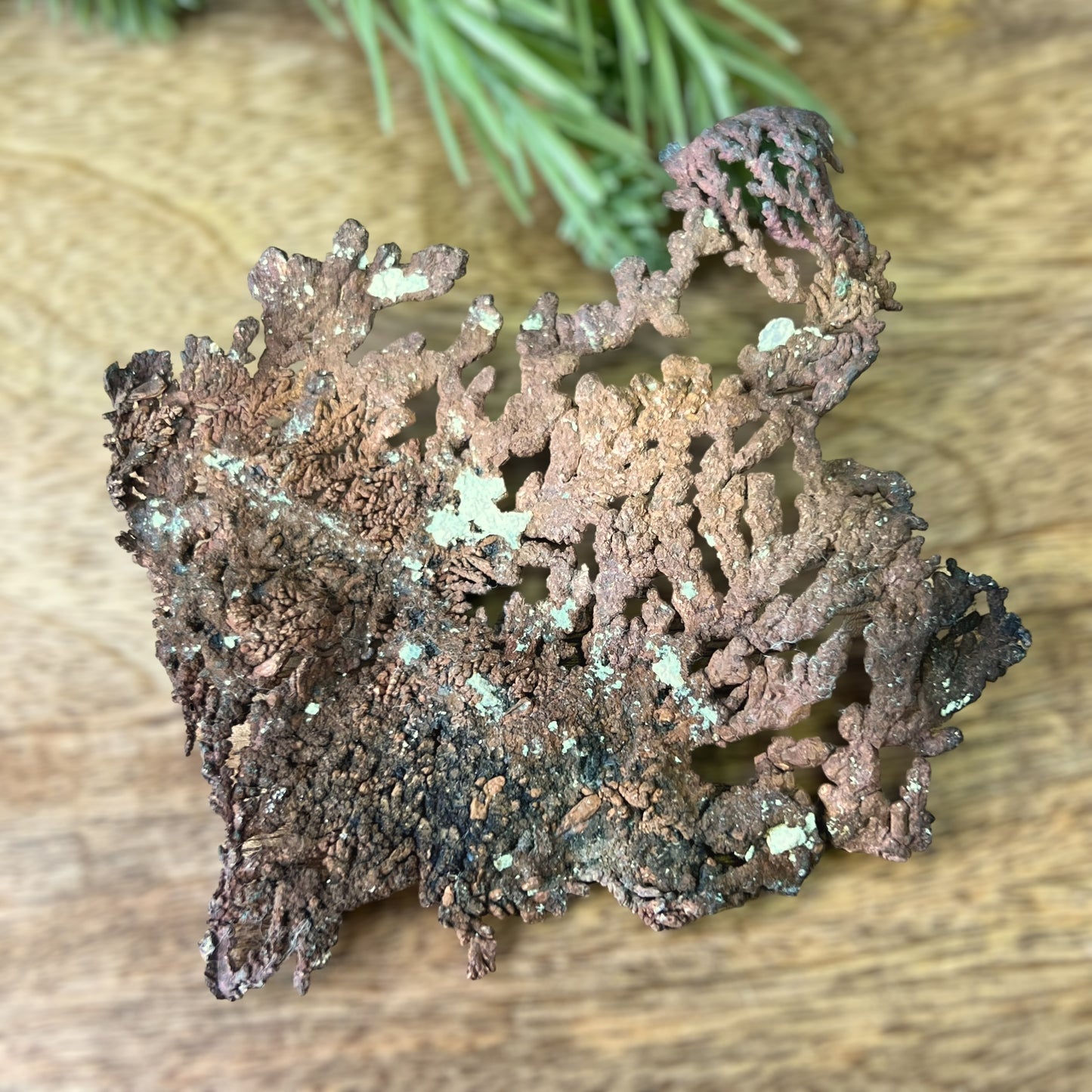 Enhance your spiritual practices with this natural rough Copper specimen. It has lovely blooms of mossy green verdigris forming over it. Very flat with fractal growth. A generously sized piece, its edges can be a little sharp so handle with care.
