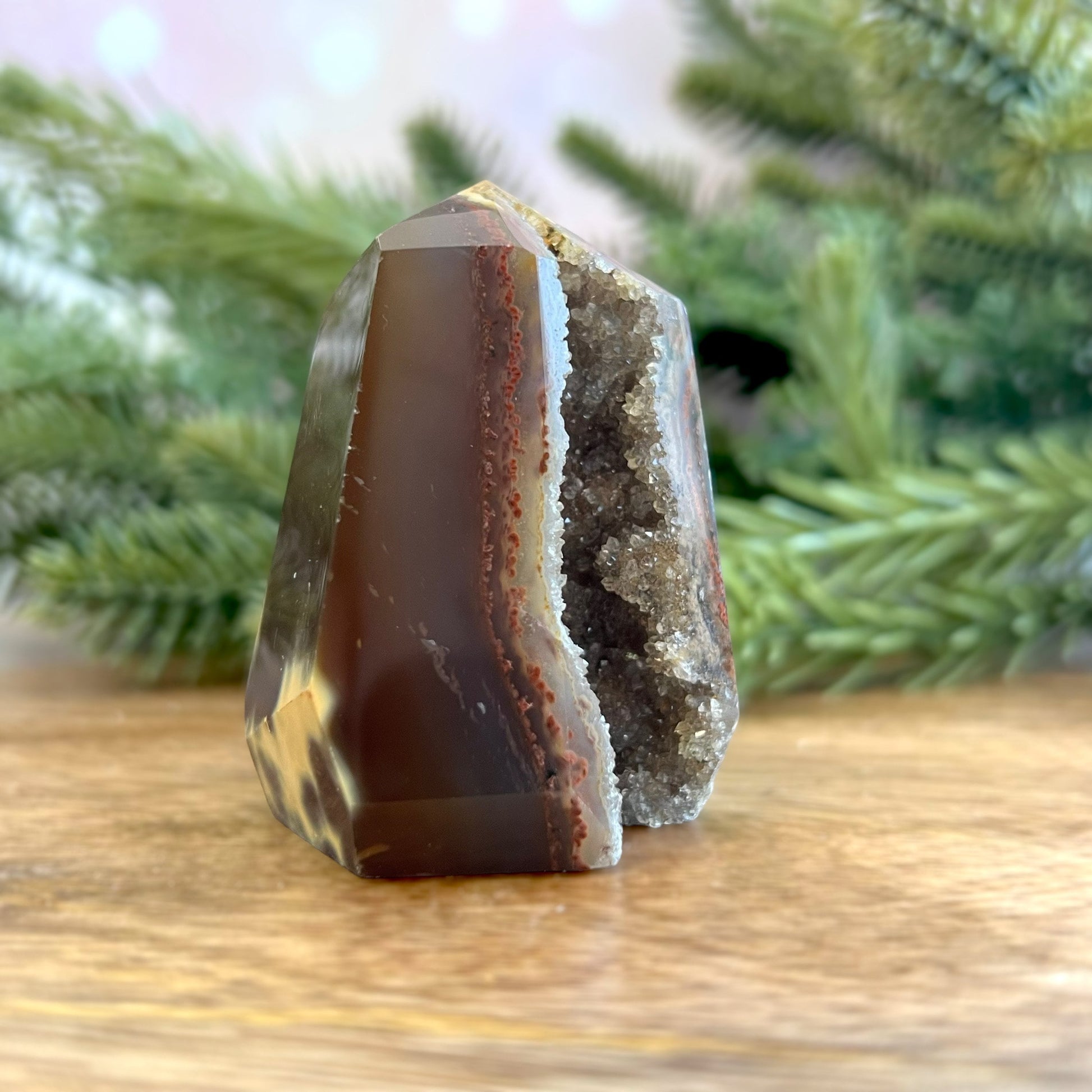 Enhance your spiritual practices with this beautiful Carnelian crystal tower. This piece has a stunning druzy geode cave with tons of sparkle. The deep, dark red color is all-natural. A lot of red Carnelian on the market has been heat-treated to enhance its color. This Tower has not.