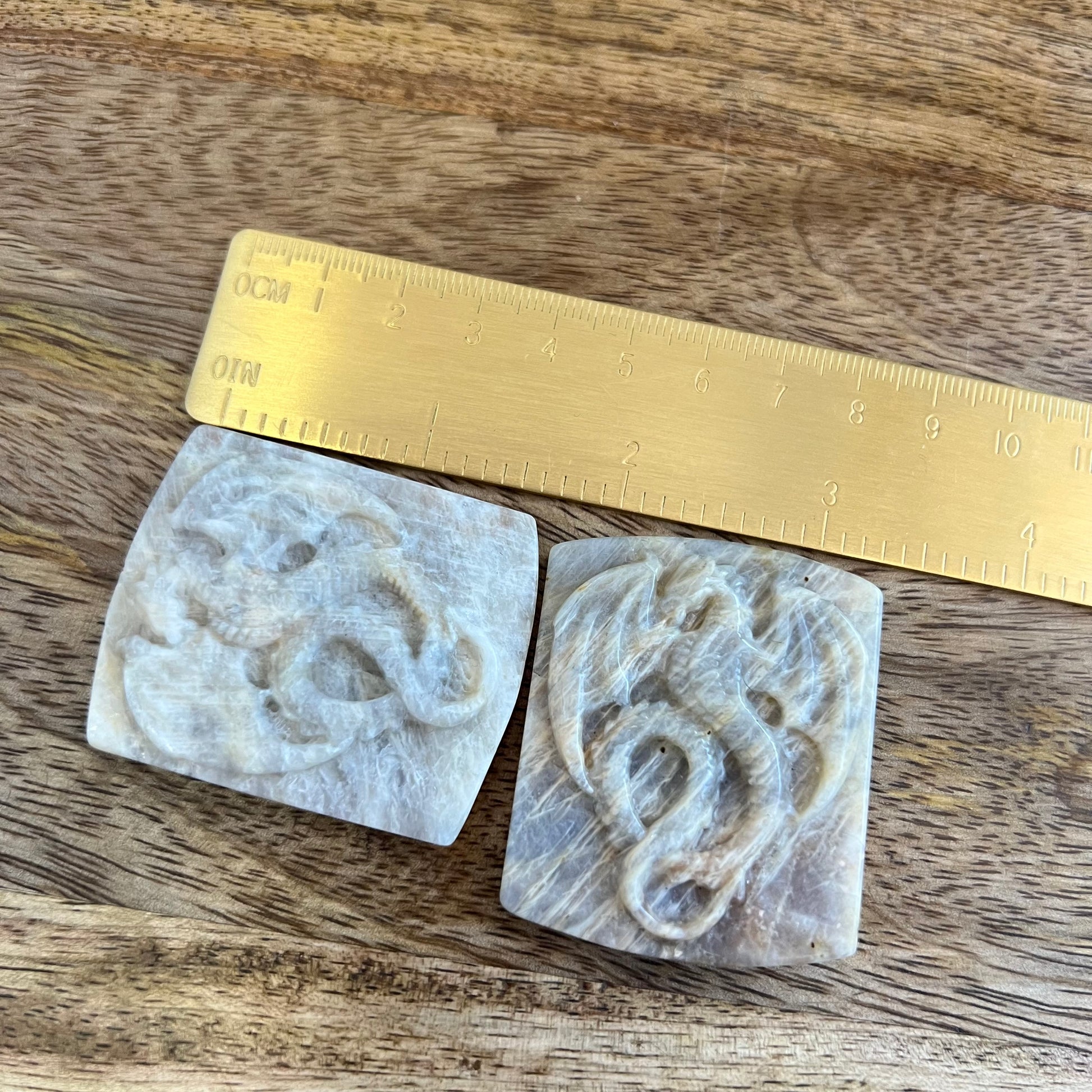 Enhance your spiritual practices with this beautiful Sunstone in Moonstone (Belomorite) carved stone cabochon. This crystal features a detailed carving of a dragon.