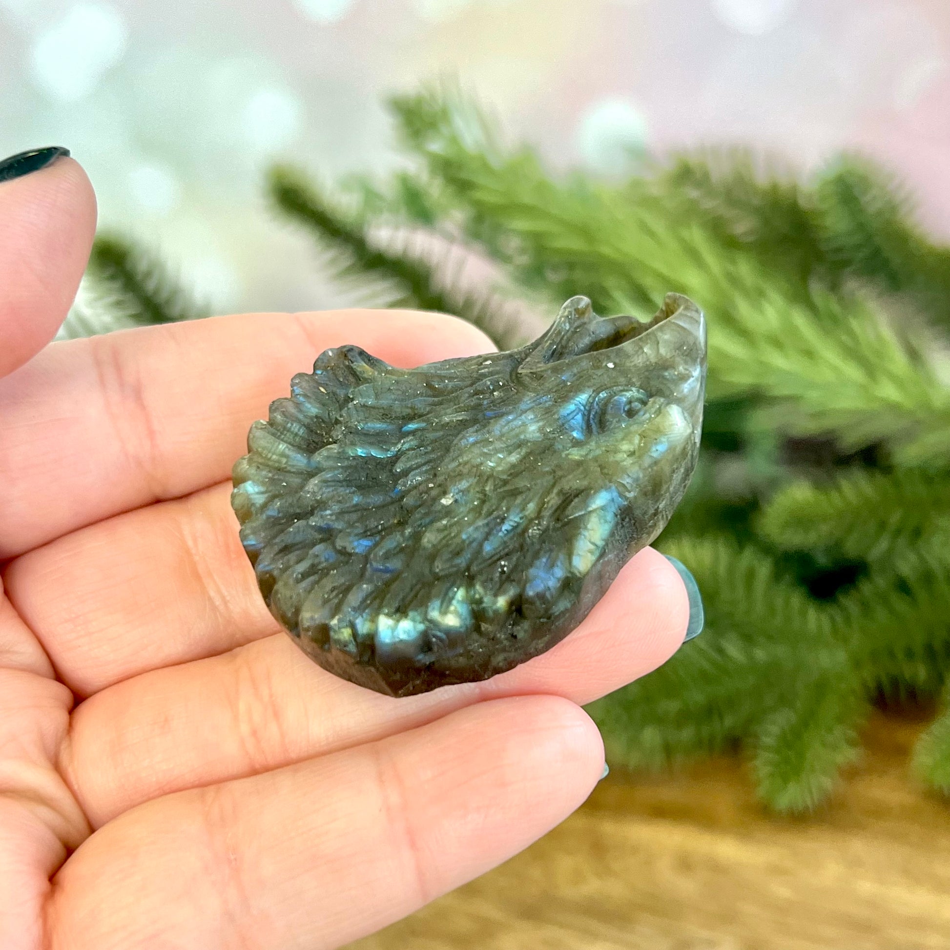 Enhance your spiritual practices with this beautiful flashy Labradorite carved stone cabochon. This crystal has been intricately carved into an eagle head, each feather carefully defined. Let this cabochon remind you of your fierce and free spirit. Matte finish.