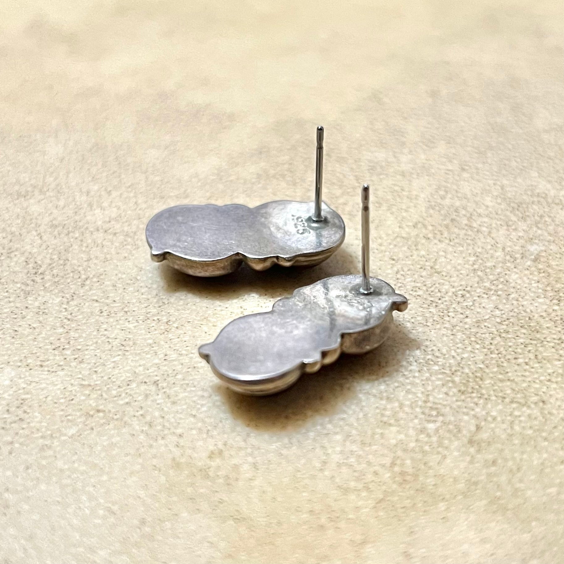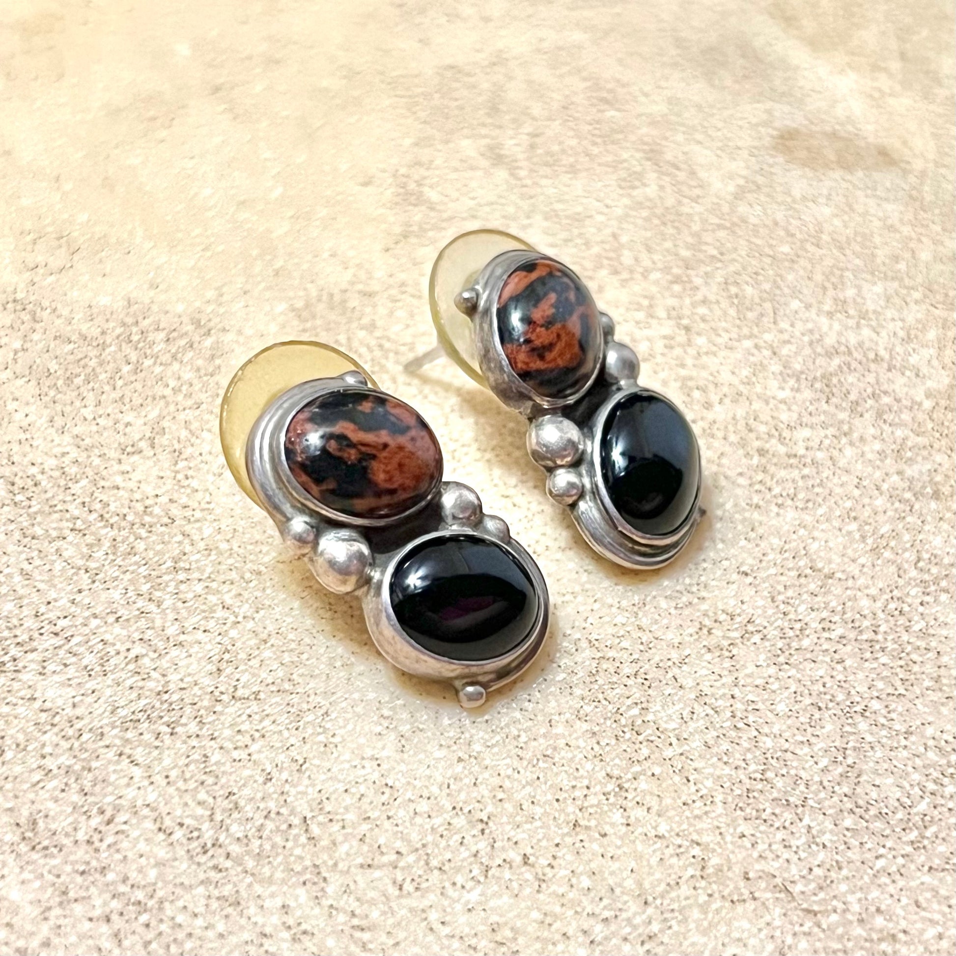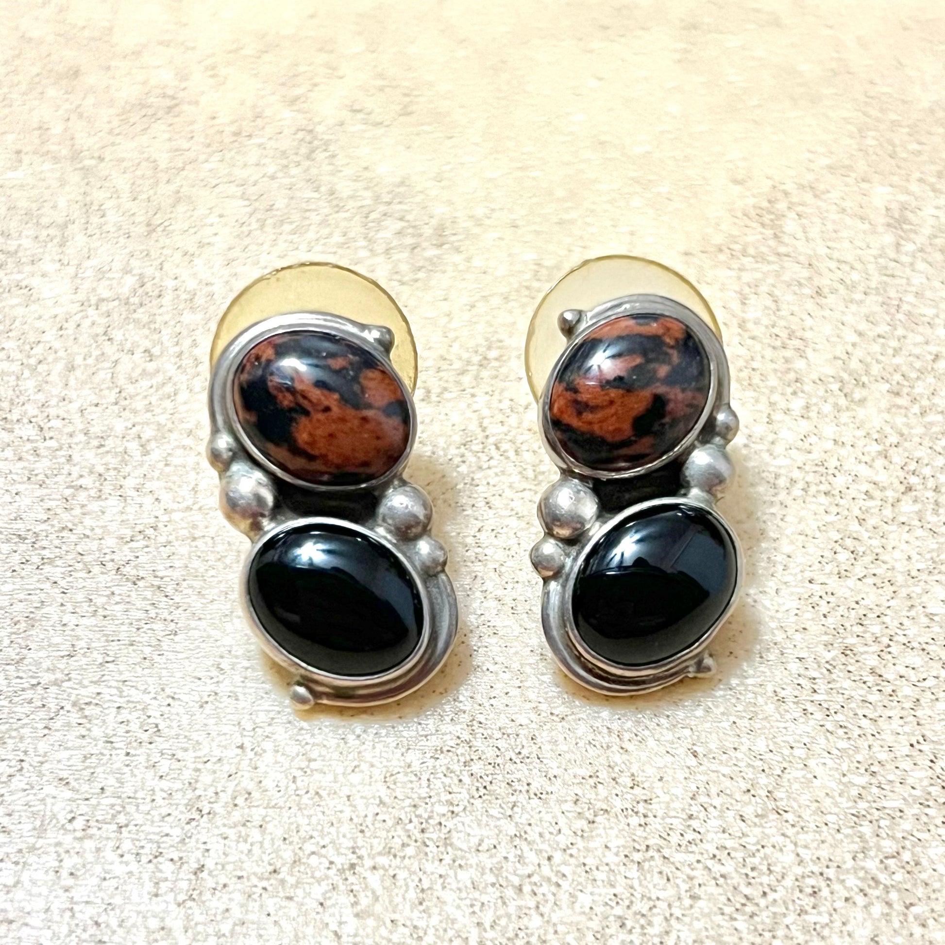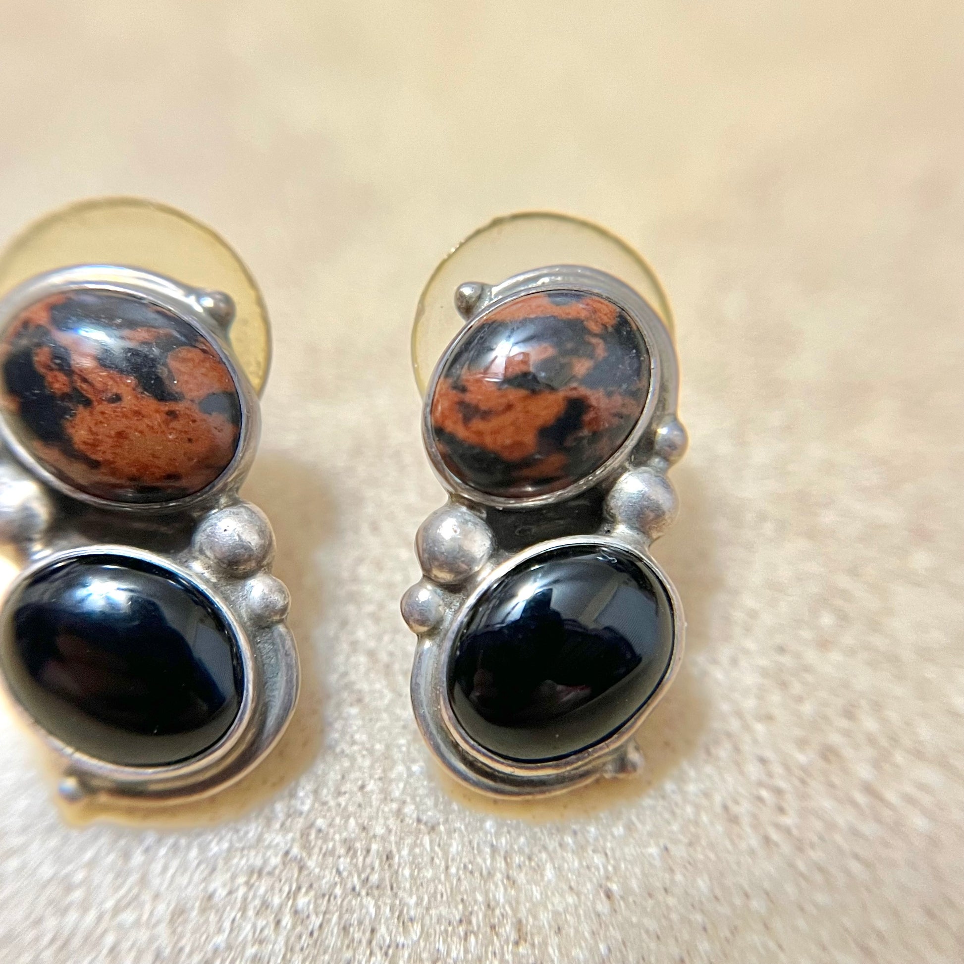 This beautiful pair of vintage Sterling silver earrings features two Stone cabochons. One Oval is Mahogany Obsidian and the second is Black Obsidian. Very good used condition with some surface tarnish.