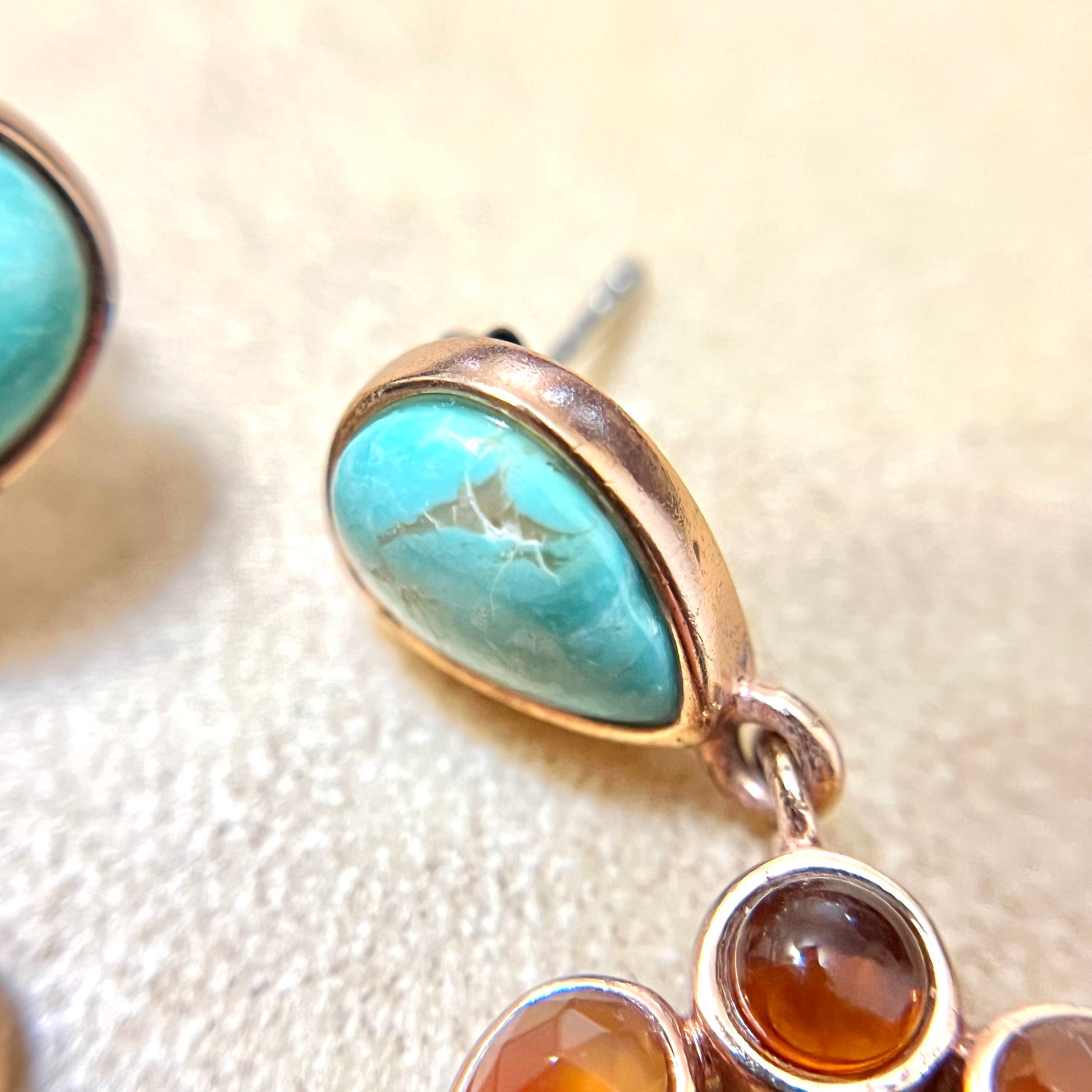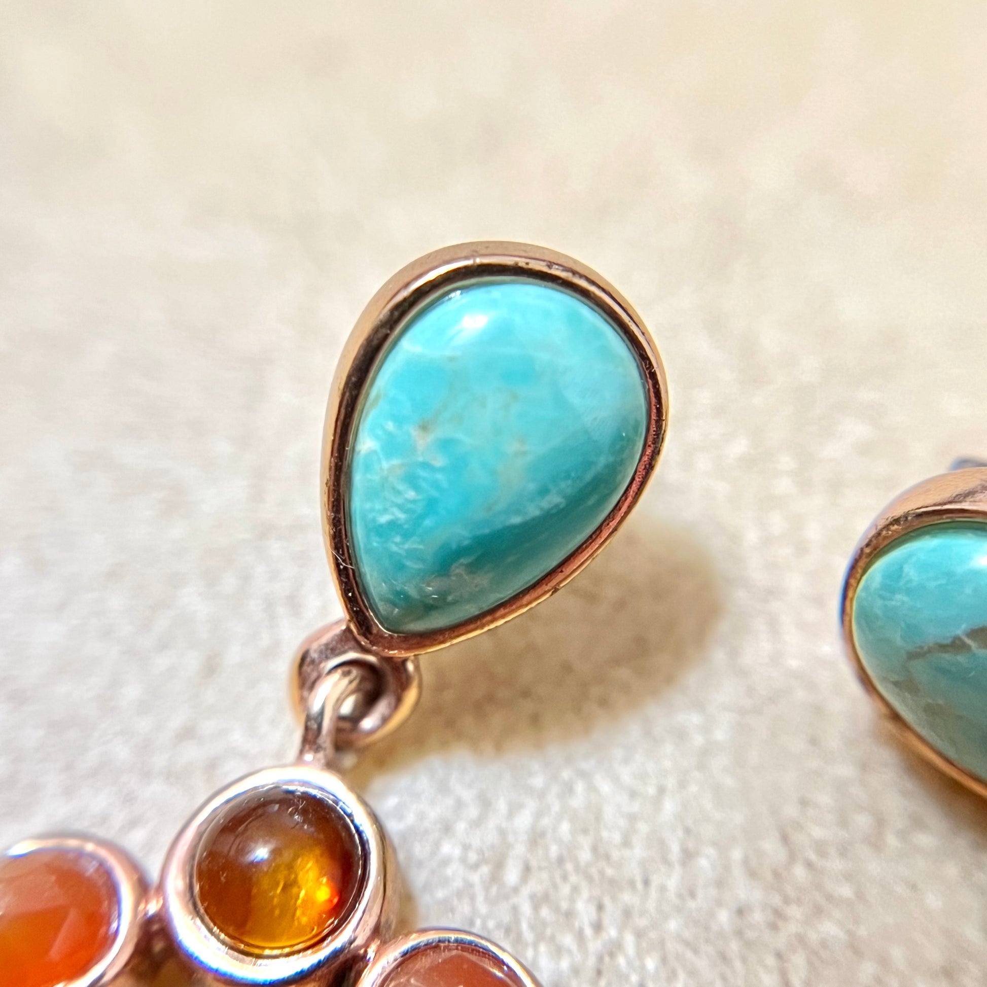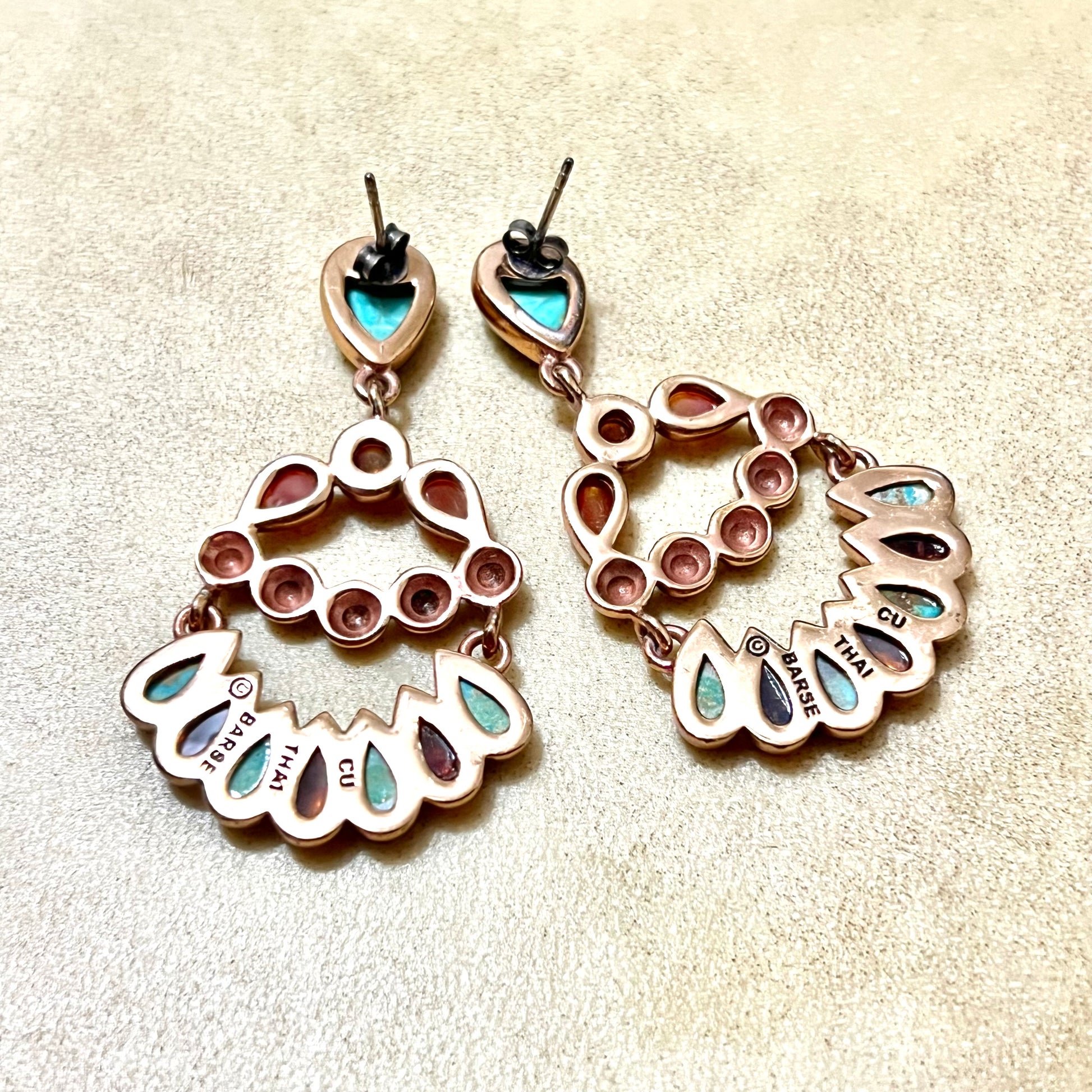 This beautiful pair of vintage Barse earrings features Teardrop inlays of Amber and Turquoise. Gold Plating over pure Copper core, stamped Thai. They're in like new condition with very little wear.