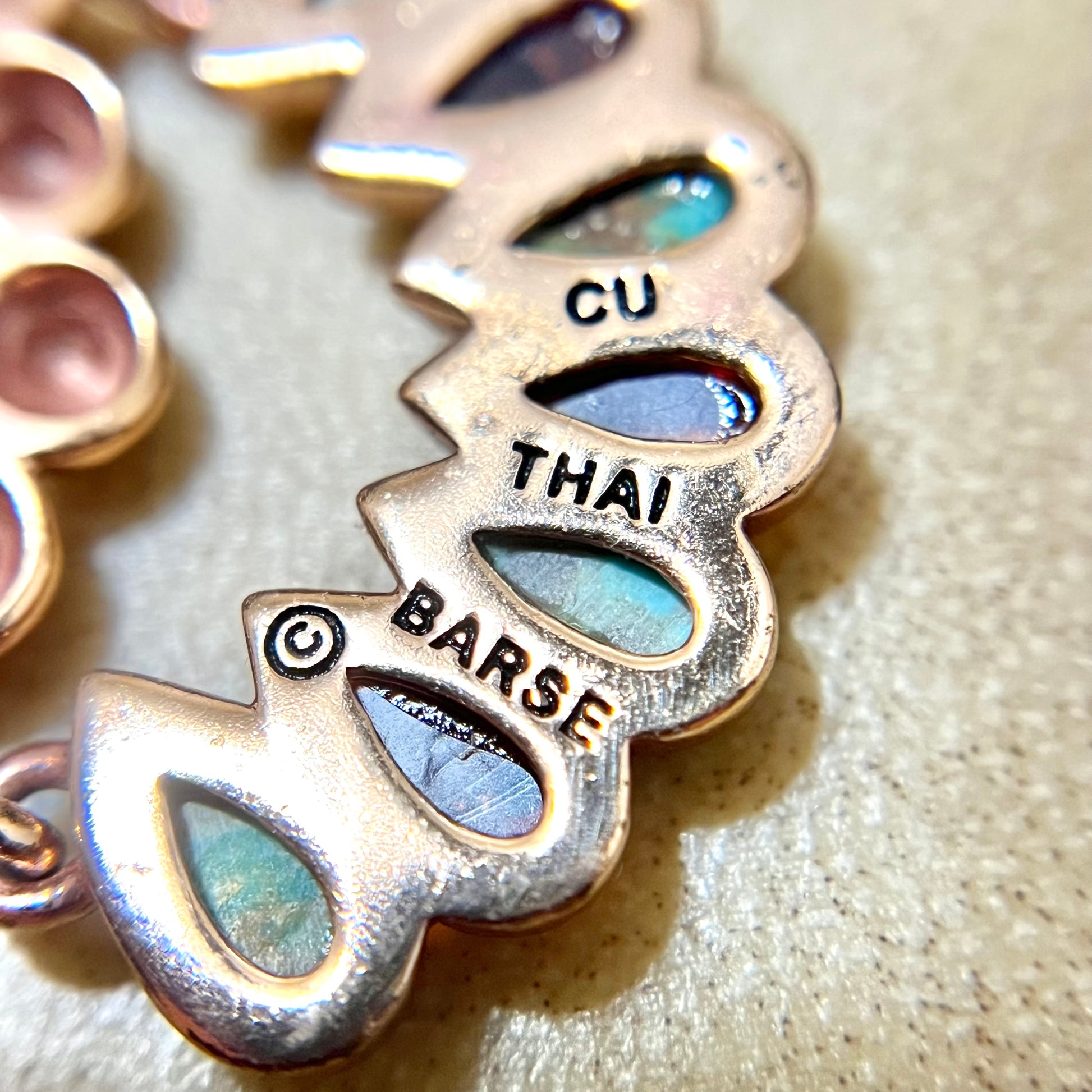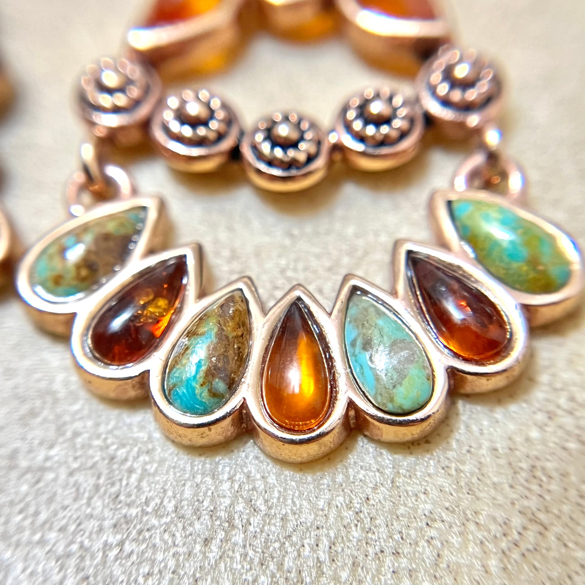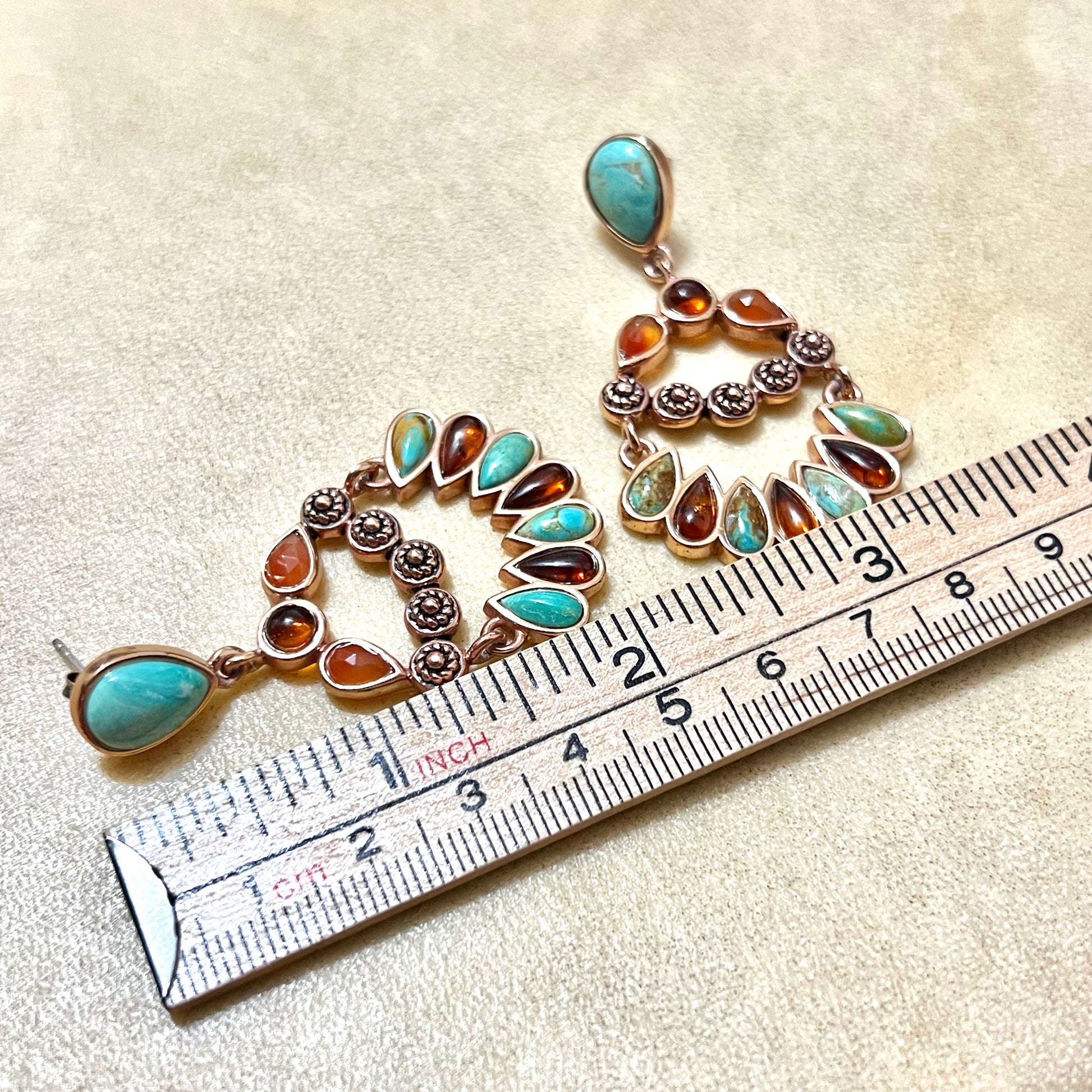 This beautiful pair of vintage Barse earrings features Teardrop inlays of Amber and Turquoise. Gold Plating over pure Copper core, stamped Thai. They're in like new condition with very little wear.