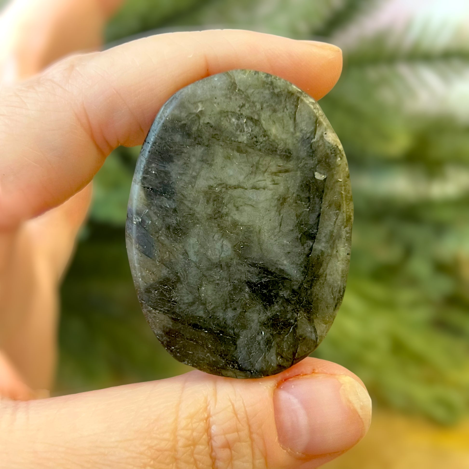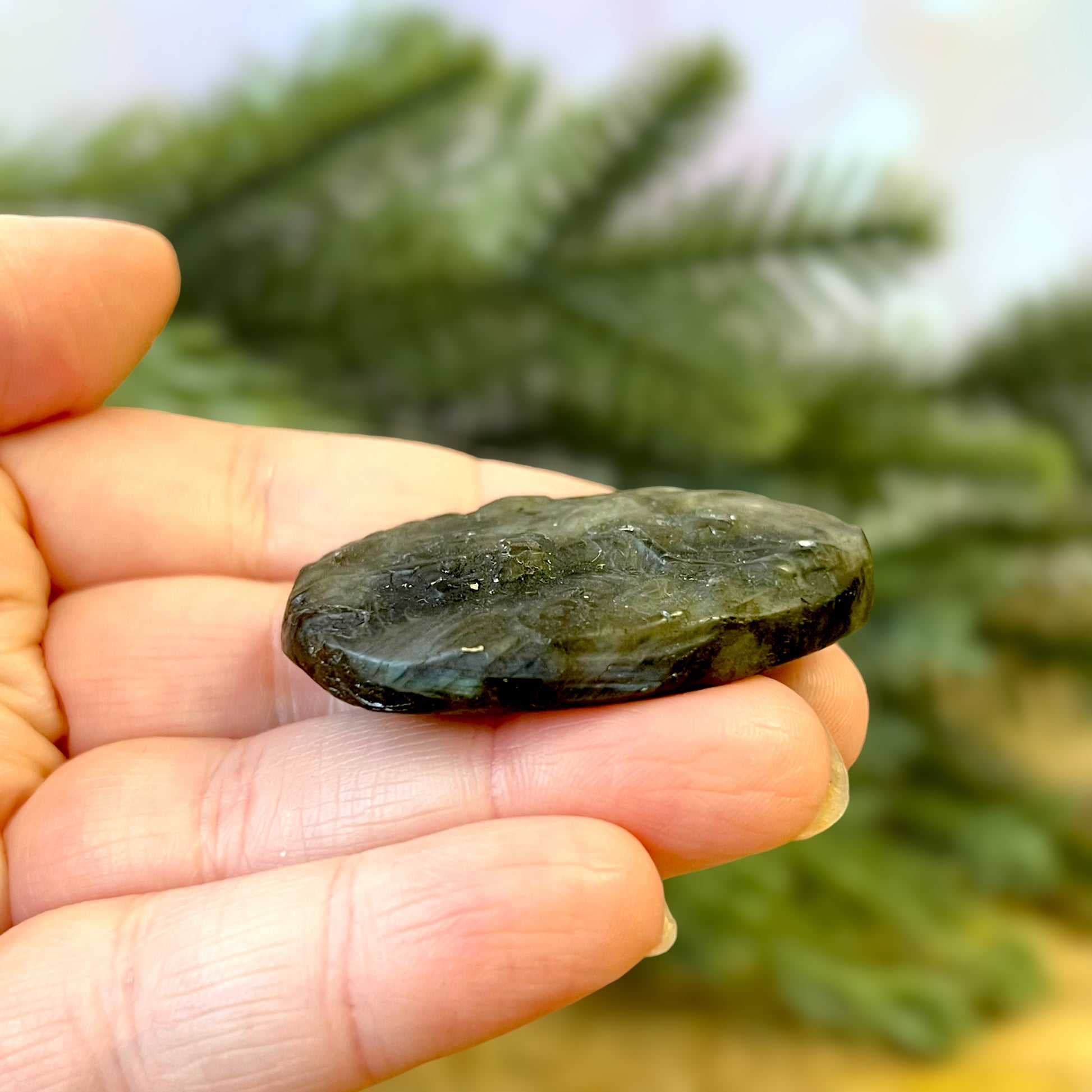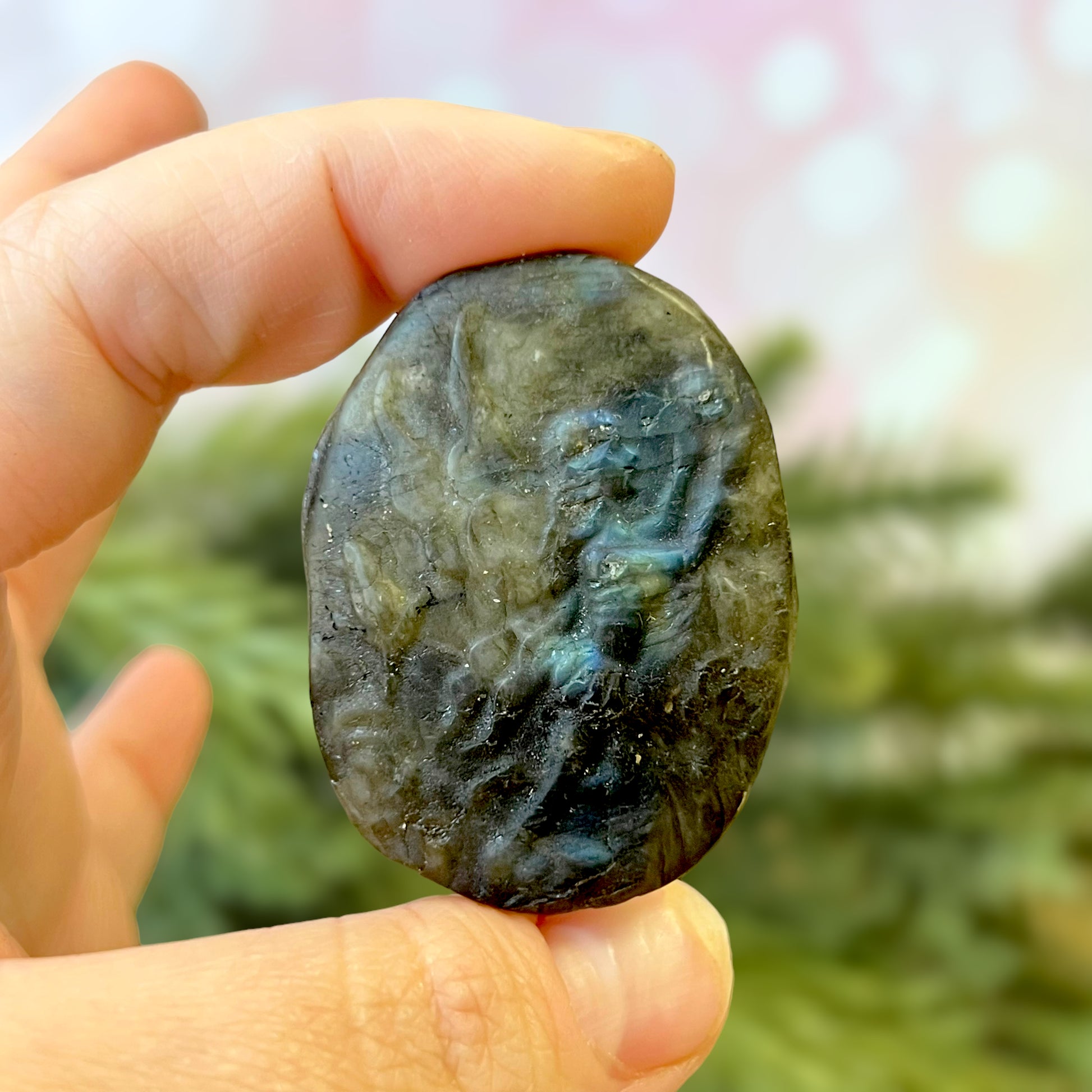 Enhance your spiritual practices with this beautiful Labradorite carved stone cabochon. This crystal features a detailed fairy, flying among flowers. The Fae are fantastical winged beings that can be found in cultures around the world. Each different culture has its own stories about these creatures - whether they be beneficial or harmful to humans.