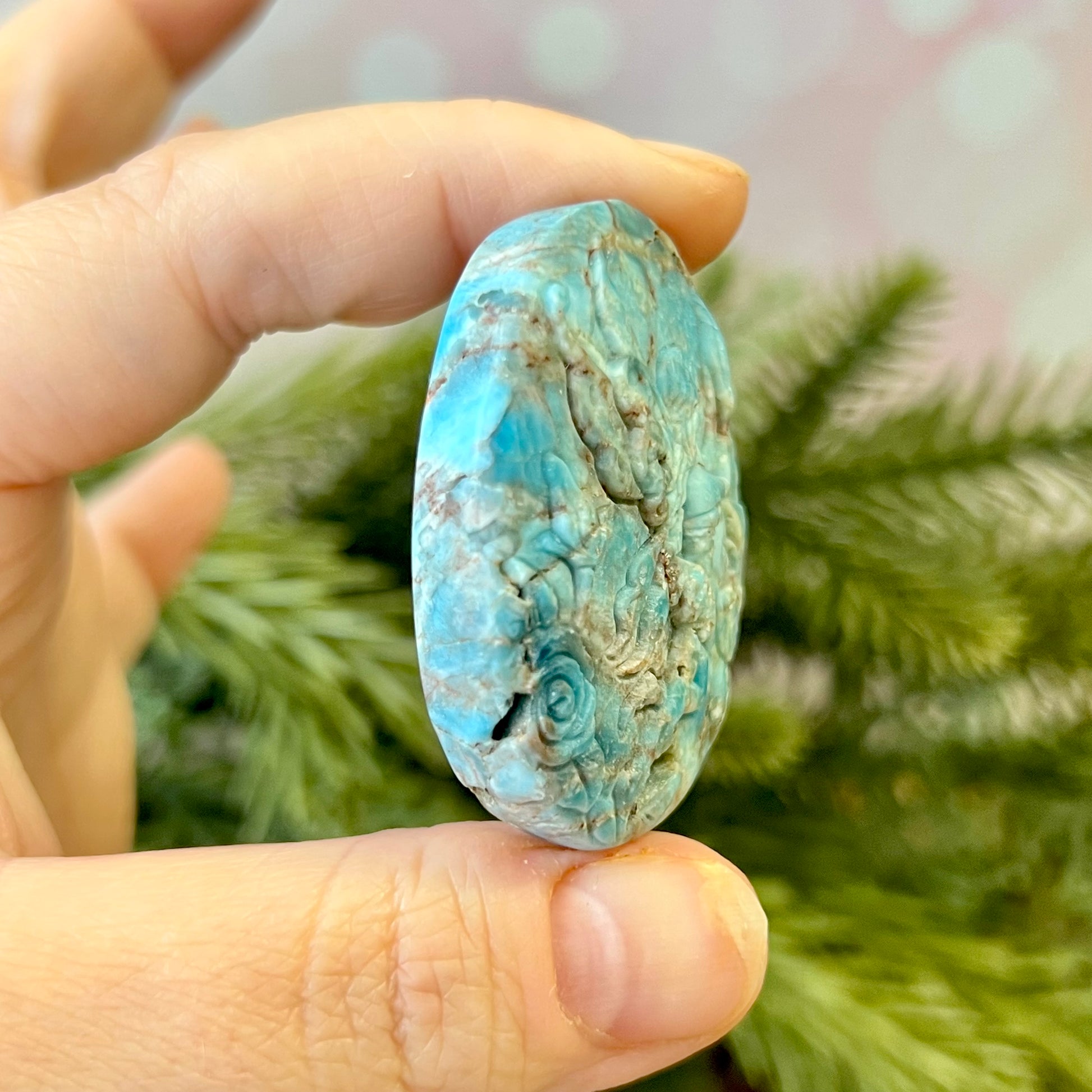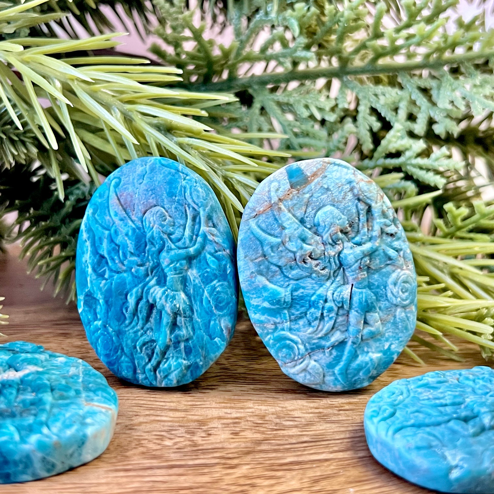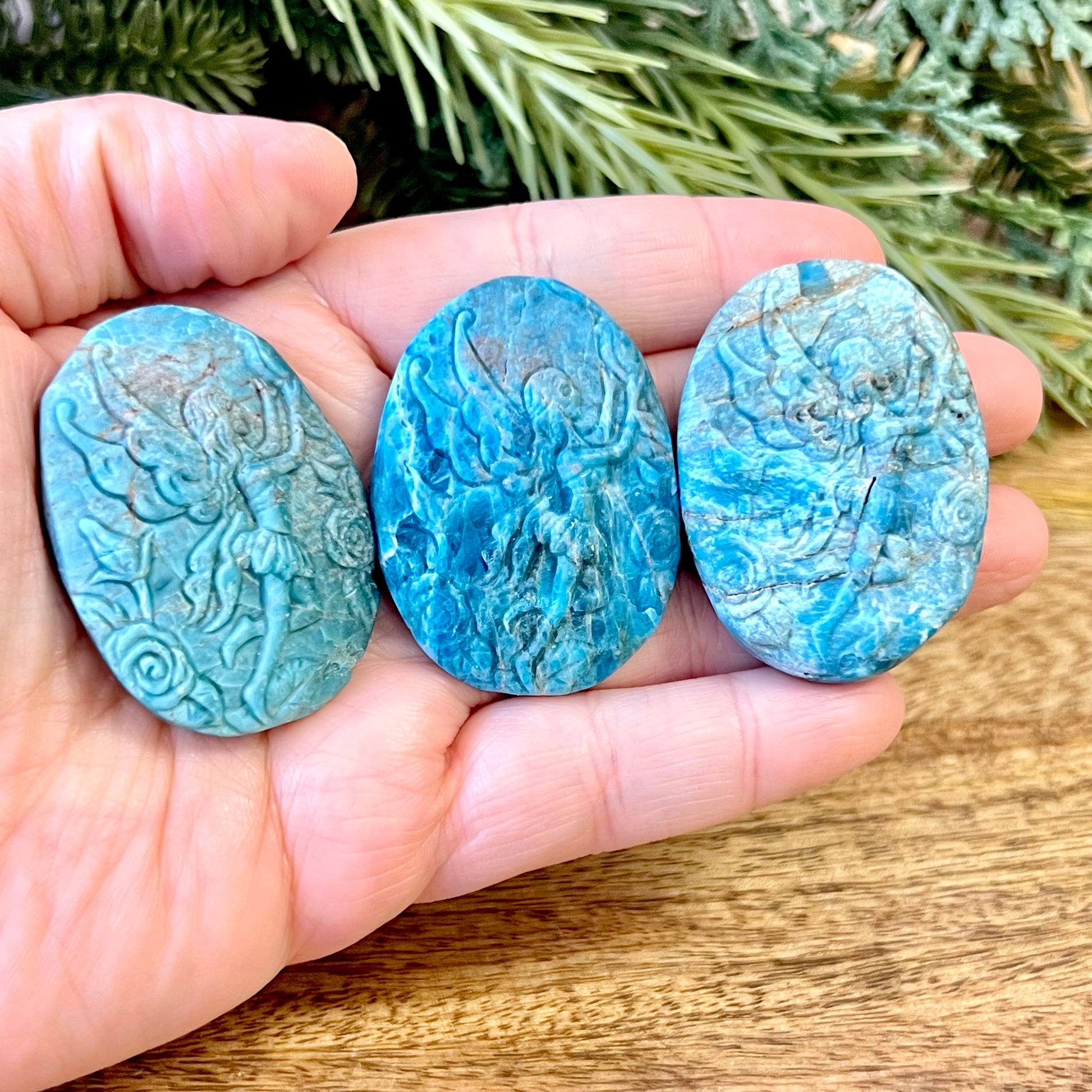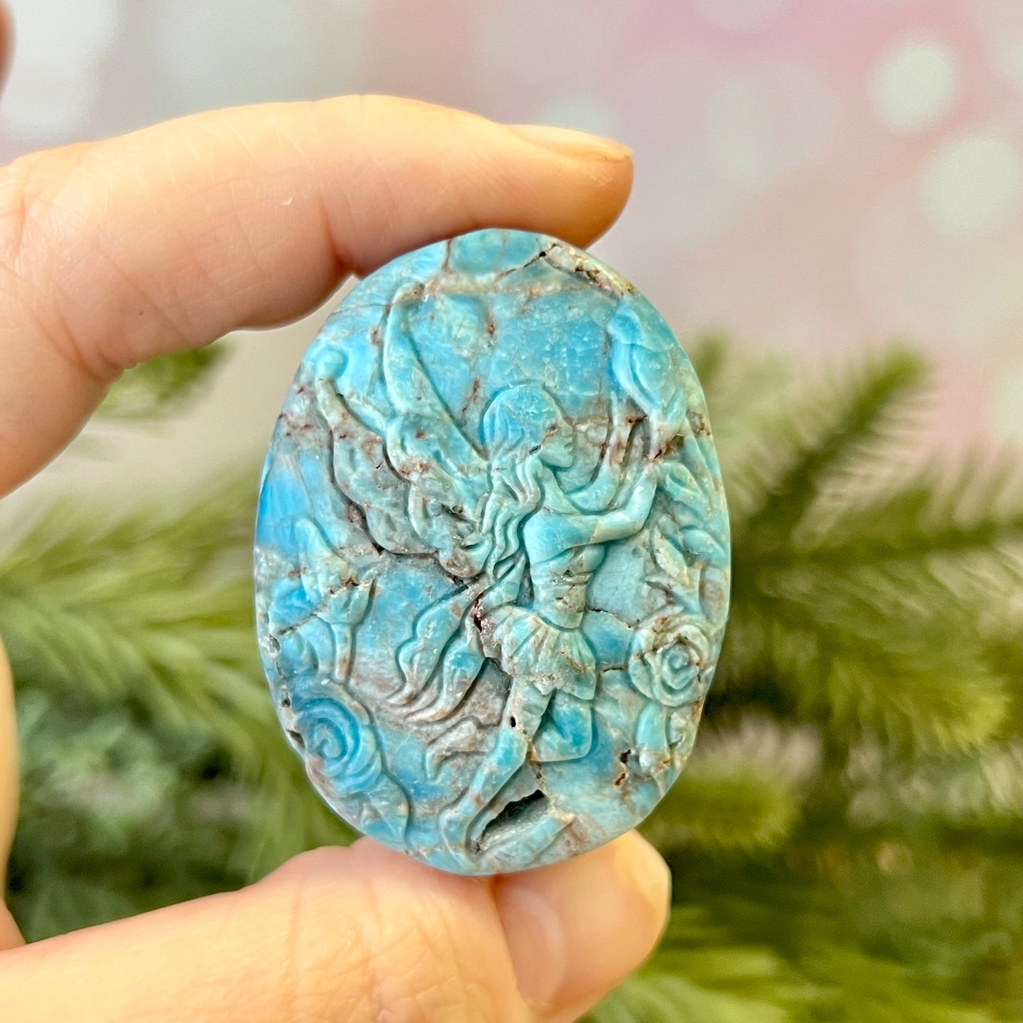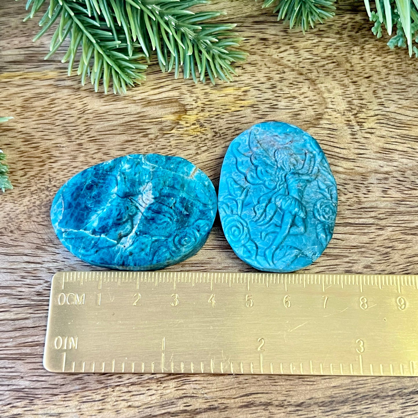 Enhance your spiritual practices with this beautiful blue Apatite carved stone cabochon. This crystal features a detailed fairy, flying among flowers. The Fae are fantastical winged beings that can be found in cultures around the world. Each different culture has its own stories about these creatures - whether they be beneficial or harmful to humans.