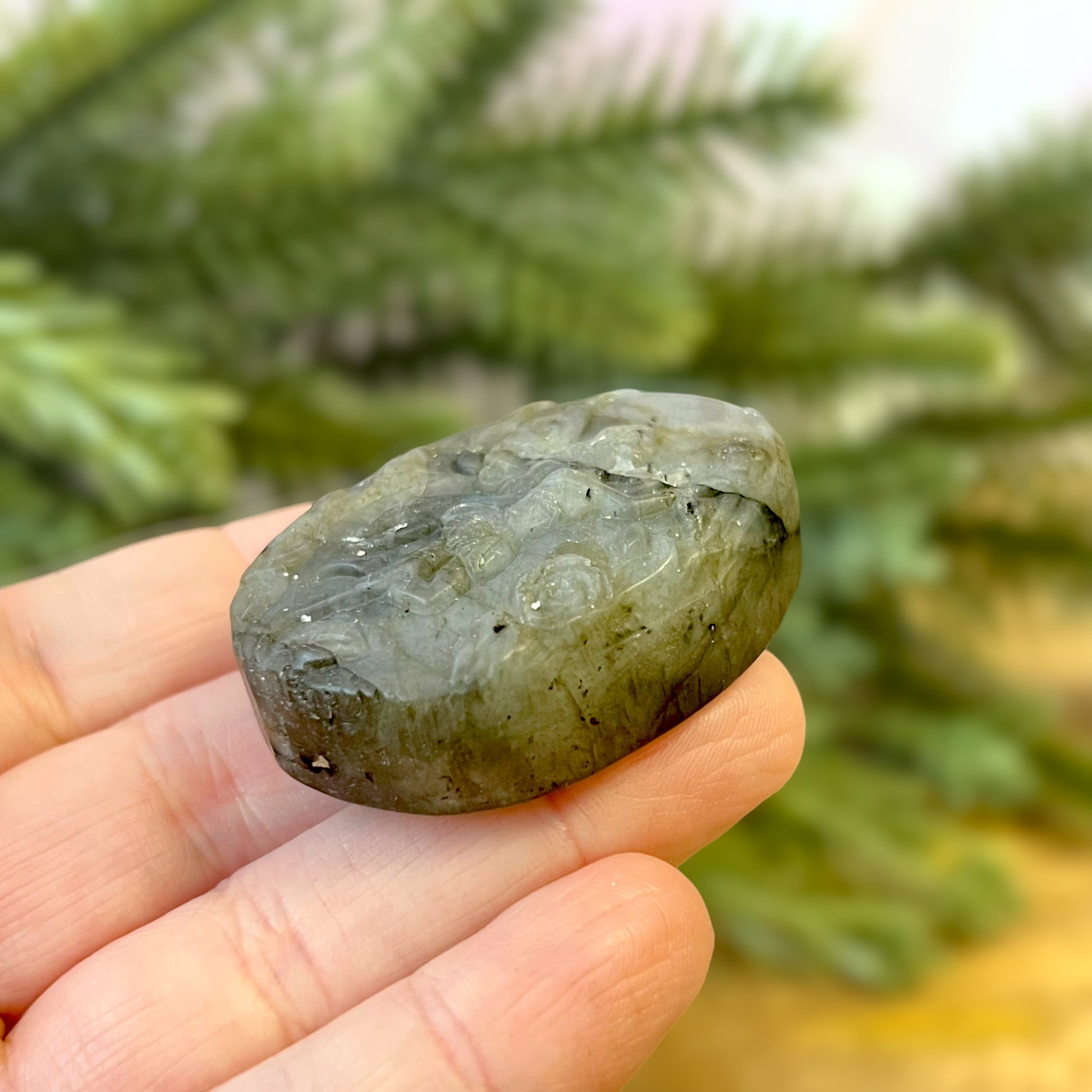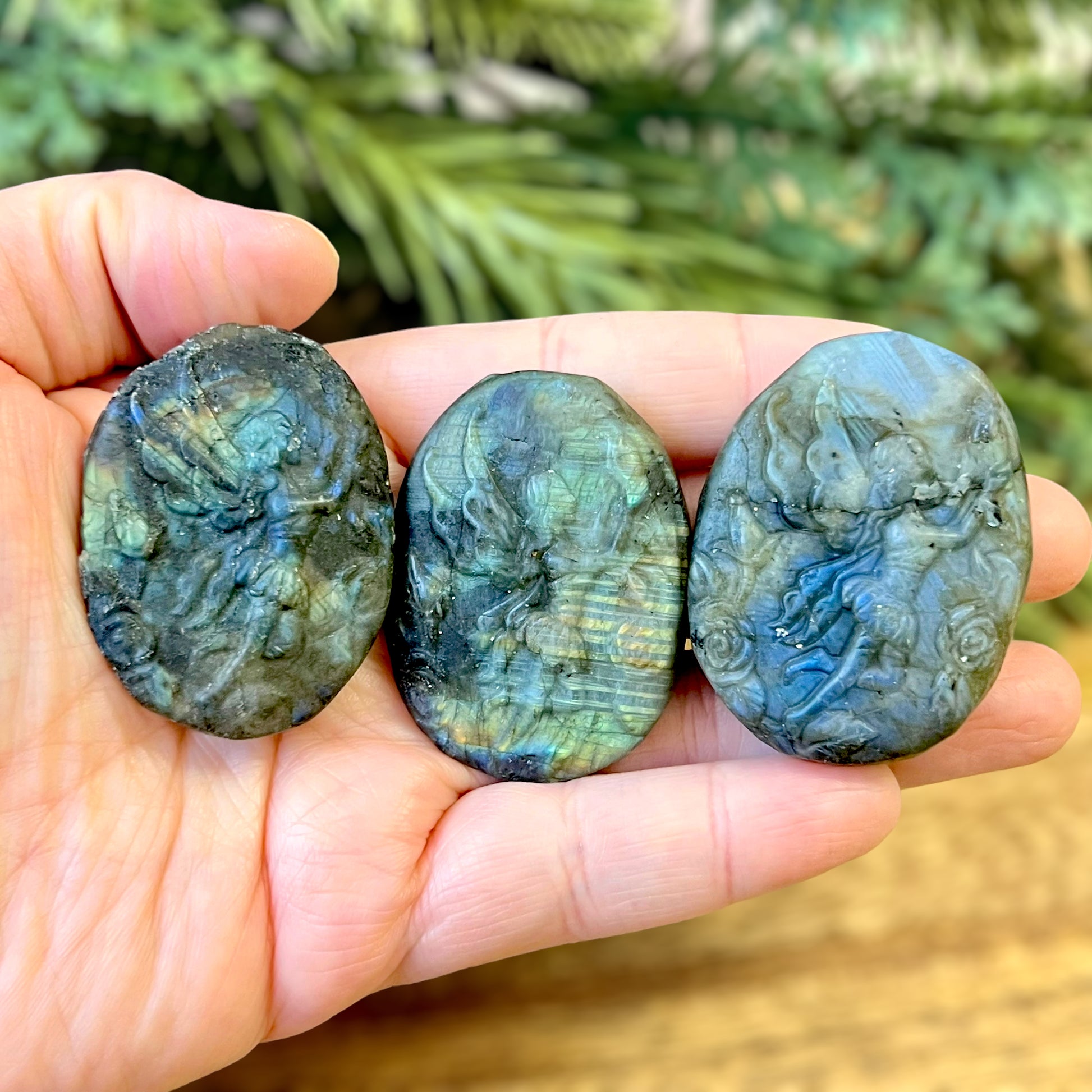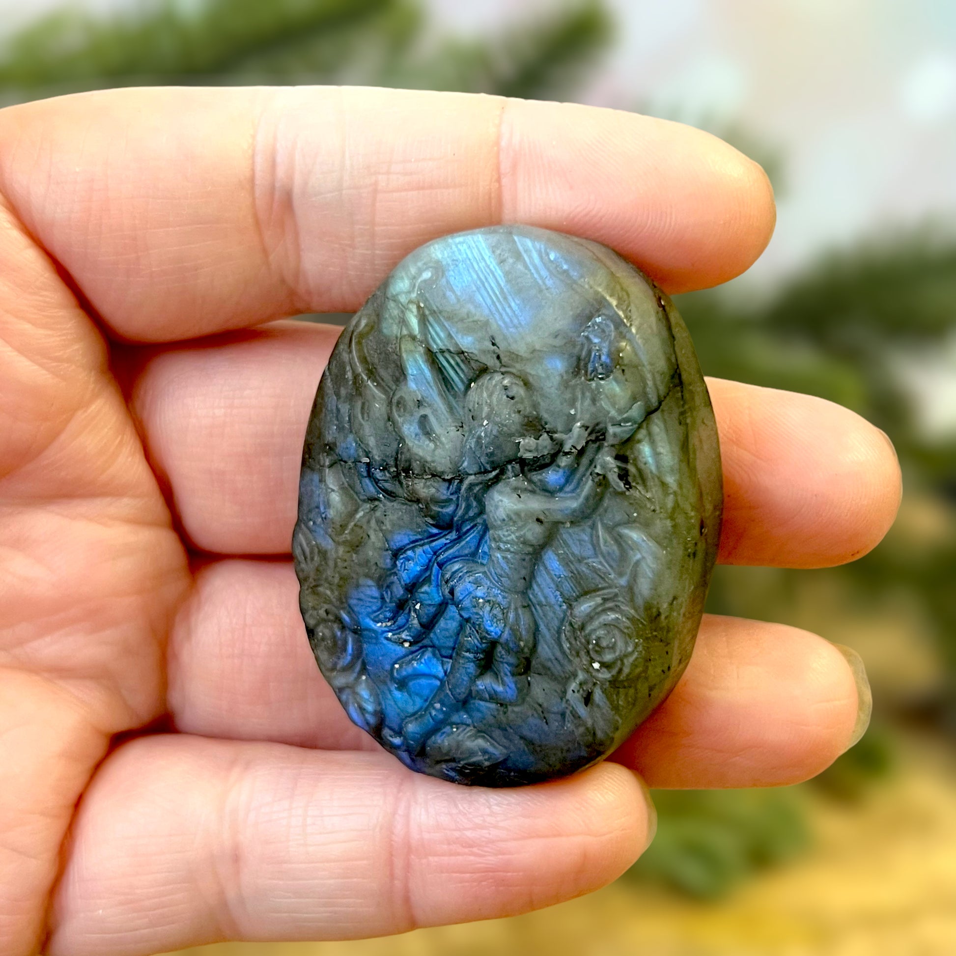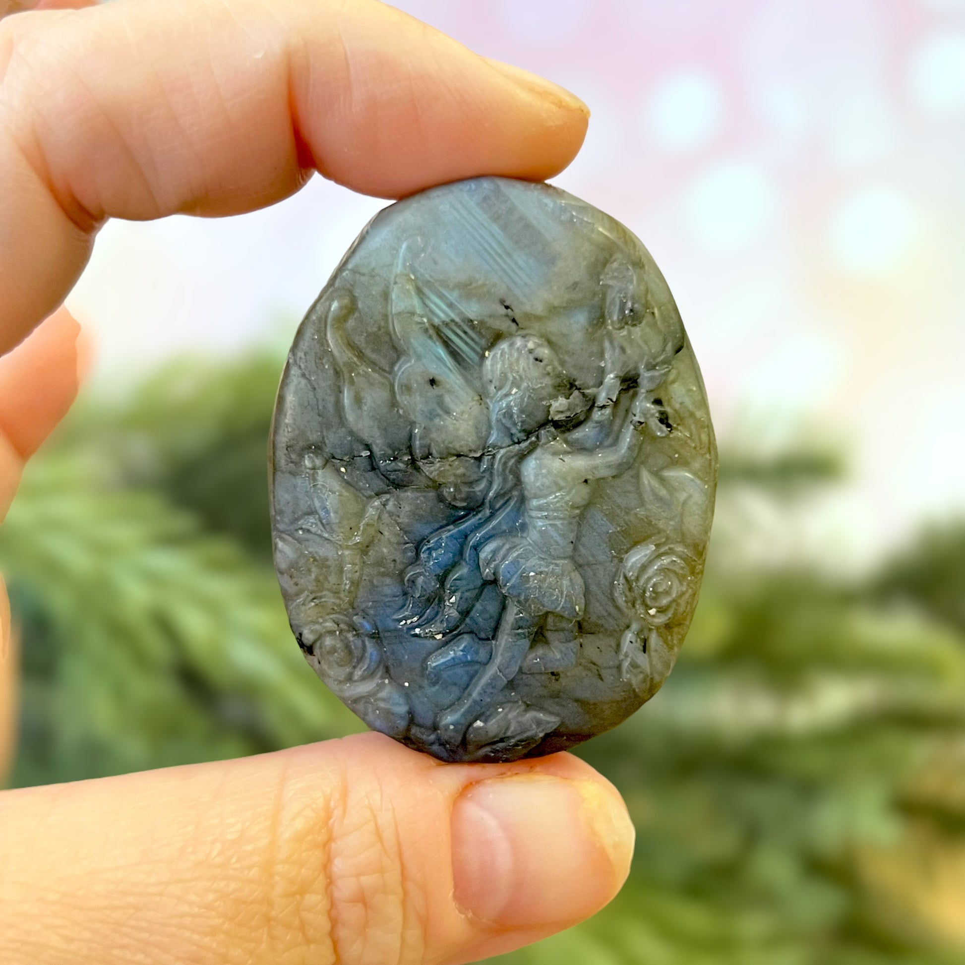 Enhance your spiritual practices with this beautiful Labradorite carved stone cabochon. This crystal features a detailed fairy, flying among flowers. The Fae are fantastical winged beings that can be found in cultures around the world. Each different culture has its own stories about these creatures - whether they be beneficial or harmful to humans.