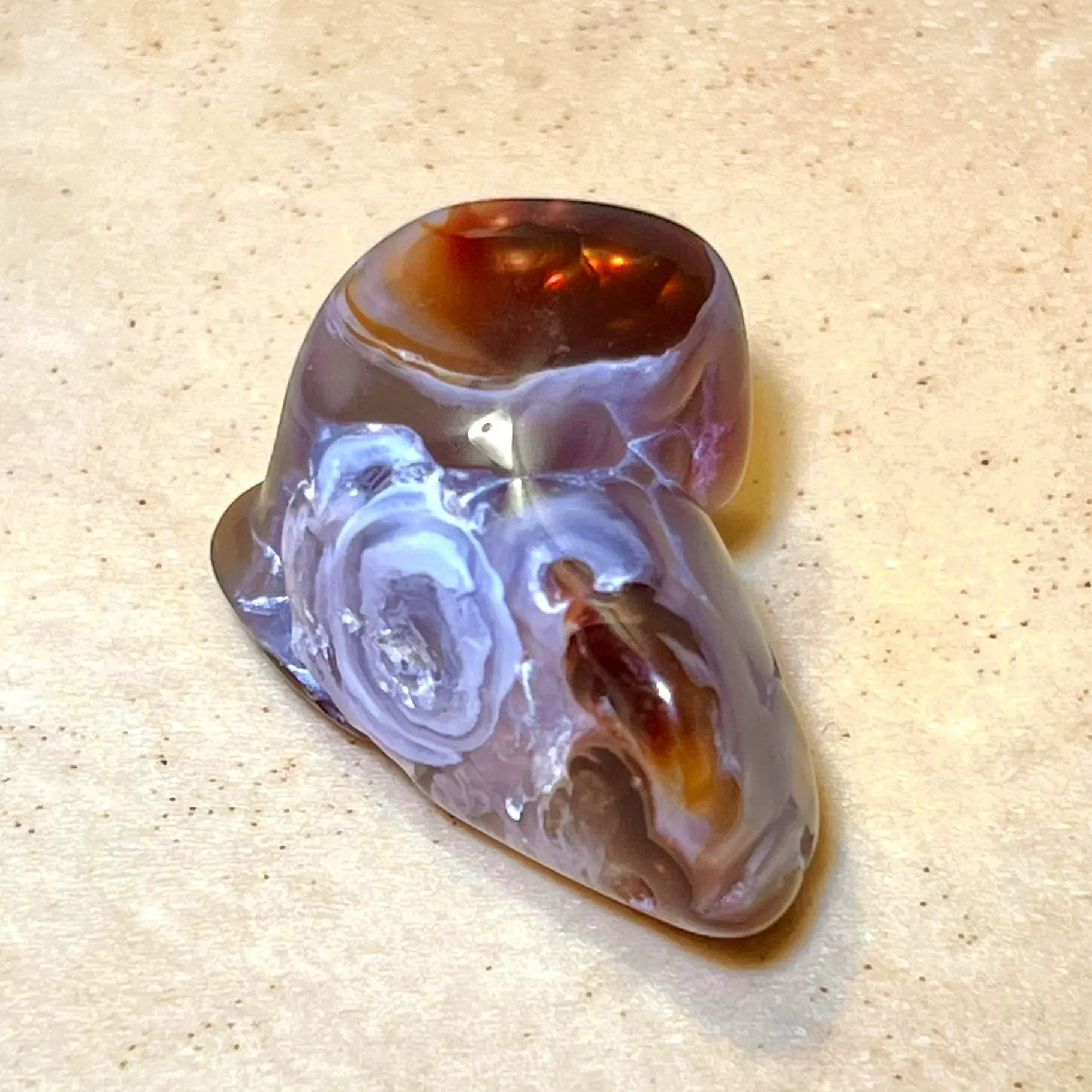 Enhance your spiritual practices with this beautiful Fire Agate tumbled stone. This crystal features a mostly flat free form shape. Has beautiful fire and high polish