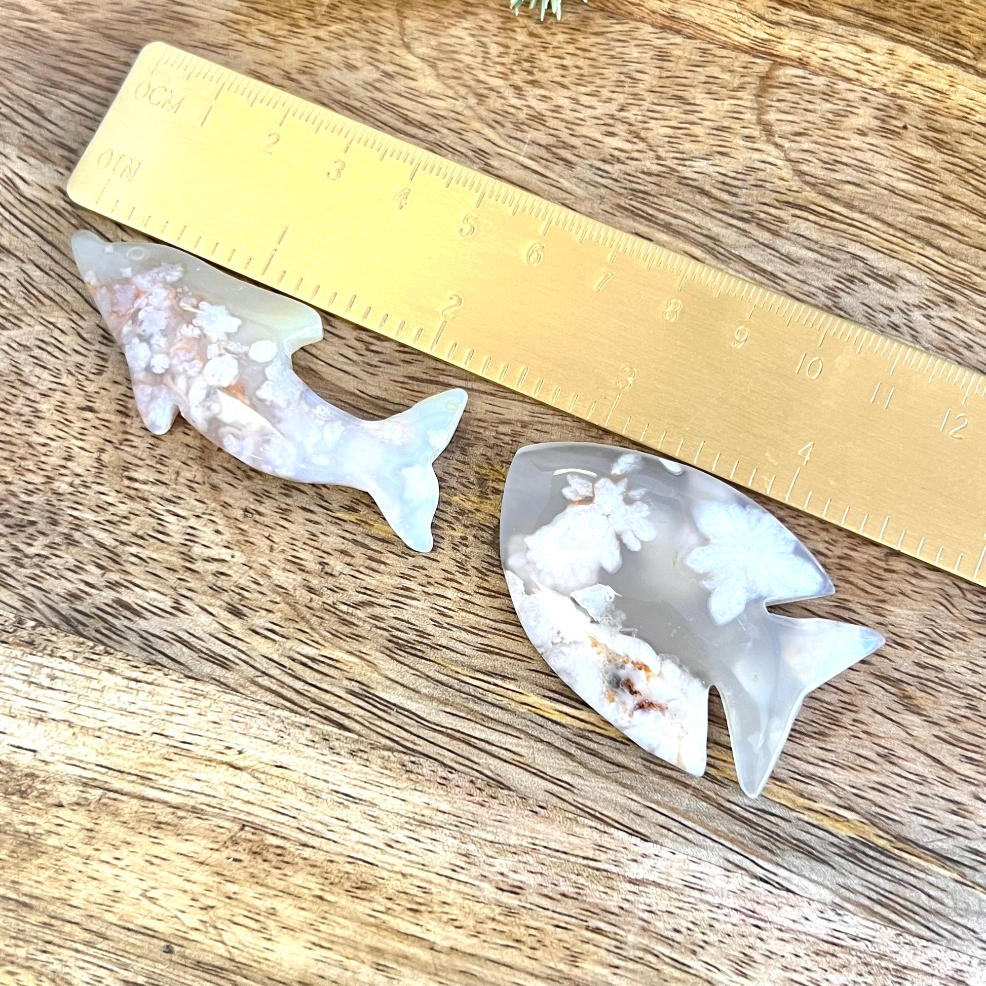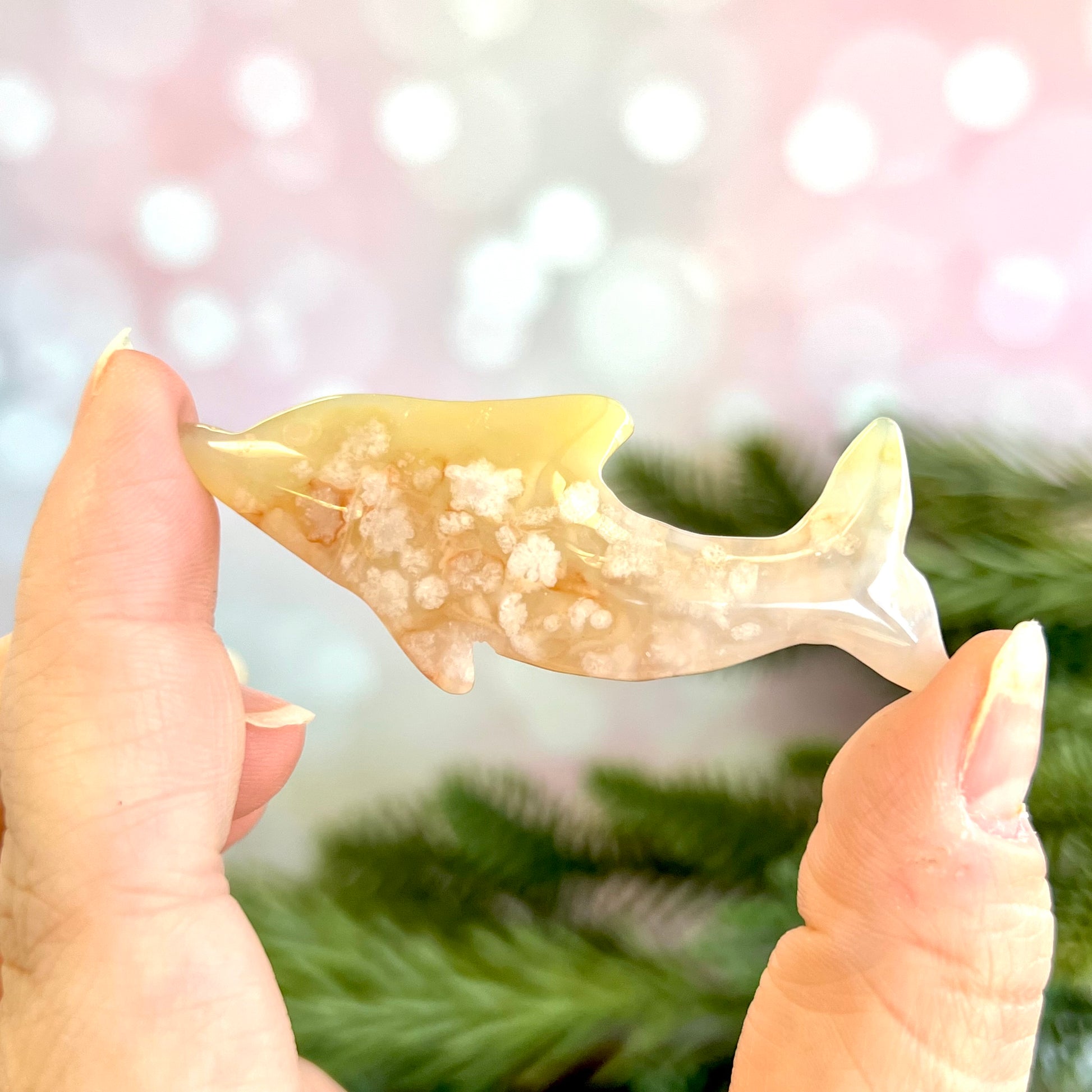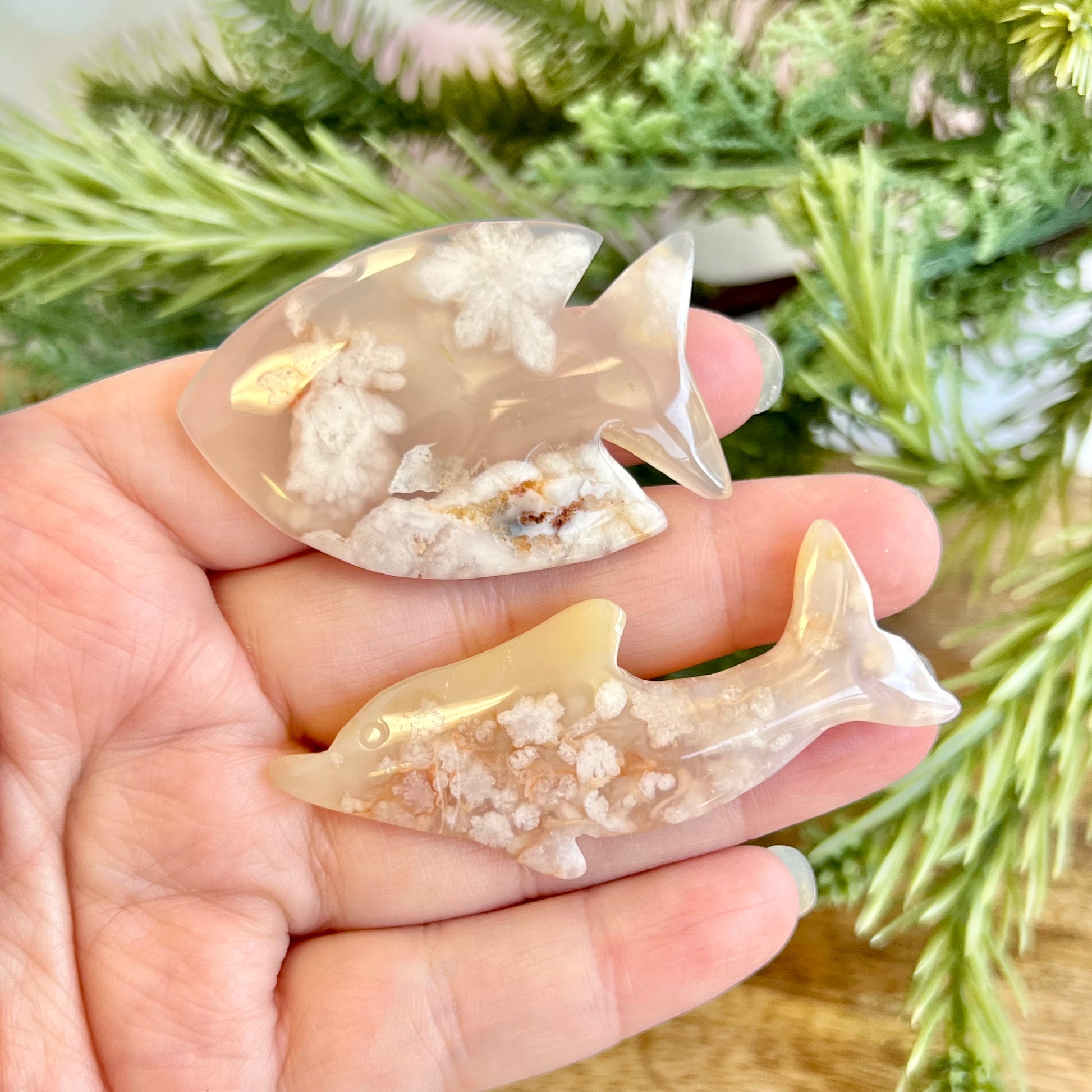 Enhance your spiritual practices with this beautiful Flower Agate carved stone cabochon. This crystal features a detailed carving of a dolphin. It has beautiful blossoms and cute details in a playful shape.