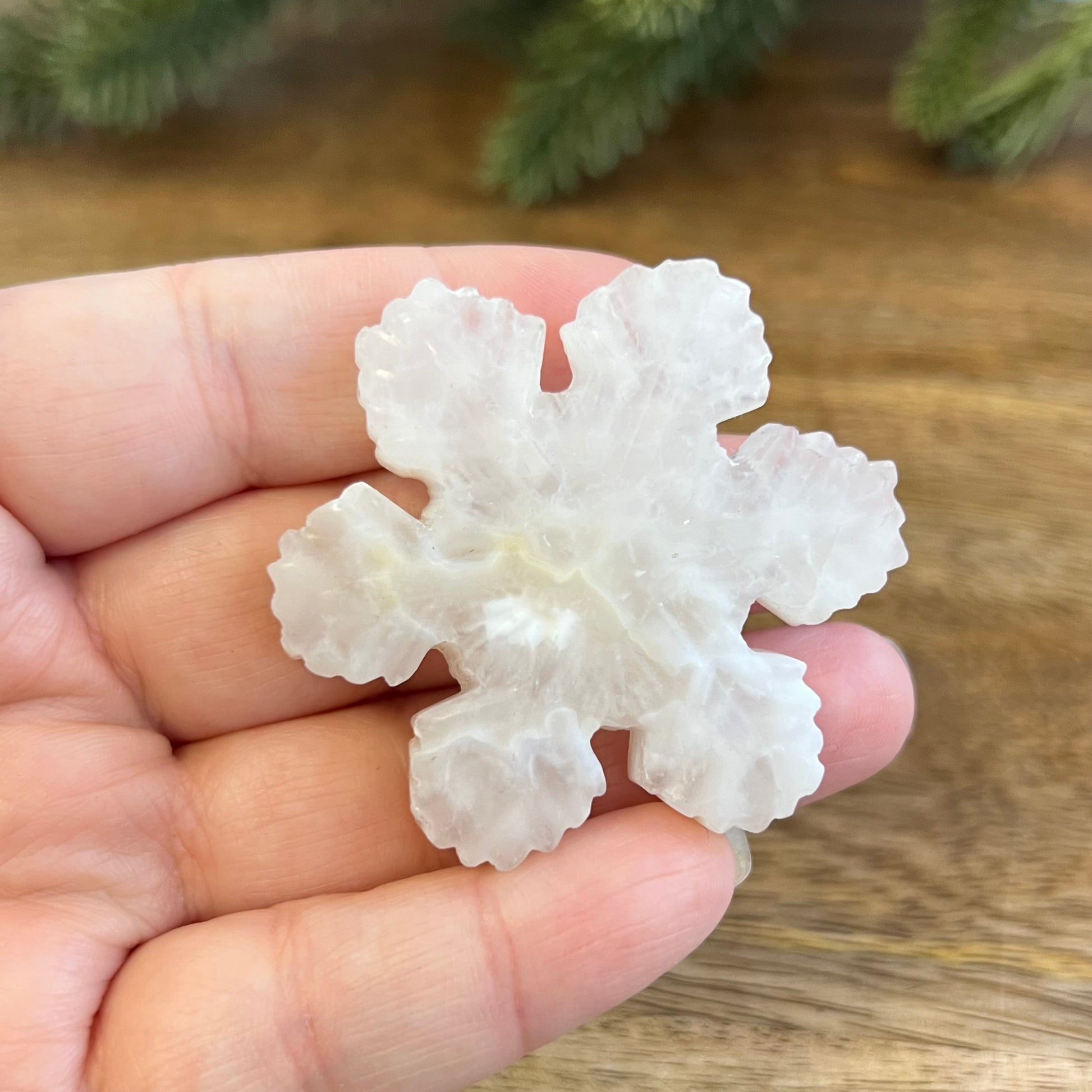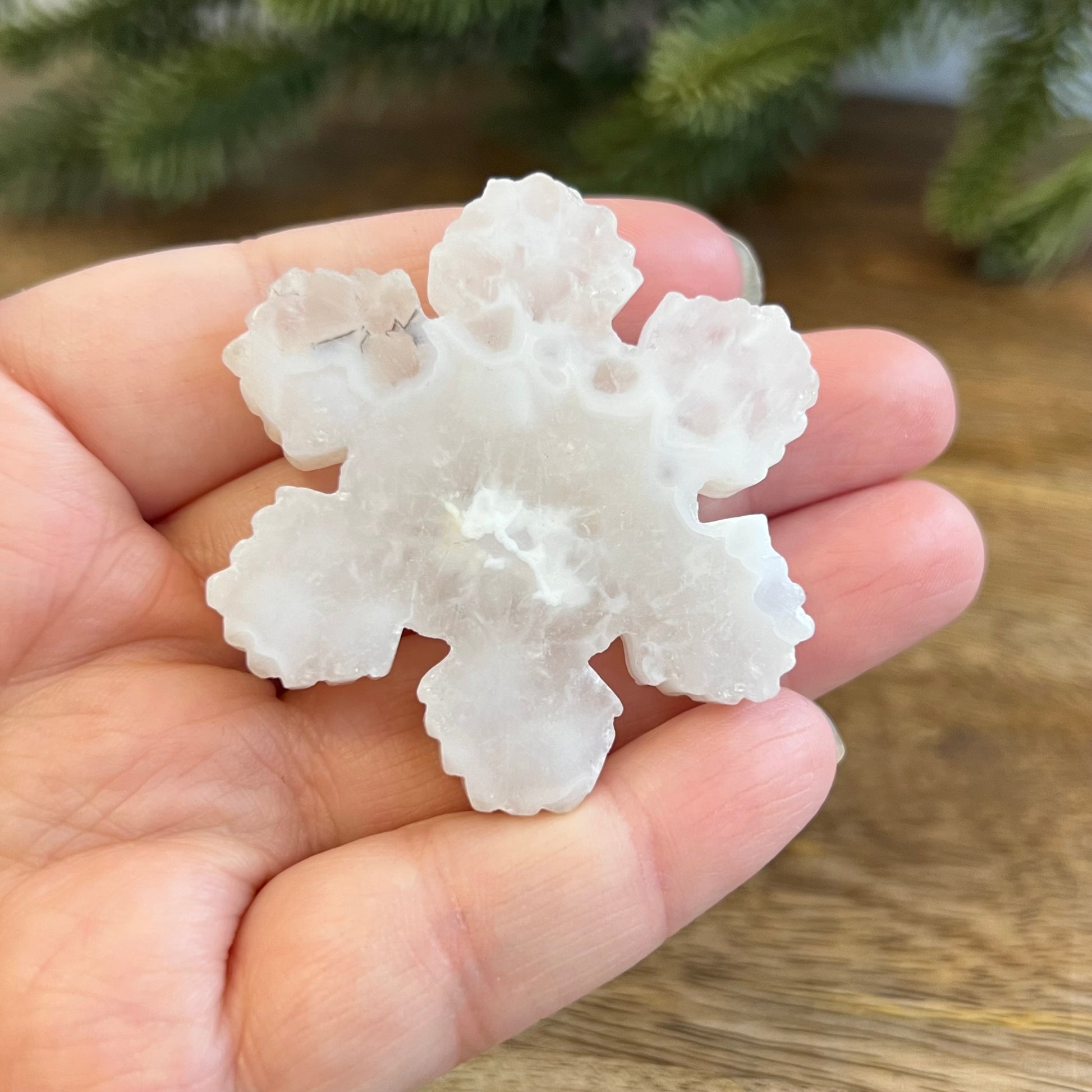 Enhance your spiritual practices with this natural Flower Agate crystal carved stone cabochon. It's been intricately carved into a beautiful snowflake. Perfect for those cozy winter vibes, or to carry as an Amulet for good luck with weather