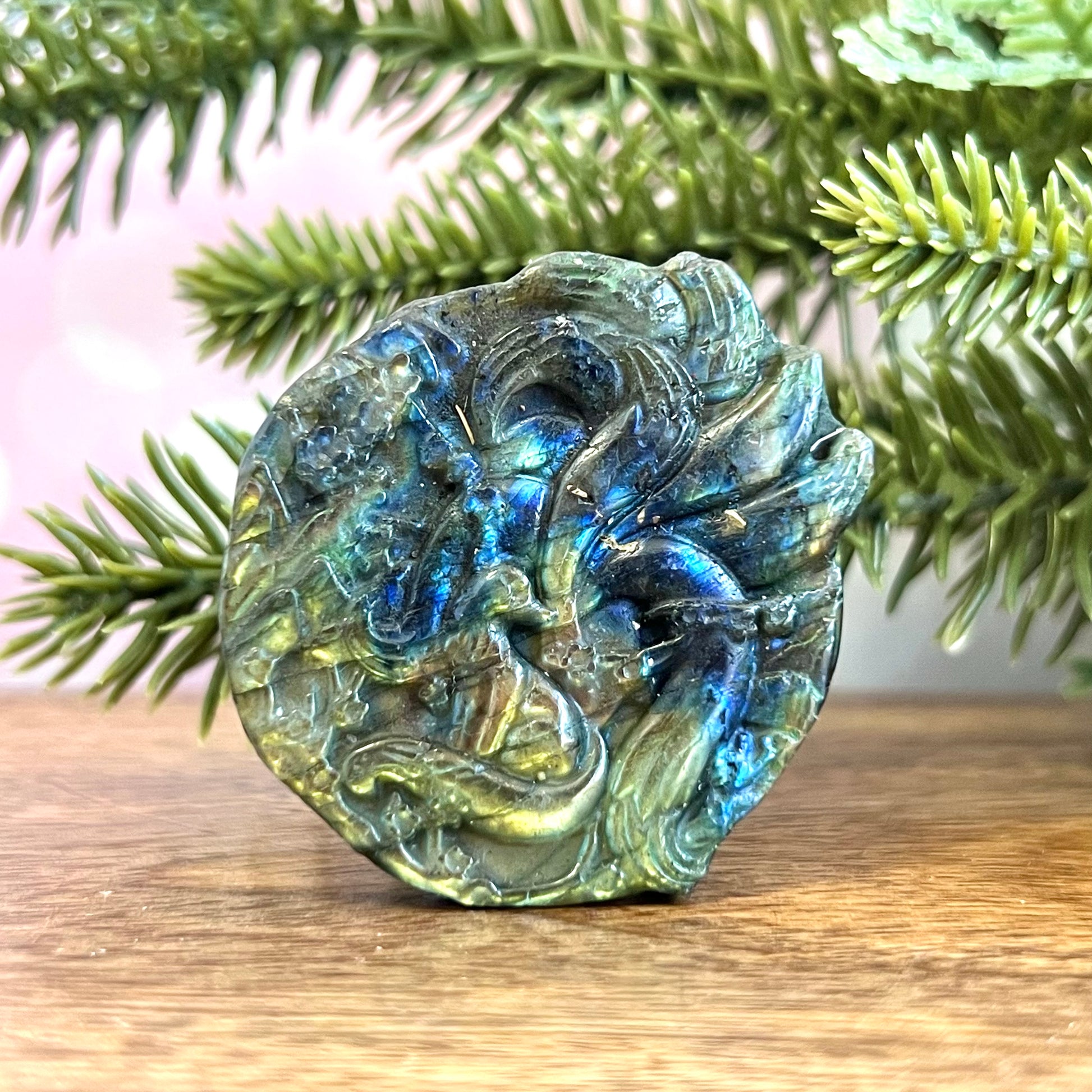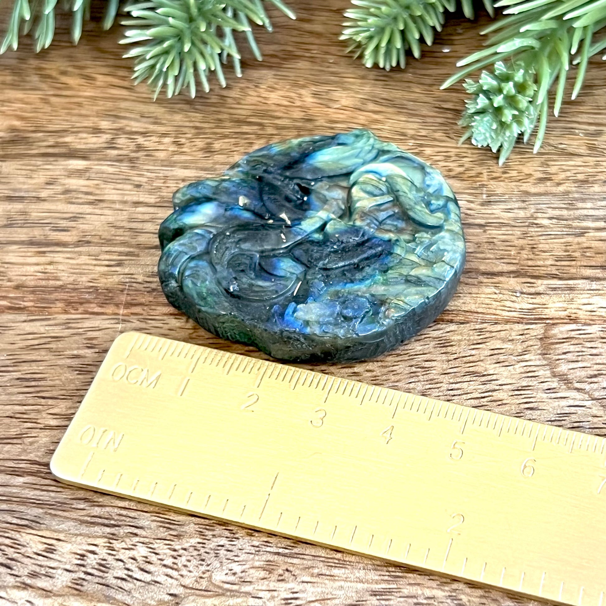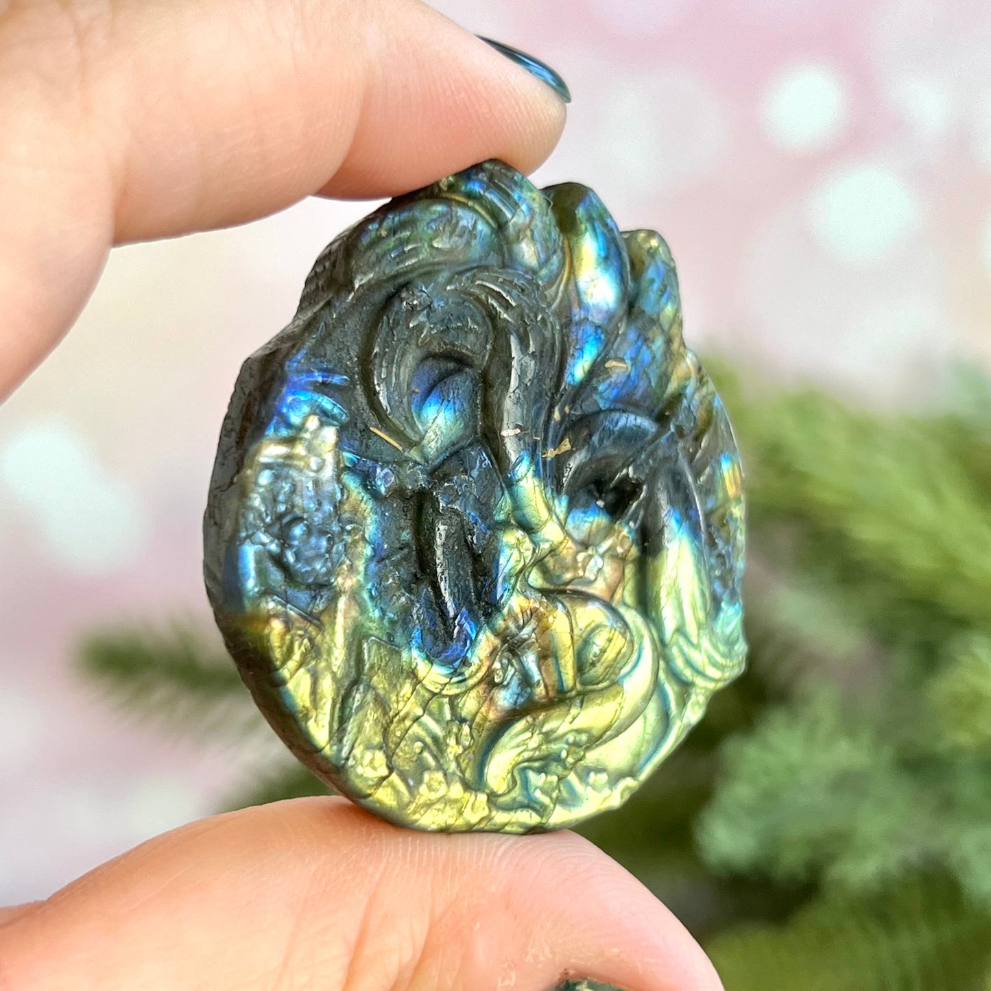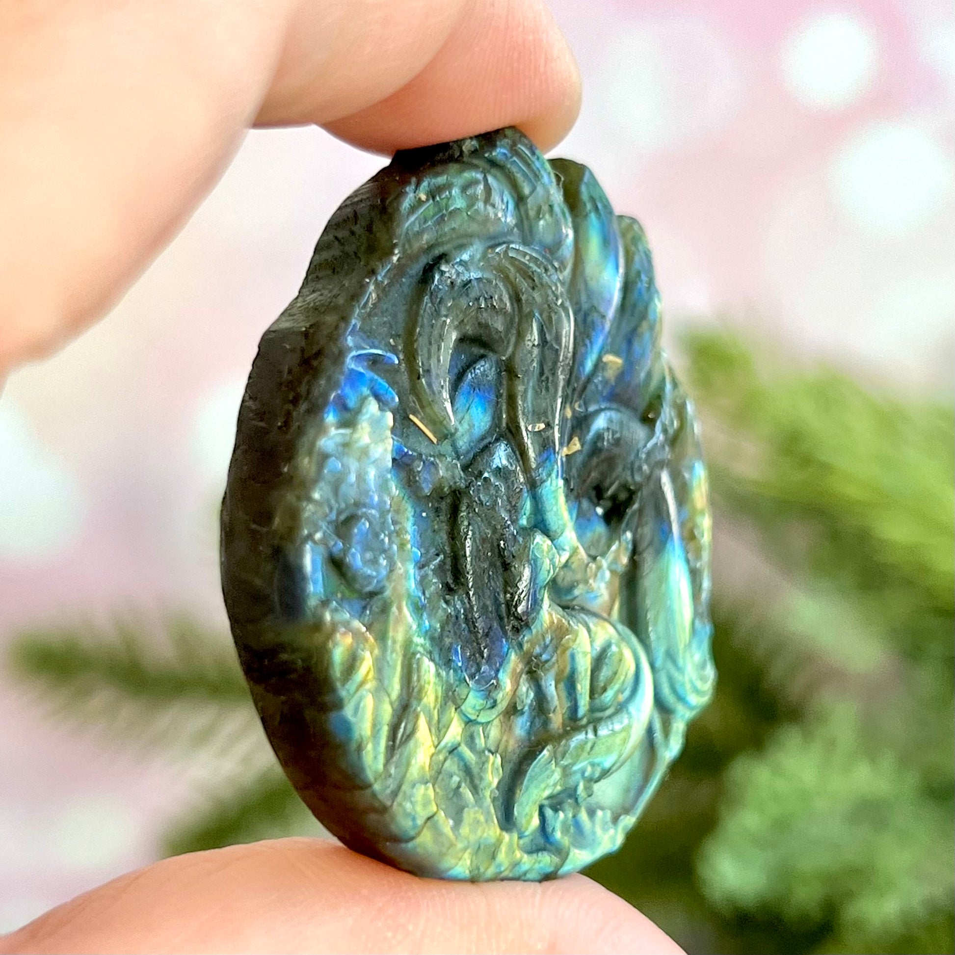 Enhance your spiritual practices with this beautiful flashy Labradorite carved stone cabochon. This crystal has been intricately carved into a Kitsune, a mythological fox with nine tails from Japanese culture. Similar figures can be found in other Asian cultures. A trickster spirit, the Kitsune is also a symbol of intelligence, longevity, and good luck