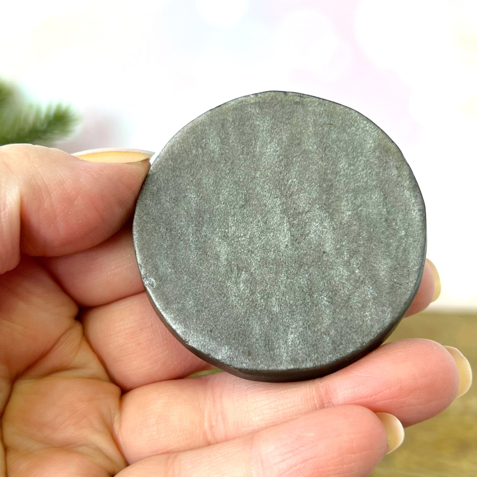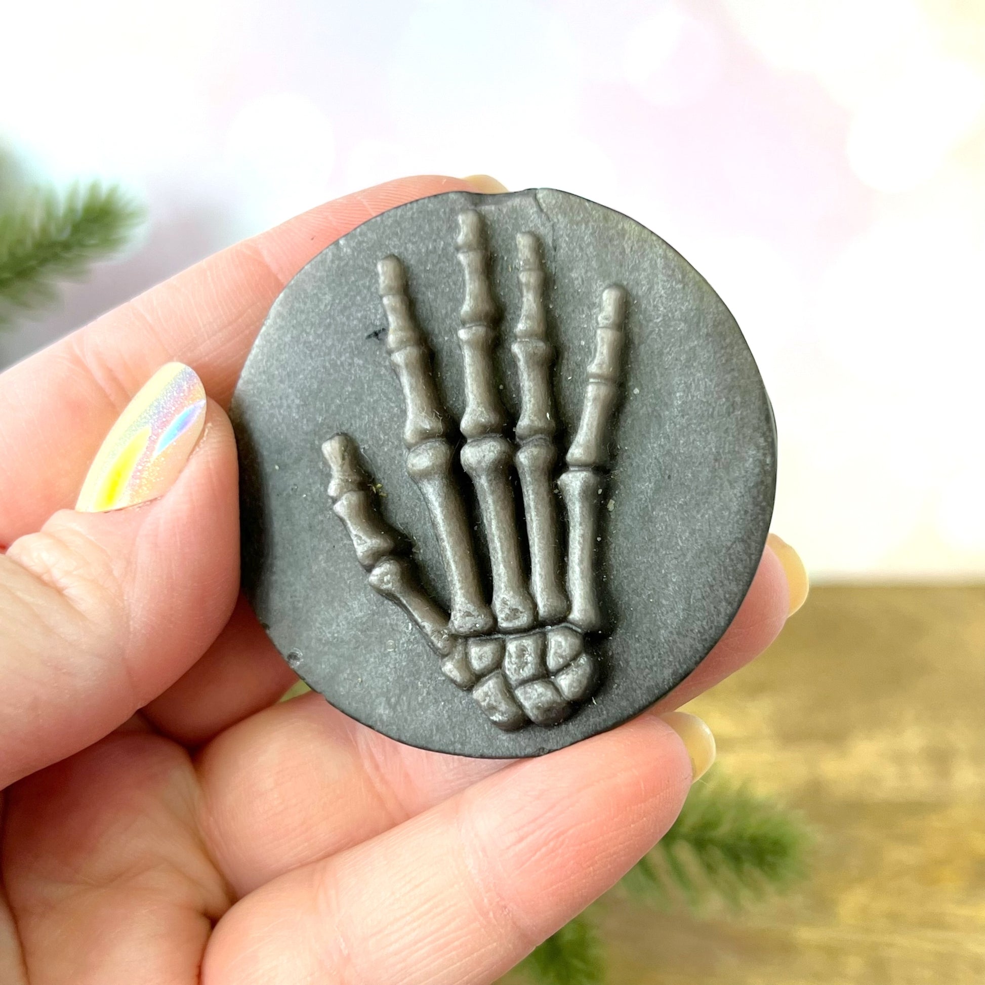 Enhance your spiritual practices with this beautiful Silver Sheen Obsidian carved stone cabochon. This crystal features a detailed skeletal hand on a round circle. There's a small Chip near the tip of one finger.