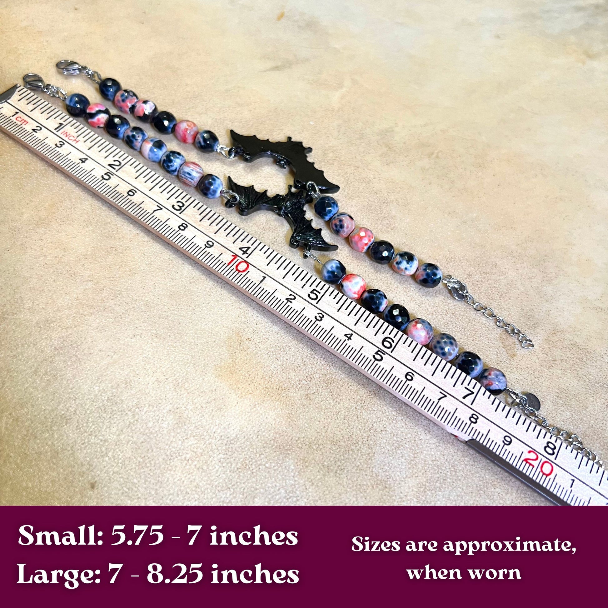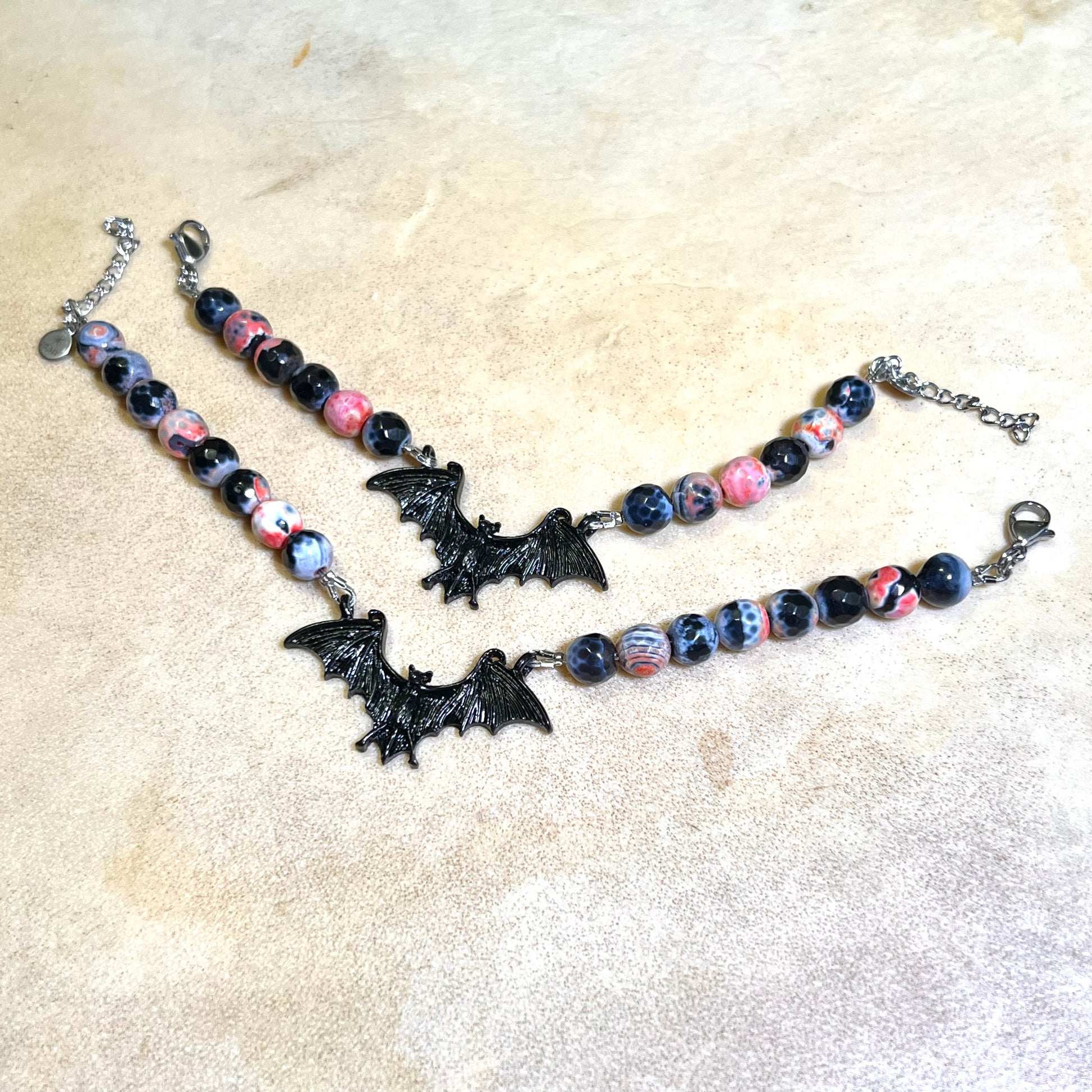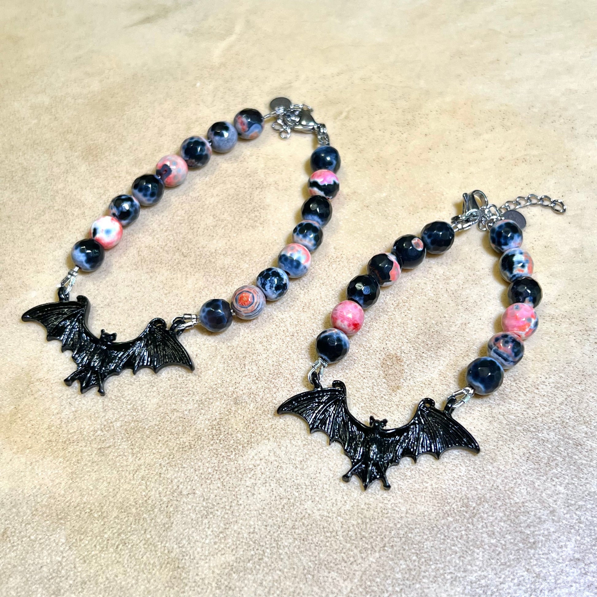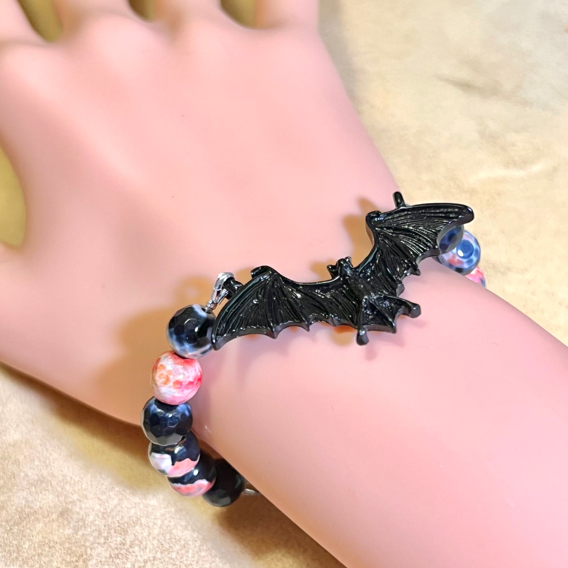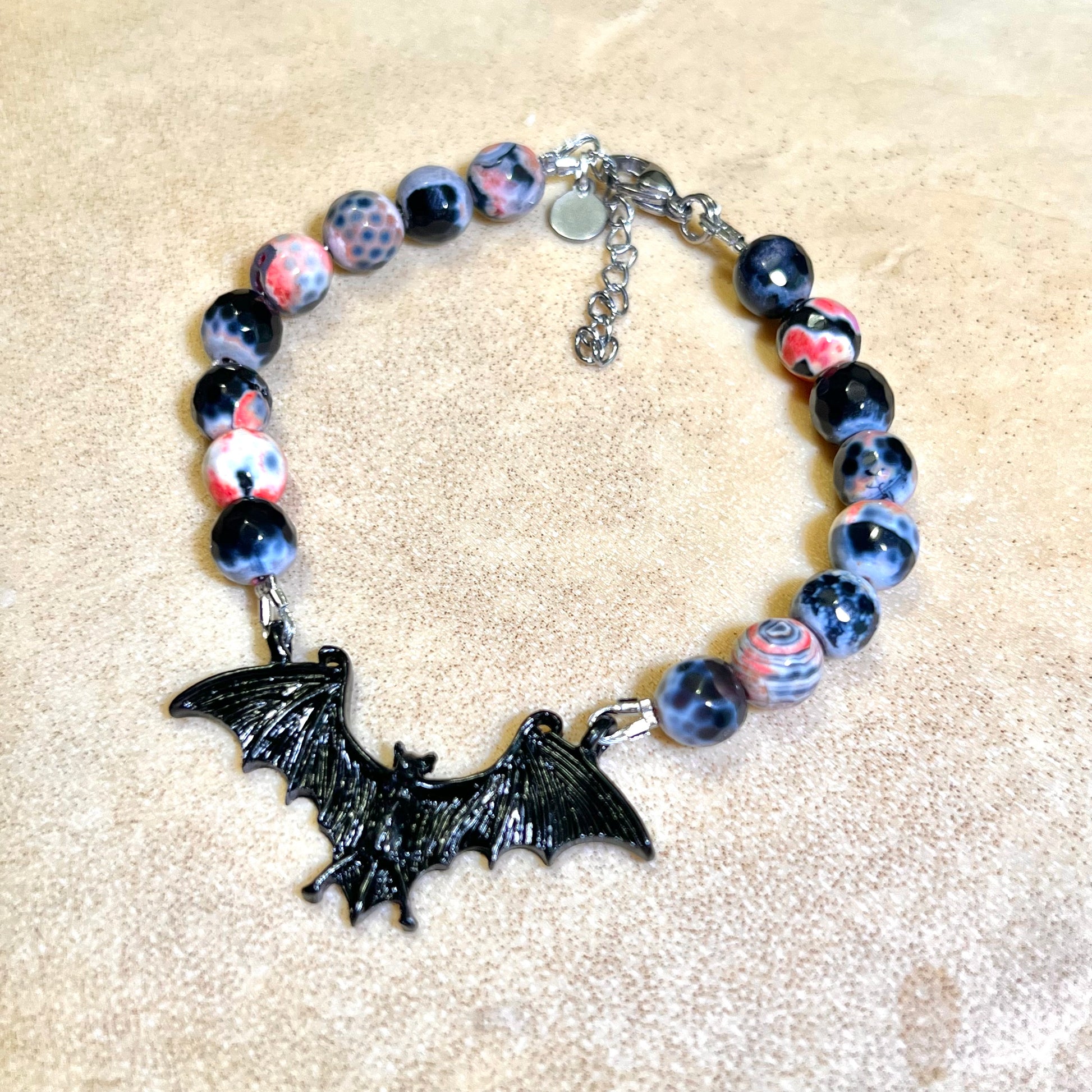 Let your spooky out all year long with this gorgeous Silver tone bracelet! Featuring a highly detailed black bat charm; orange & black dyed Agate Beads; and stainless steel adjustable chain.