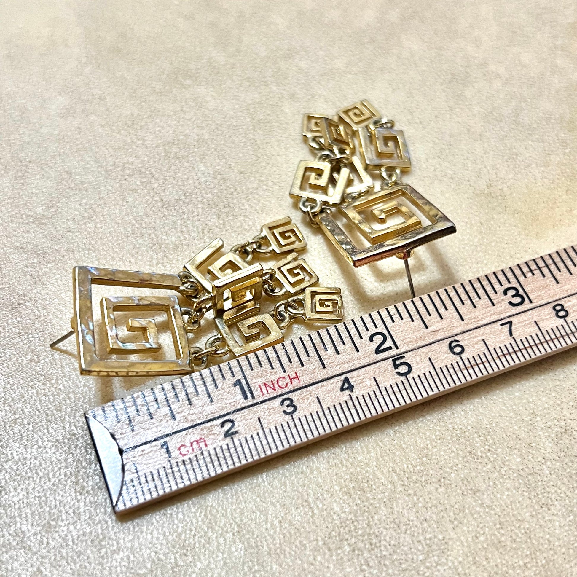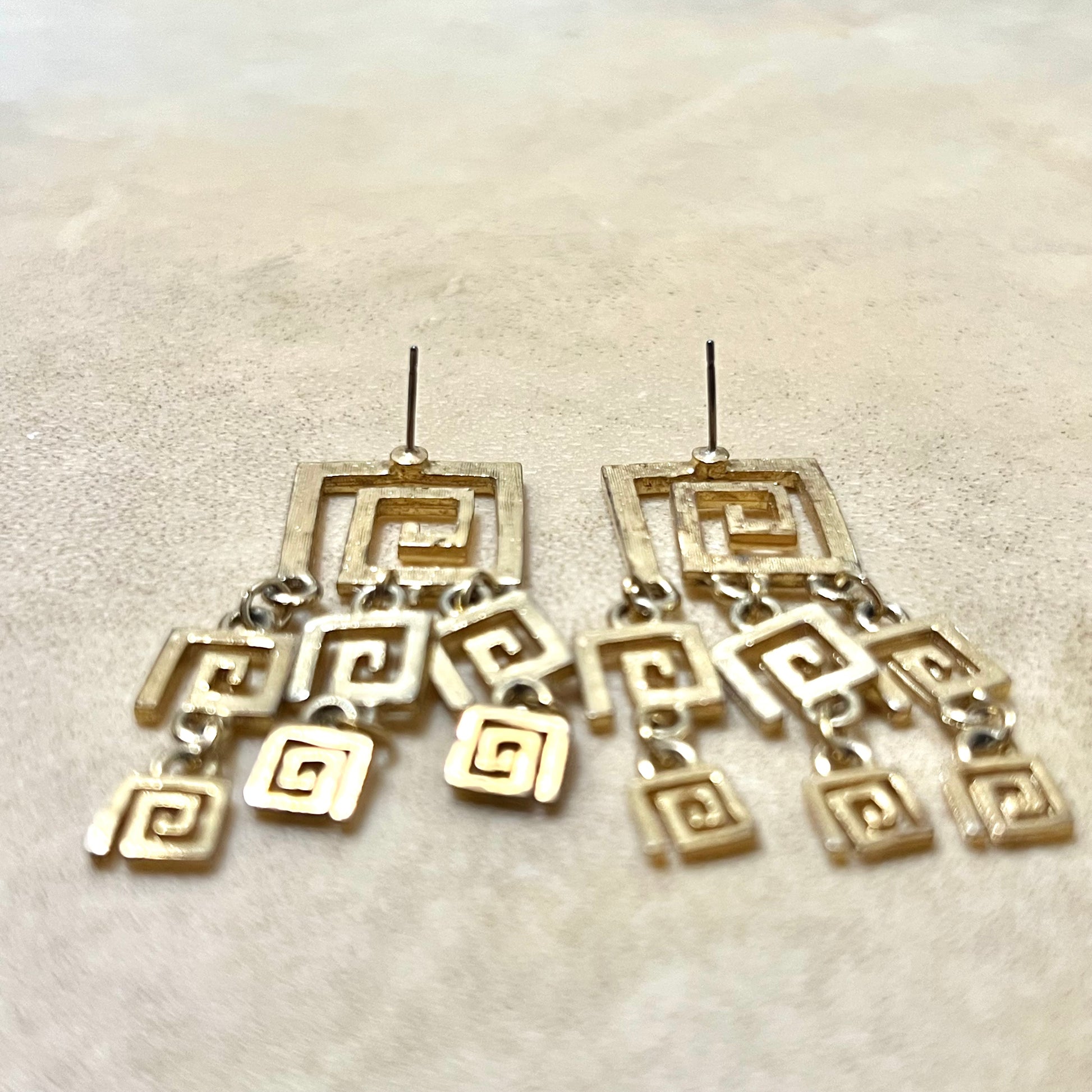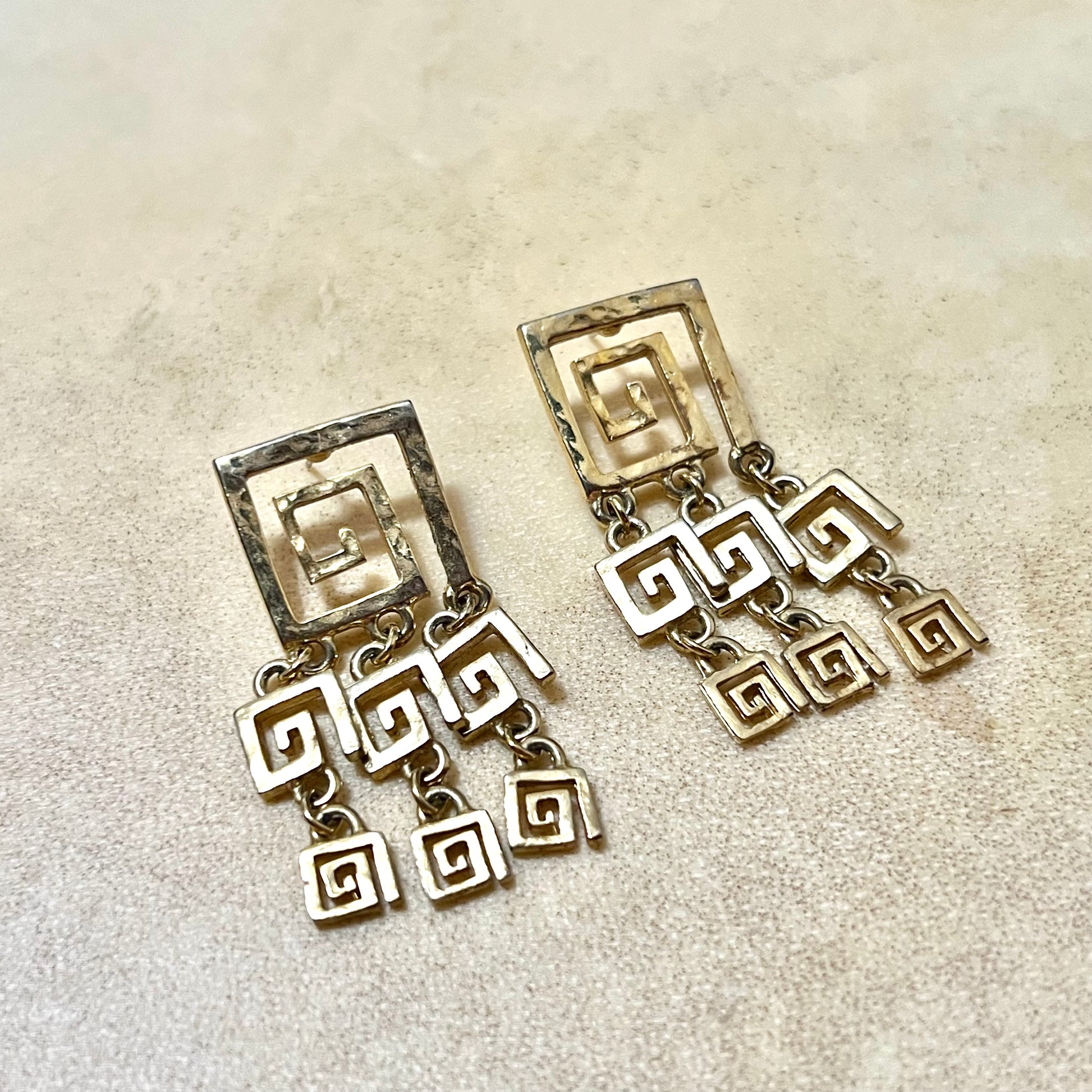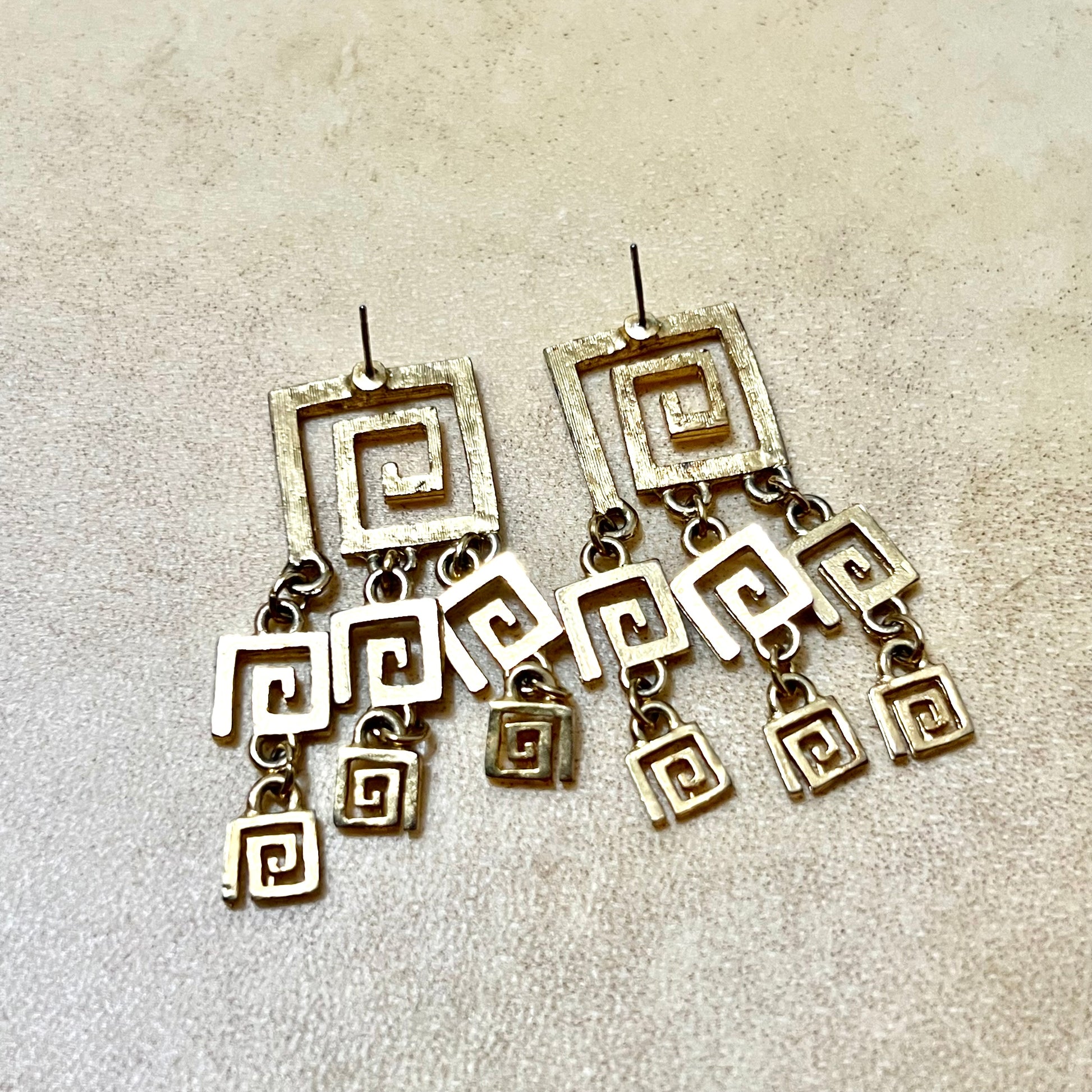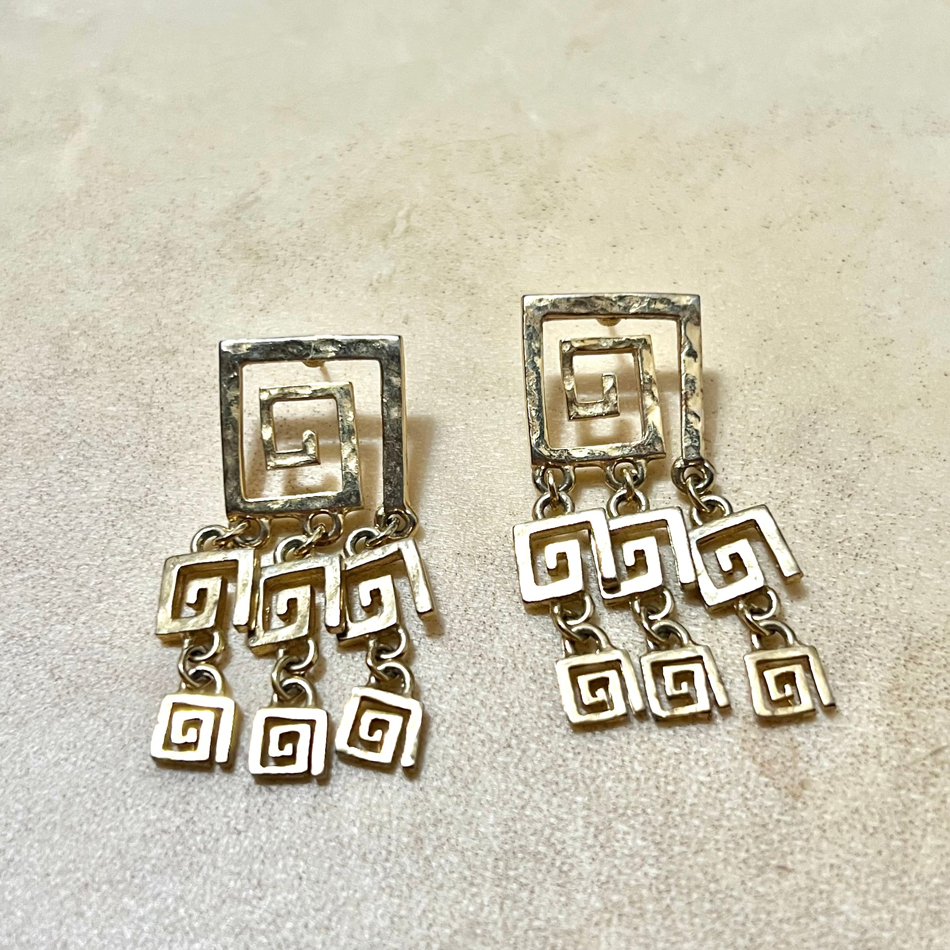 This beautiful pair of vintage gold tone earrings featuring a pierced stud back with dangling charms. This pattern is known as a Greek Meander, and is symbolic of the Labyrinth and inner journeys. Missing their original stoppers, but will include a new clear silicone pair (not shown).