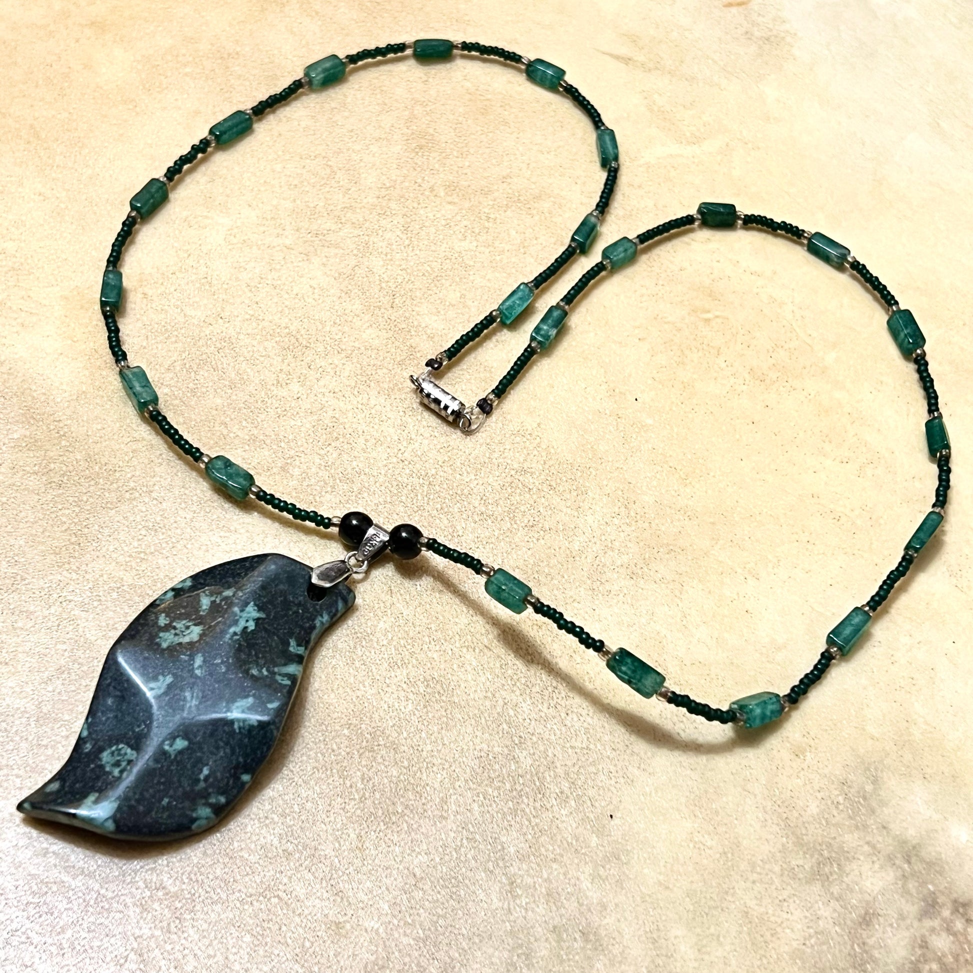 Beautiful vintage necklace featuring juicy Green Aventurine beads. The pendant is carved stone in black and green.