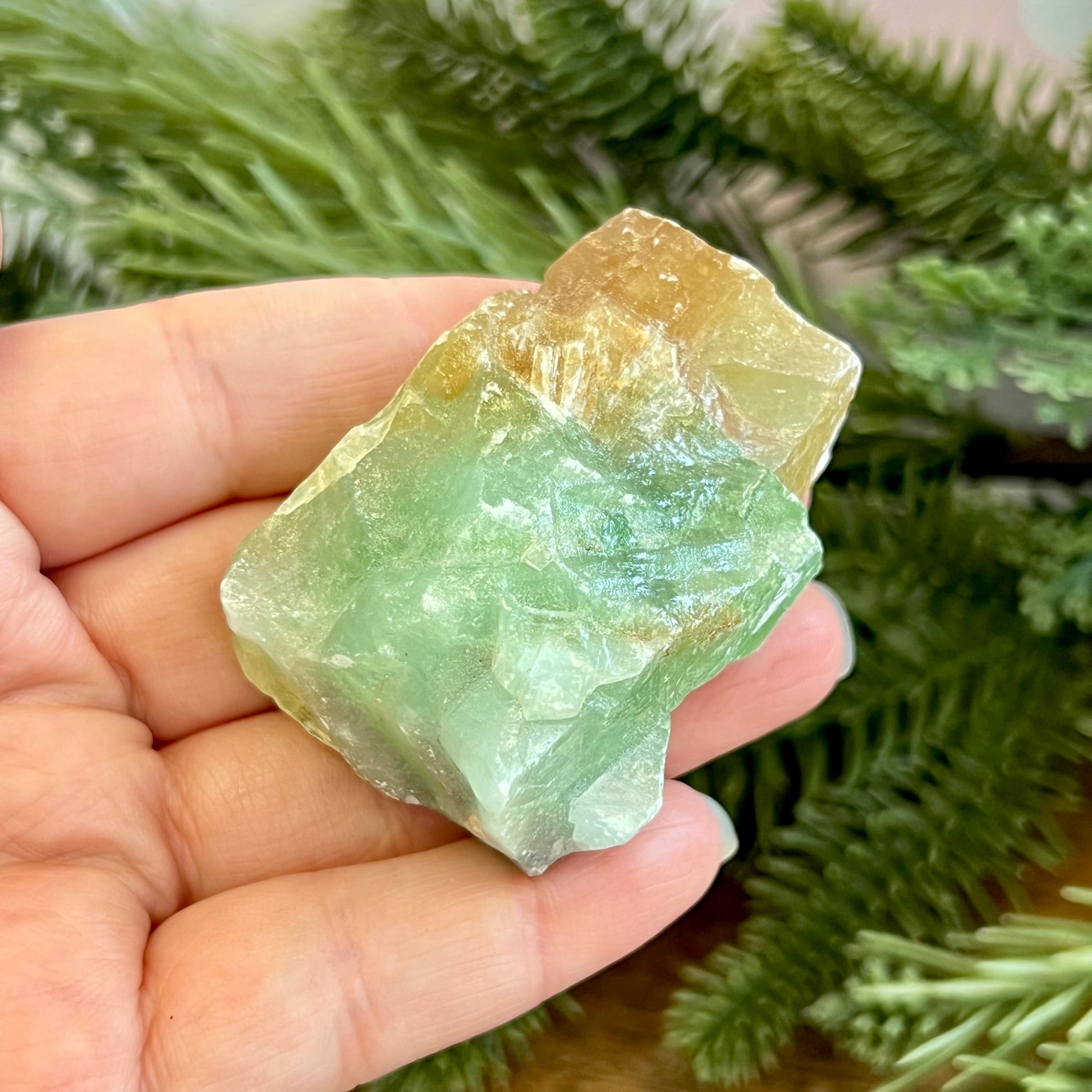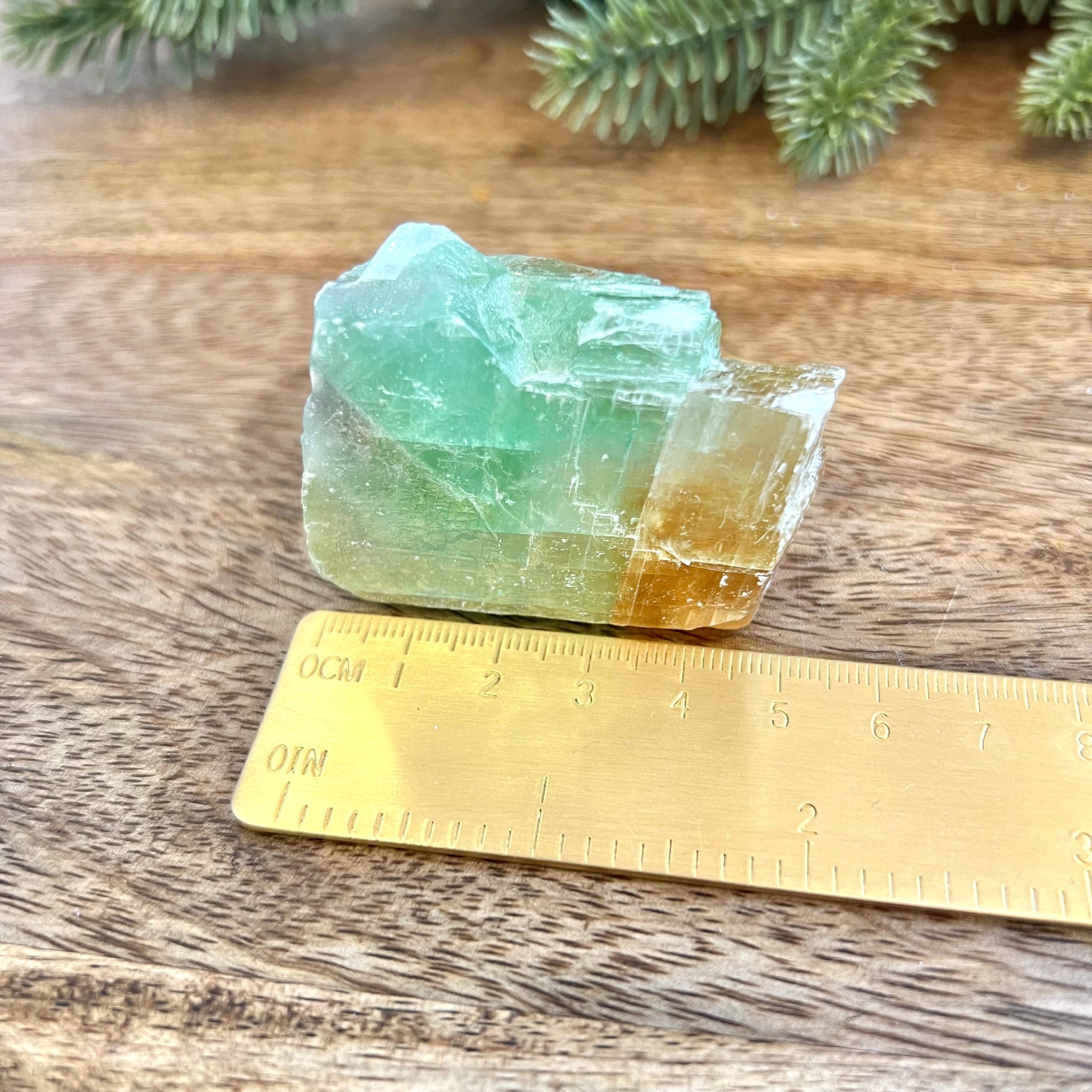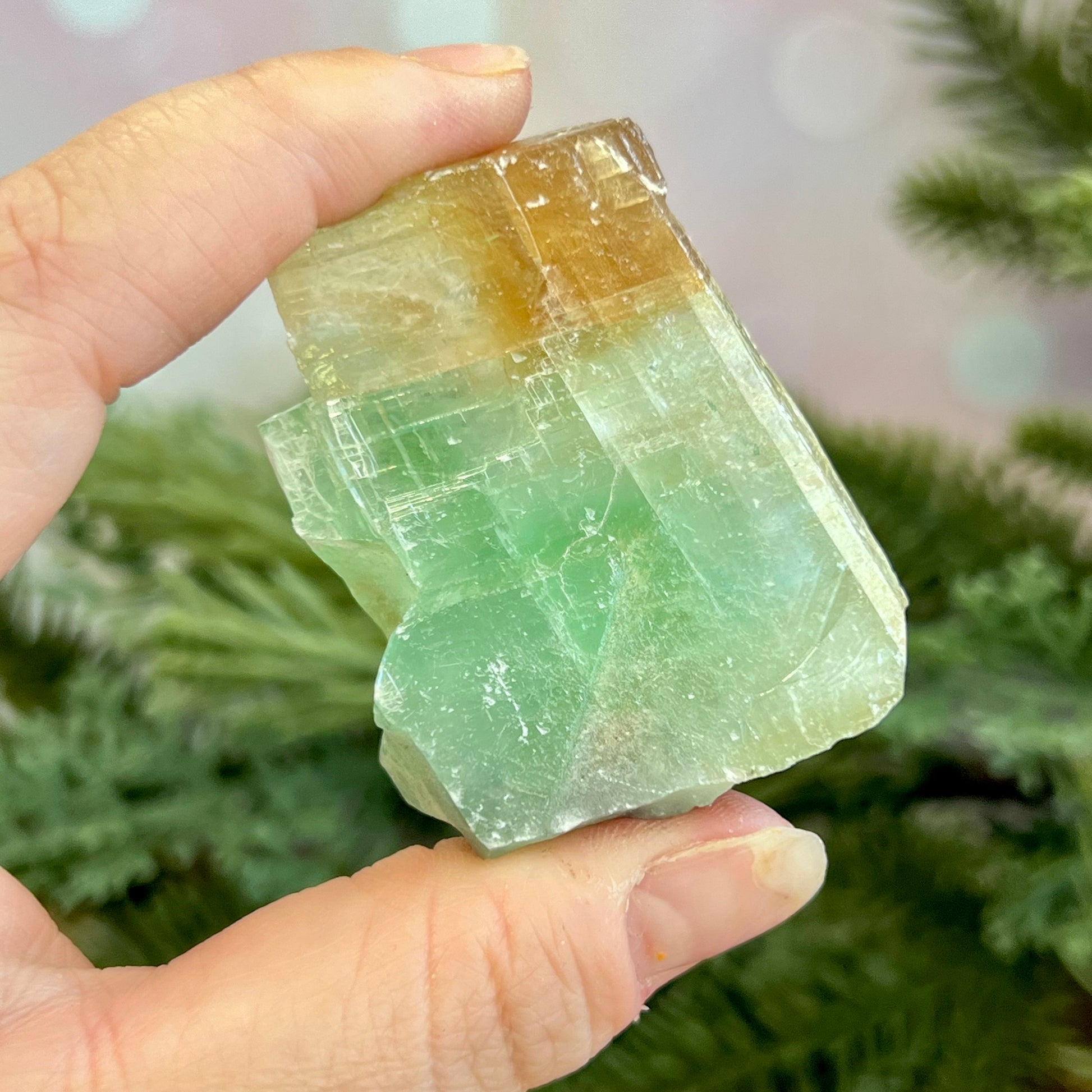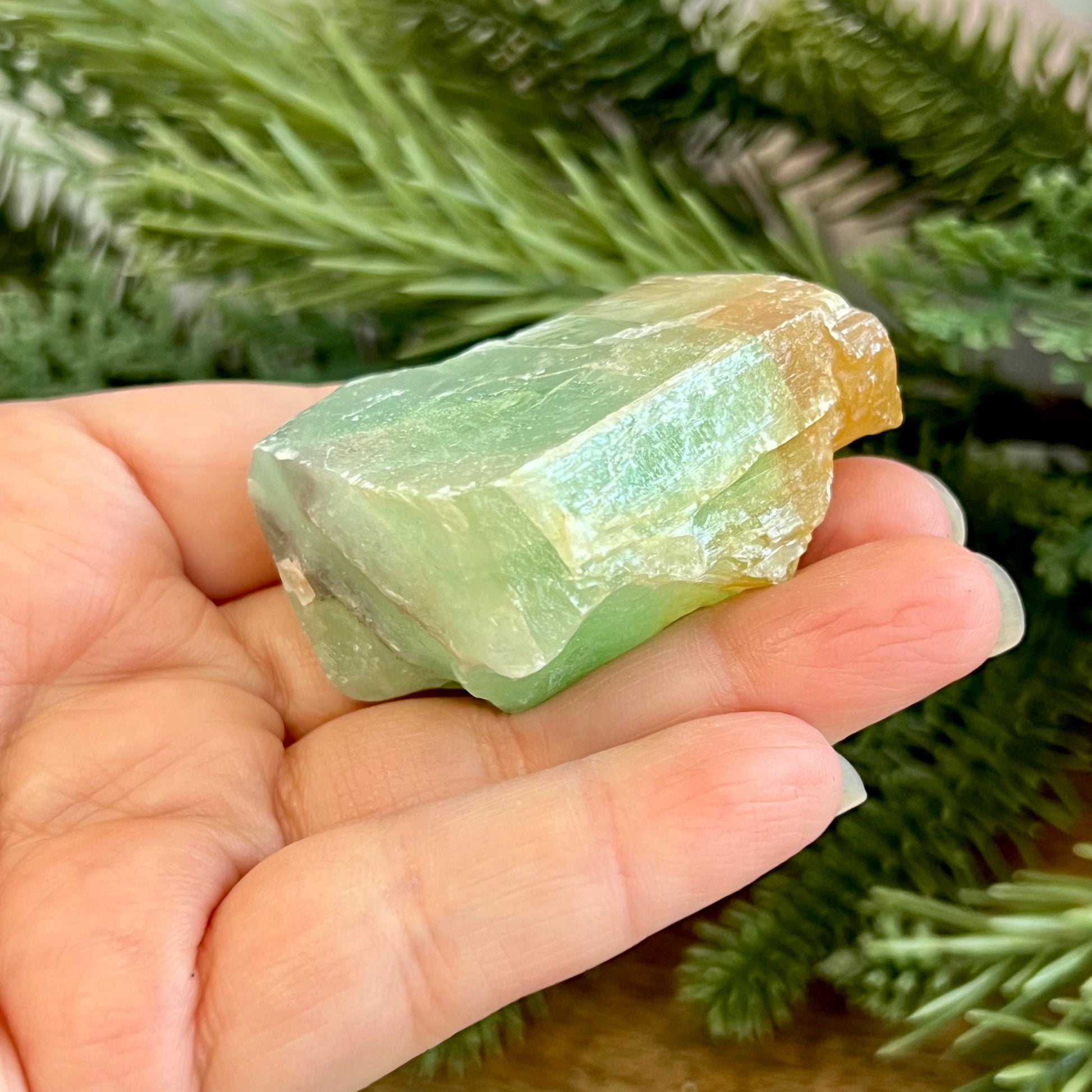Enhance your spiritual practices with this beautiful Calcite natural gemstone specimen. This crystal features a slightly translucent spring Green with yellow accents. Natural and raw.
