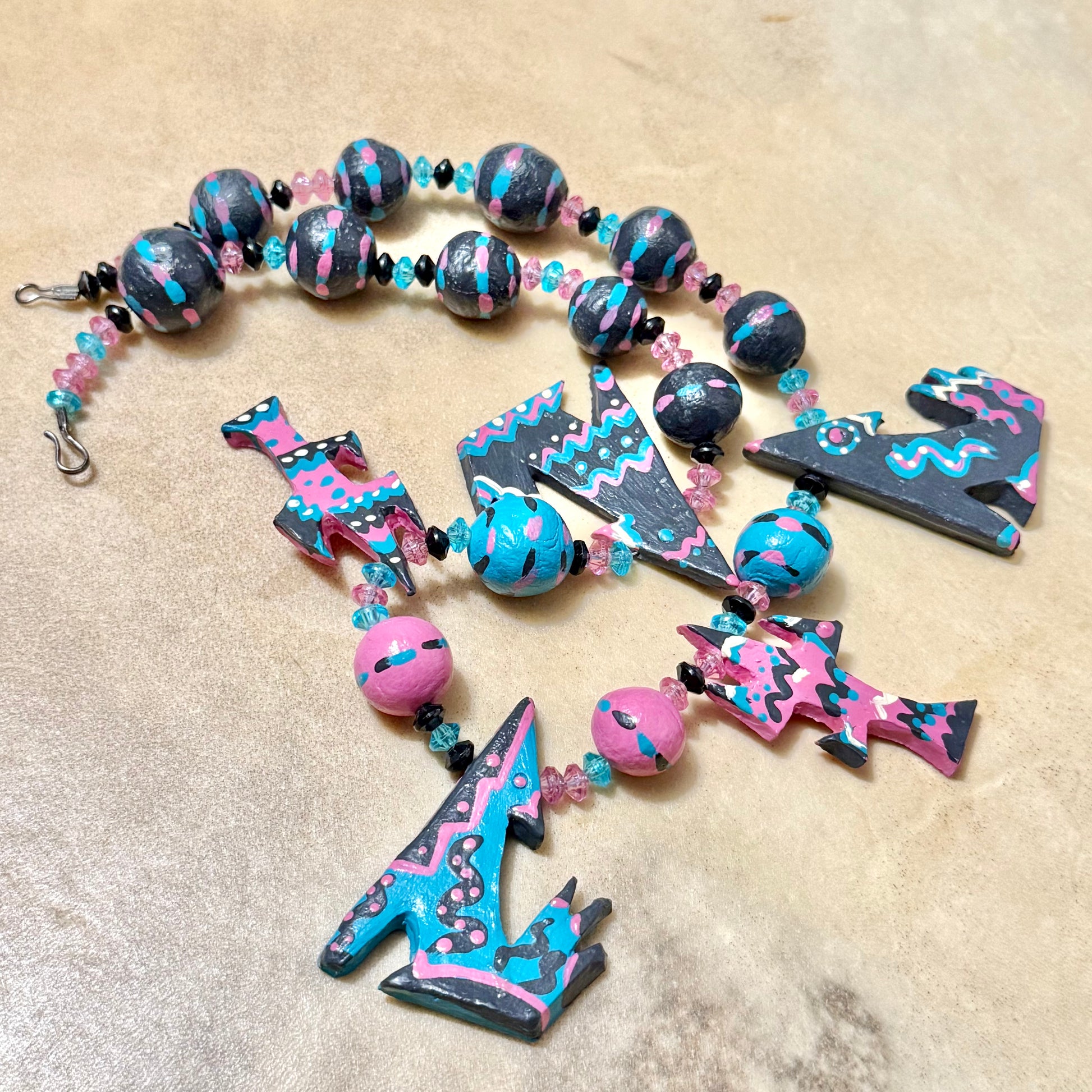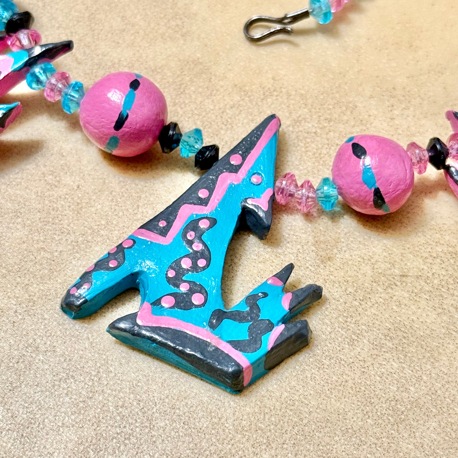 This necklace is super unique! Featuring multiple coyotes and cacti painted in turquoise, hot pink, and black.
