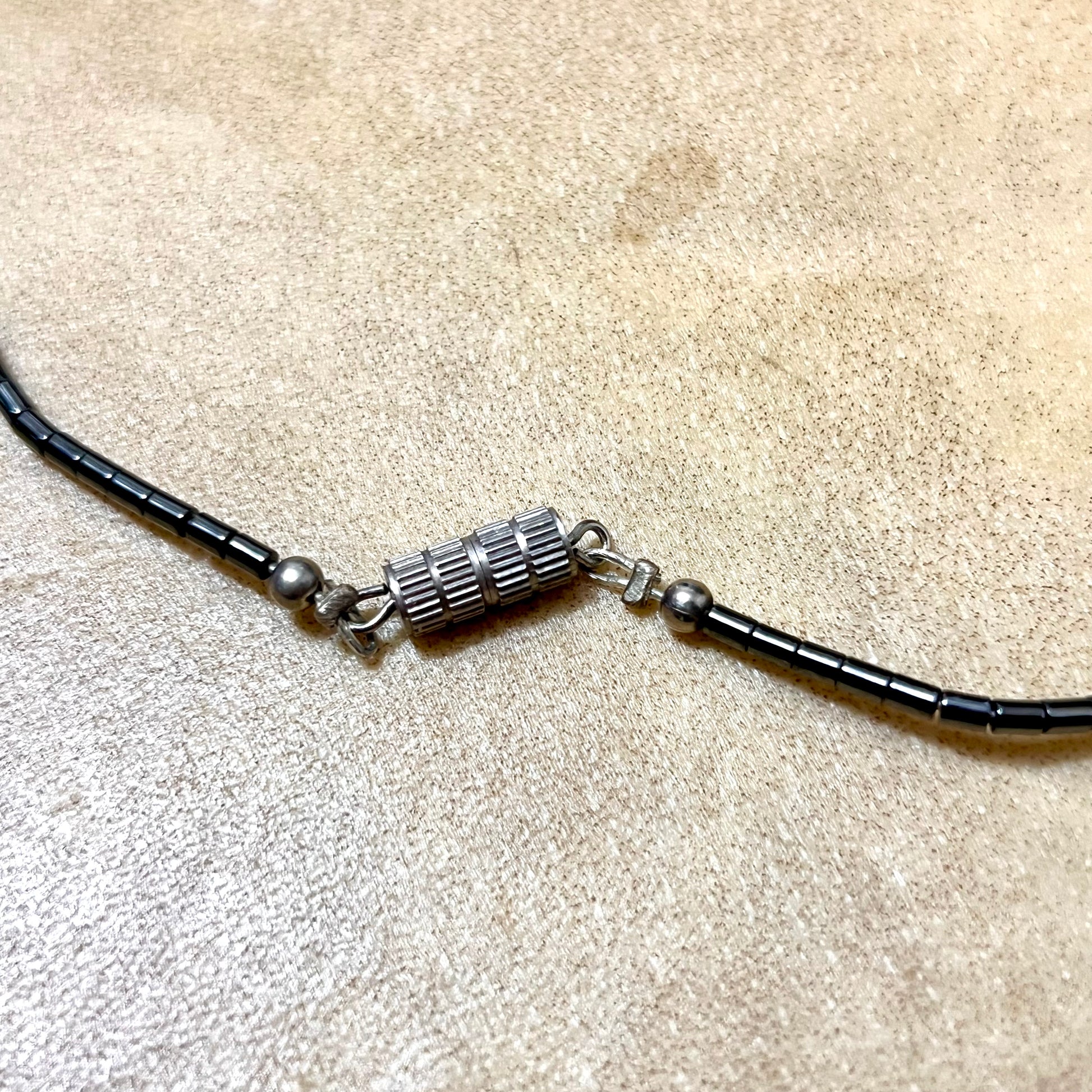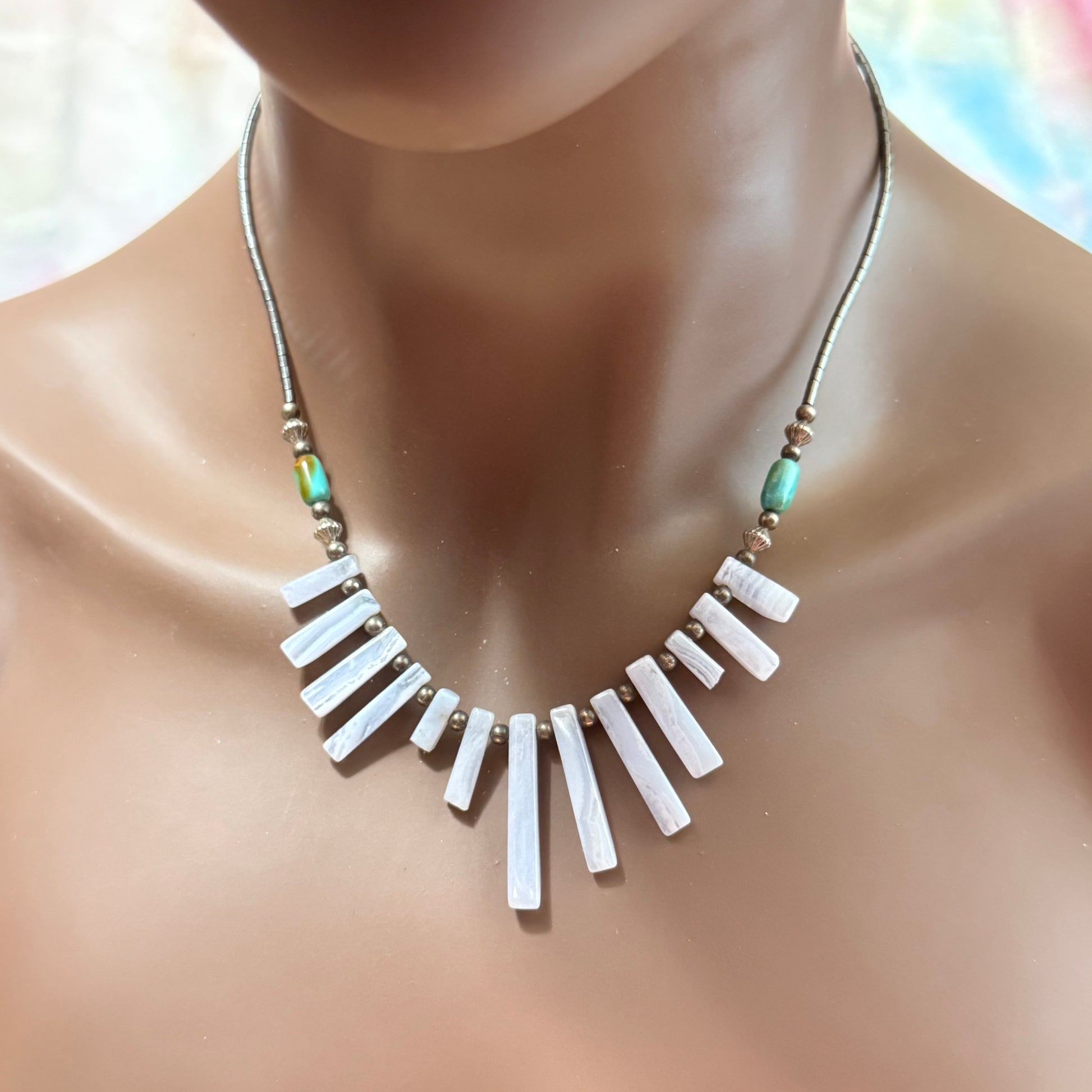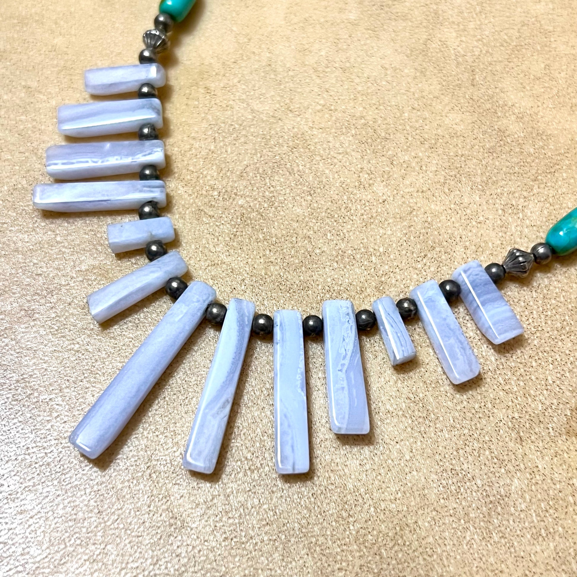 Earthy styled necklace featuring Hematite and Blue Lace Agate beads in the shape of a graduated fan. Native American style, with turquoise colored accents
