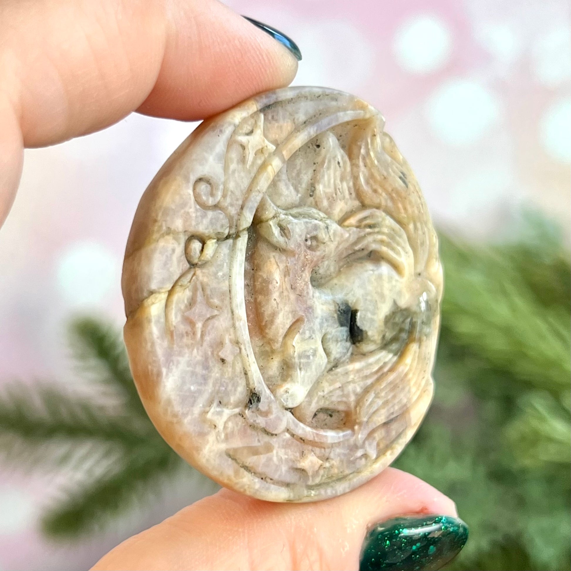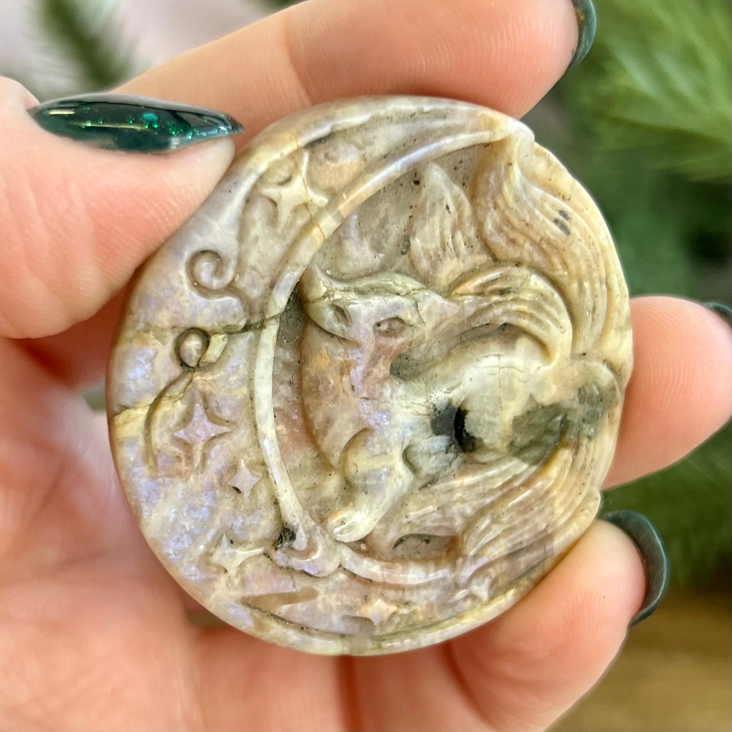Enhance your spiritual practices with this beautiful Belomorite (Sunstone in Moonstone) carved stone cabochon. This crystal has been intricately carved into a Kitsune, a mythological fox with nine tails from Japanese culture. Similar figures can be found in other Asian cultures. A trickster spirit, the Kitsune is also a symbol of intelligence, longevity, and good luck