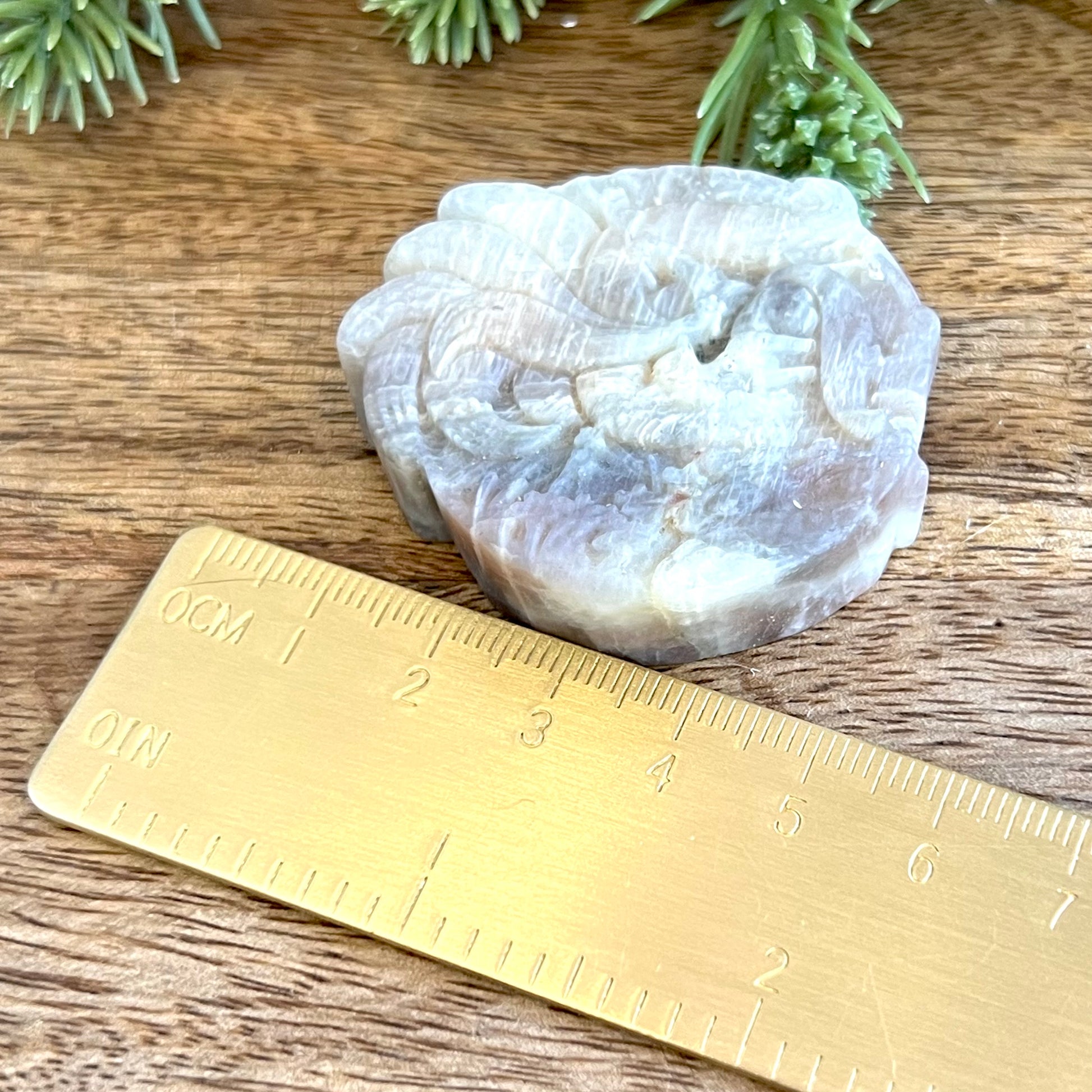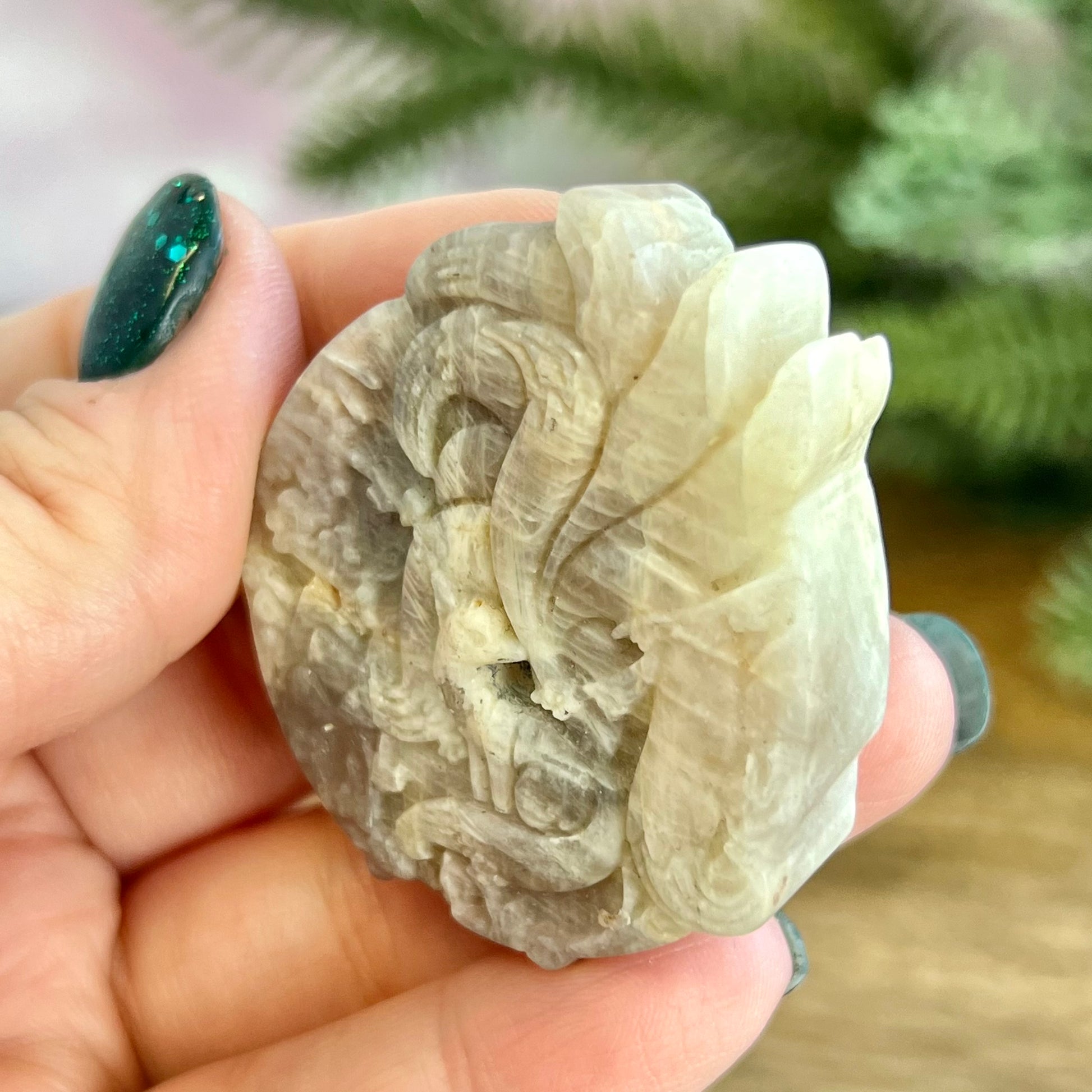 Enhance your spiritual practices with this beautiful Belomorite (Sunstone in Moonstone) carved stone cabochon. This crystal has been intricately carved into a Kitsune, a mythological fox with nine tails from Japanese culture. Similar figures can be found in other Asian cultures. A trickster spirit, the Kitsune is also a symbol of intelligence, longevity, and good luck