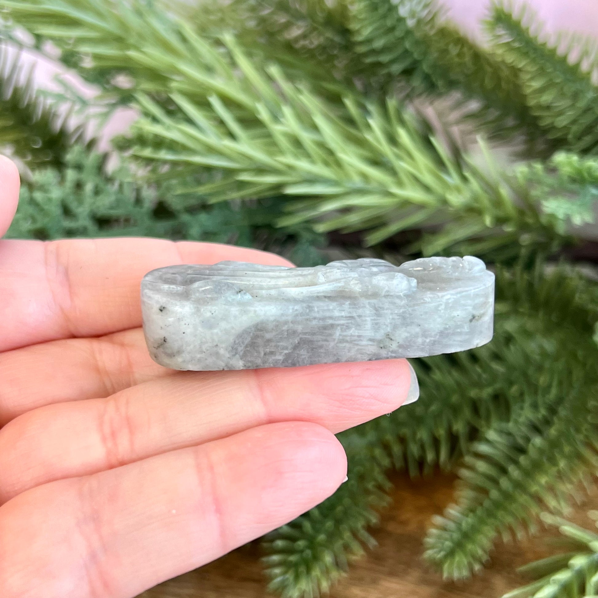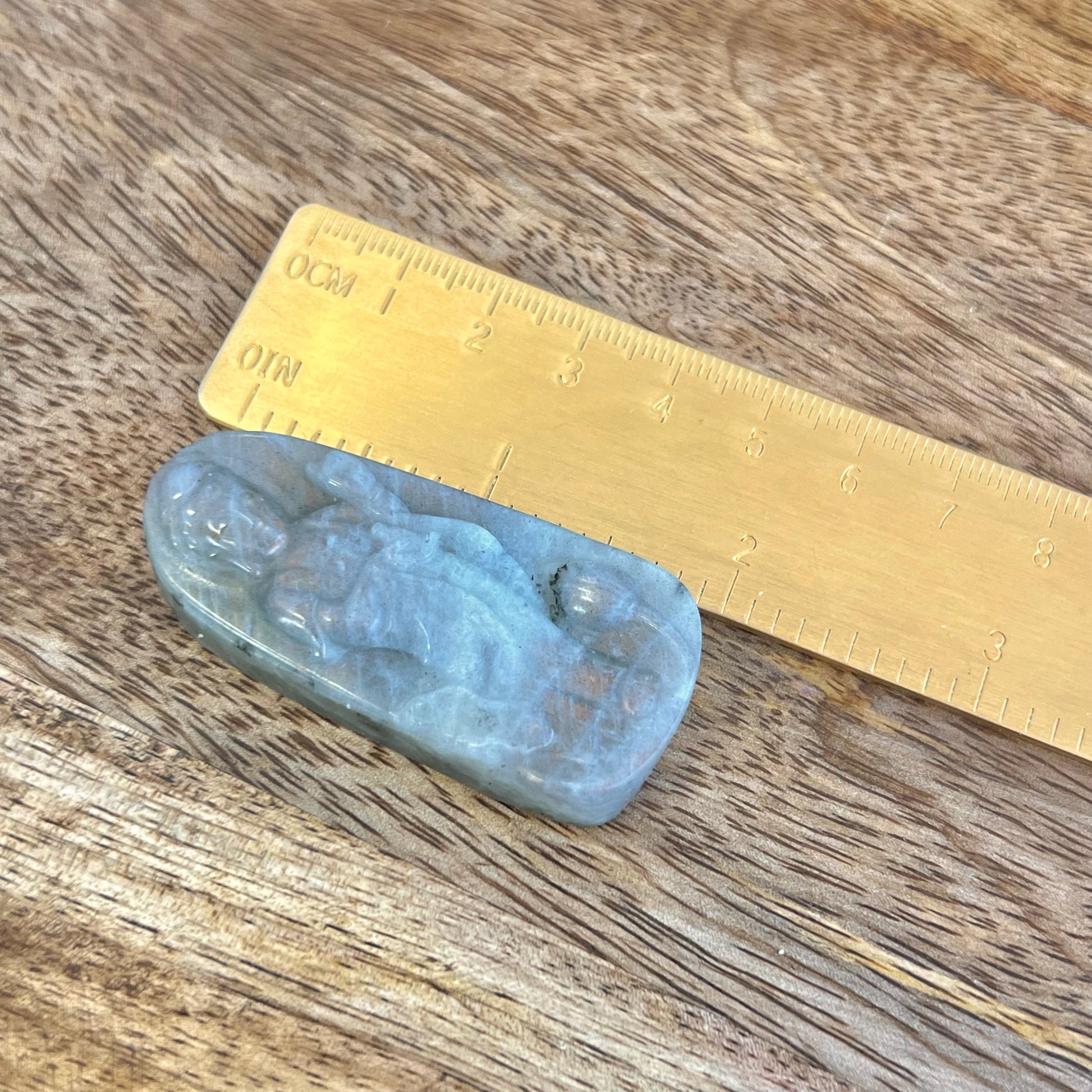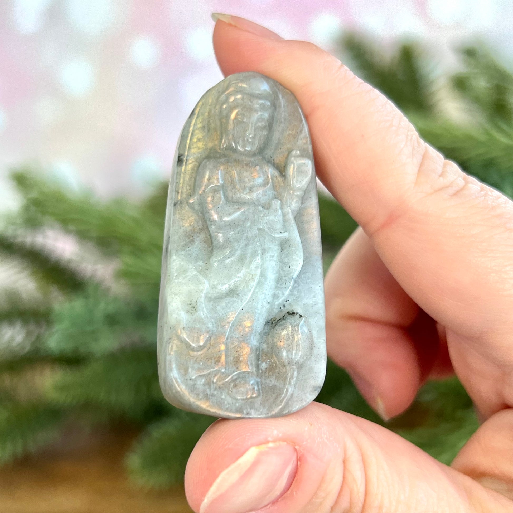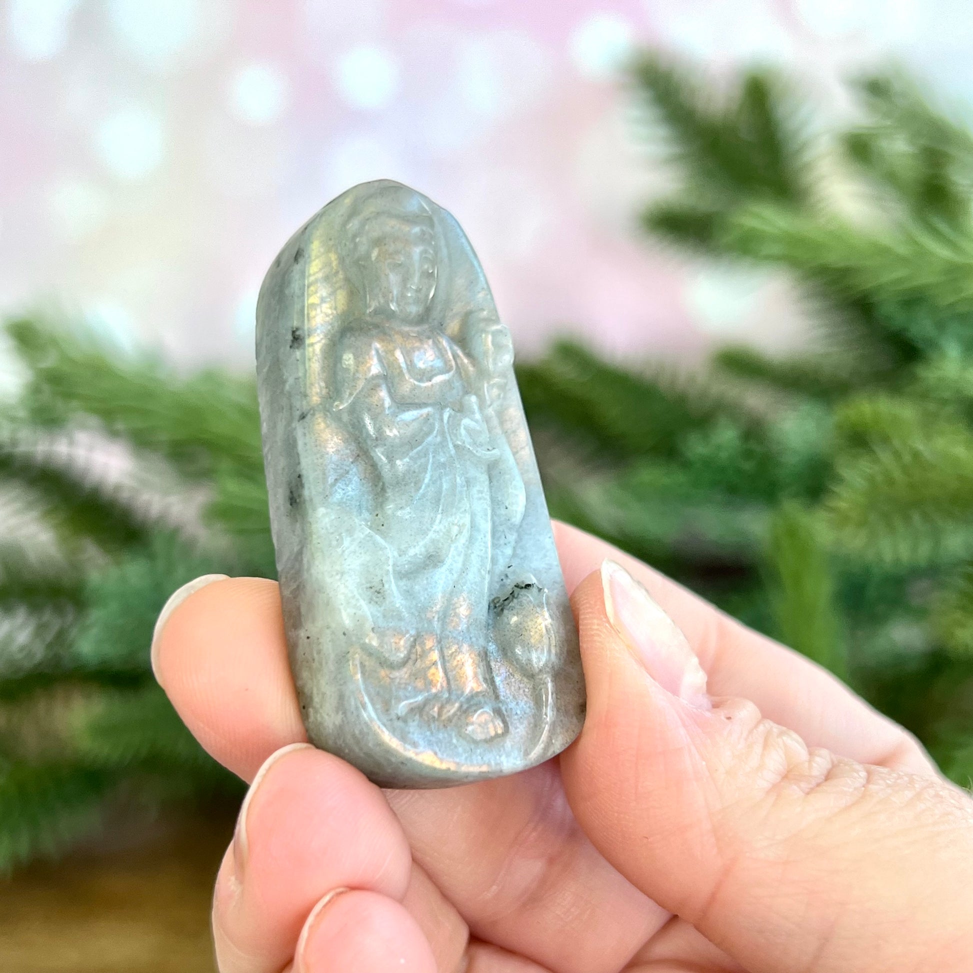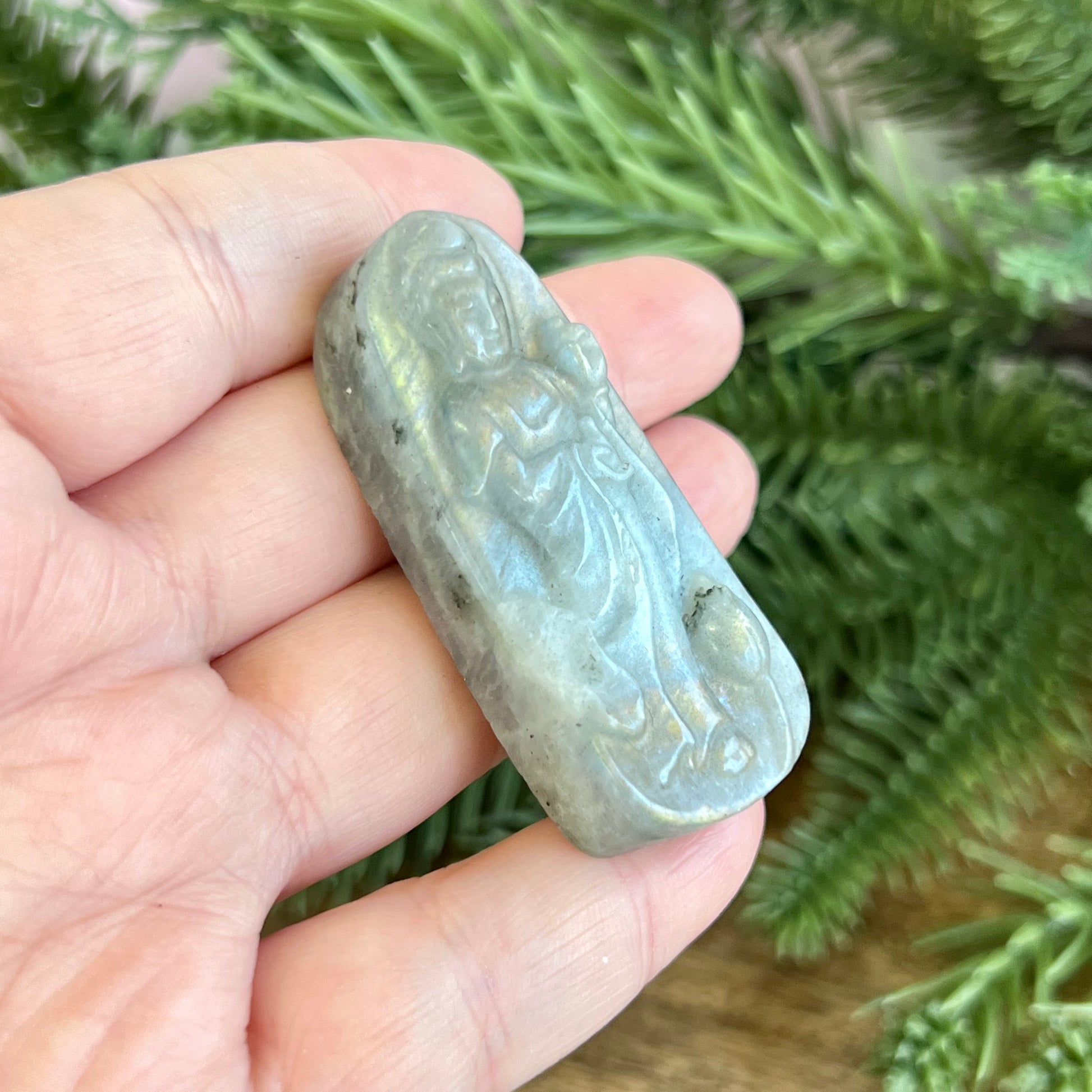 Enhance your spiritual practices with this beautiful Labradorite carved stone cabochon. This crystal has been intricately carved into Kwan Yin on a Lotus Flower, a perfect reminder to stay compassionate.