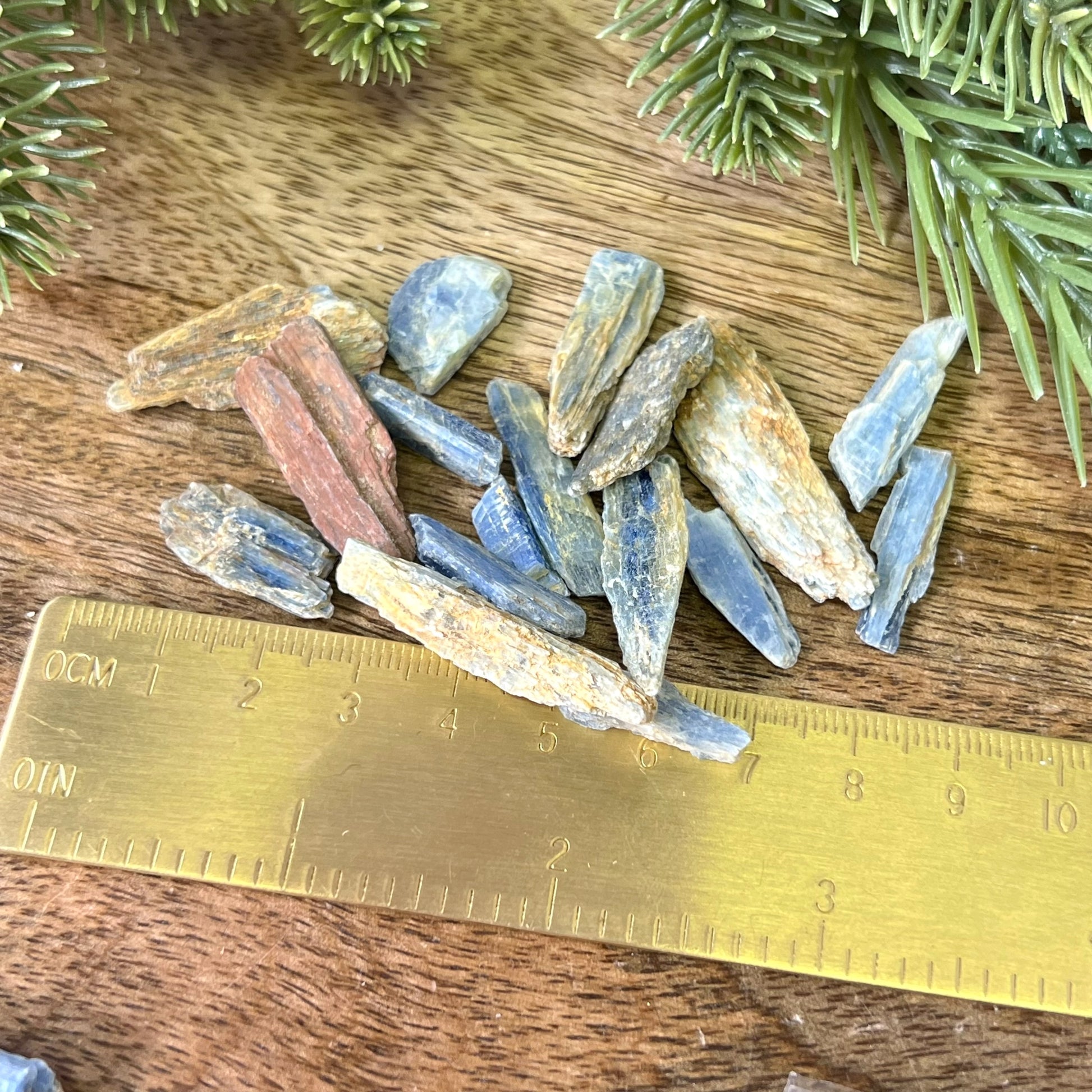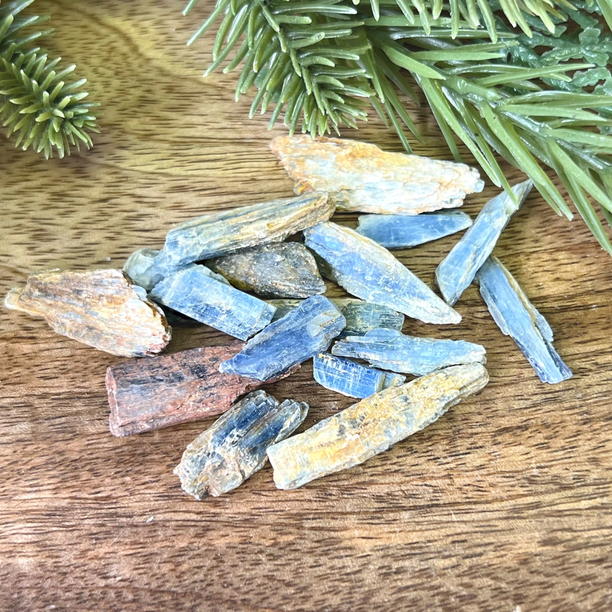 Enhance your spiritual practices with this beautiful Kyanite natural gemstone specimen. This crystal features a light blue color. You get 1 ounce of blades. Some have sandy and red inclusions.