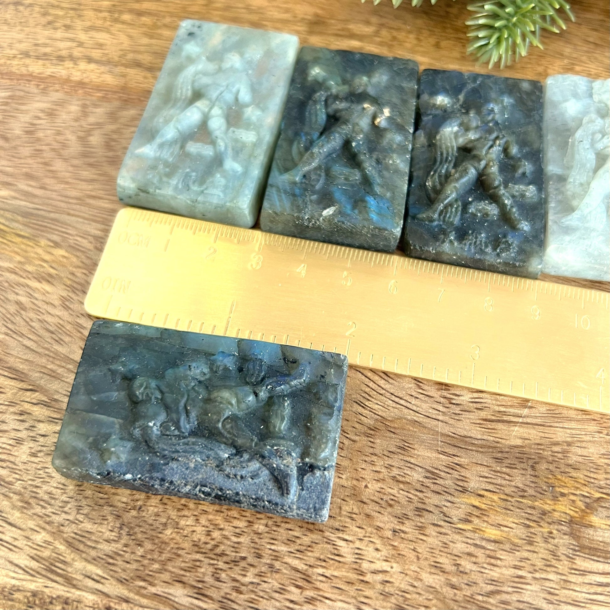 Enhance your spiritual practices with this beautiful Labradorite carved stone cabochon. This crystal features a detailed carving of a man pouring water from a jug - representative of the zodiac sign Aquarius