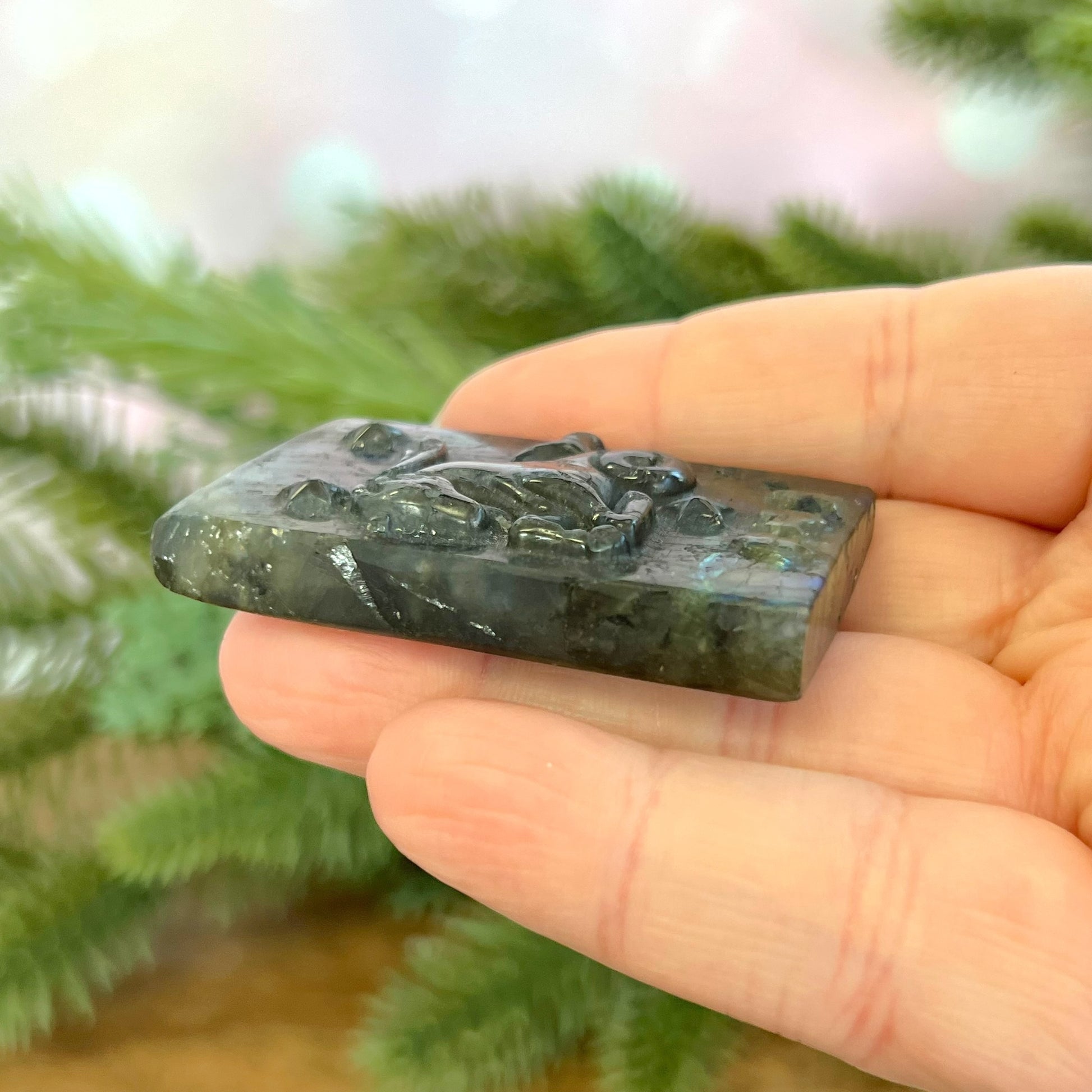 Enhance your spiritual practices with this beautiful Labradorite carved stone cabochon. This crystal features a detailed carving of a goat with a fish tail, for the zodiac sign Capricorn.