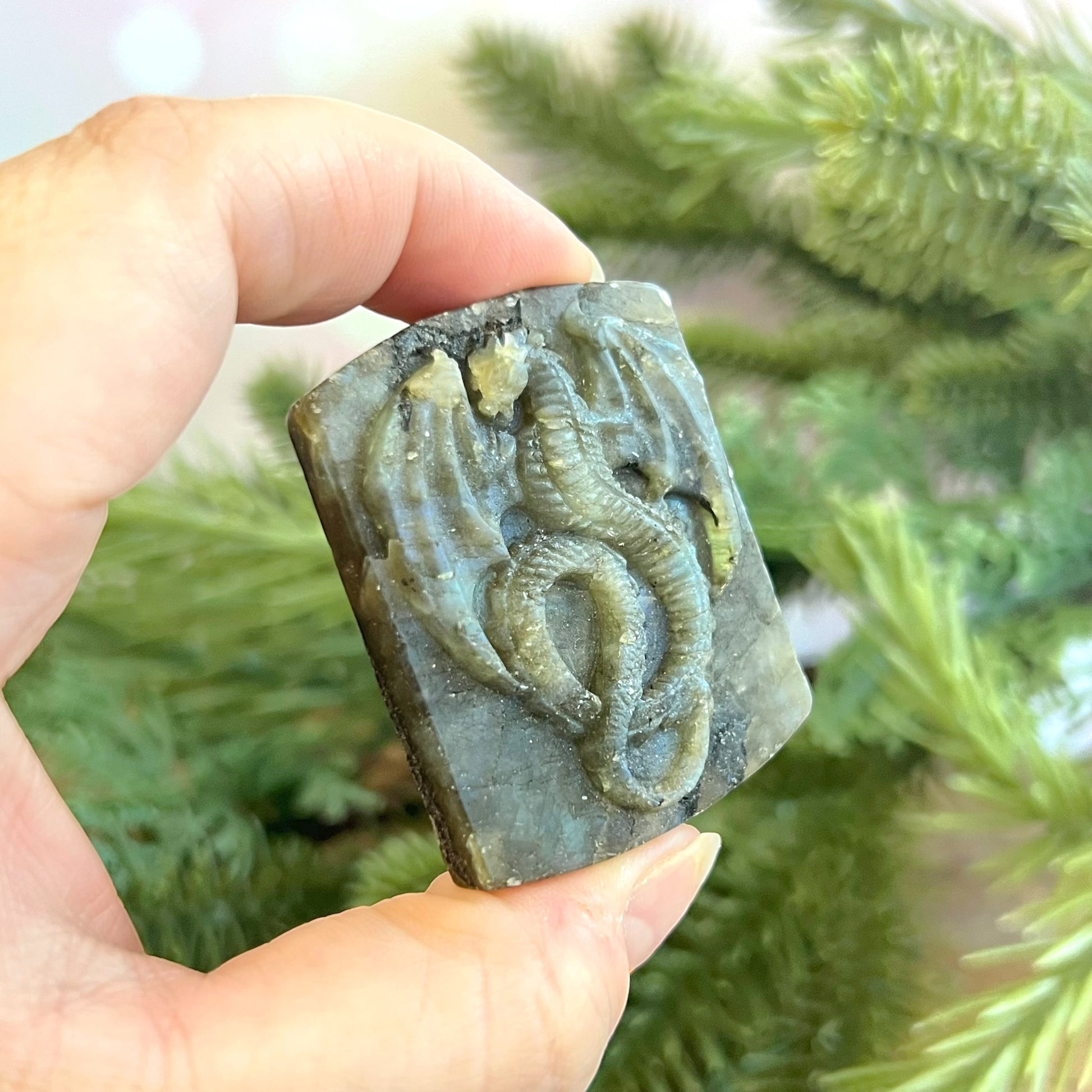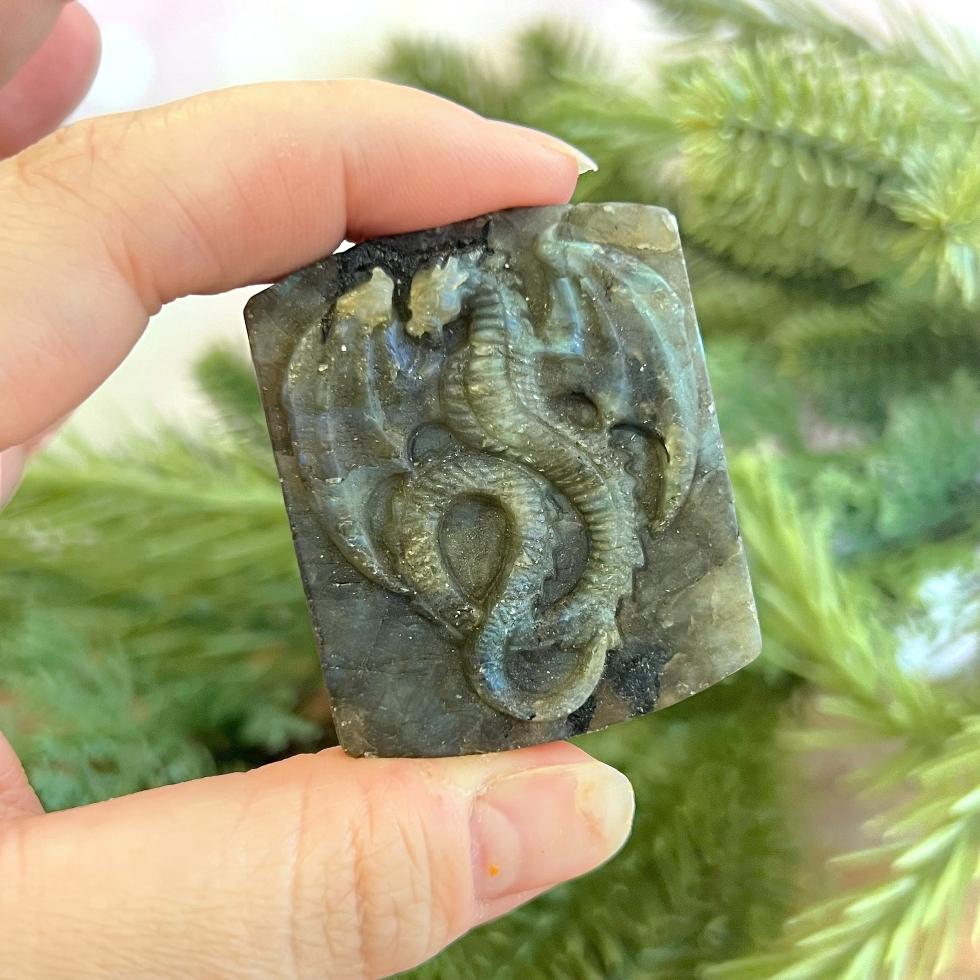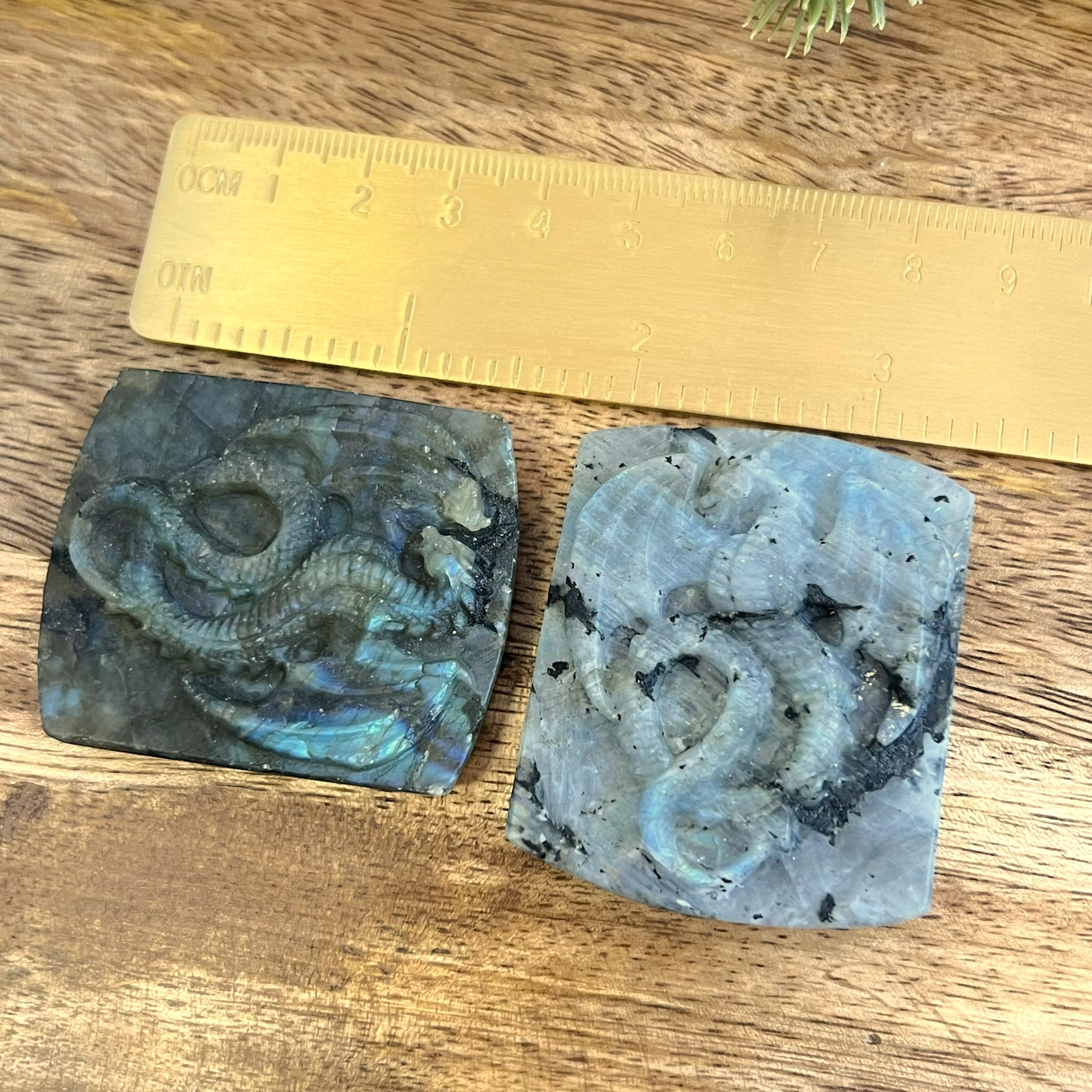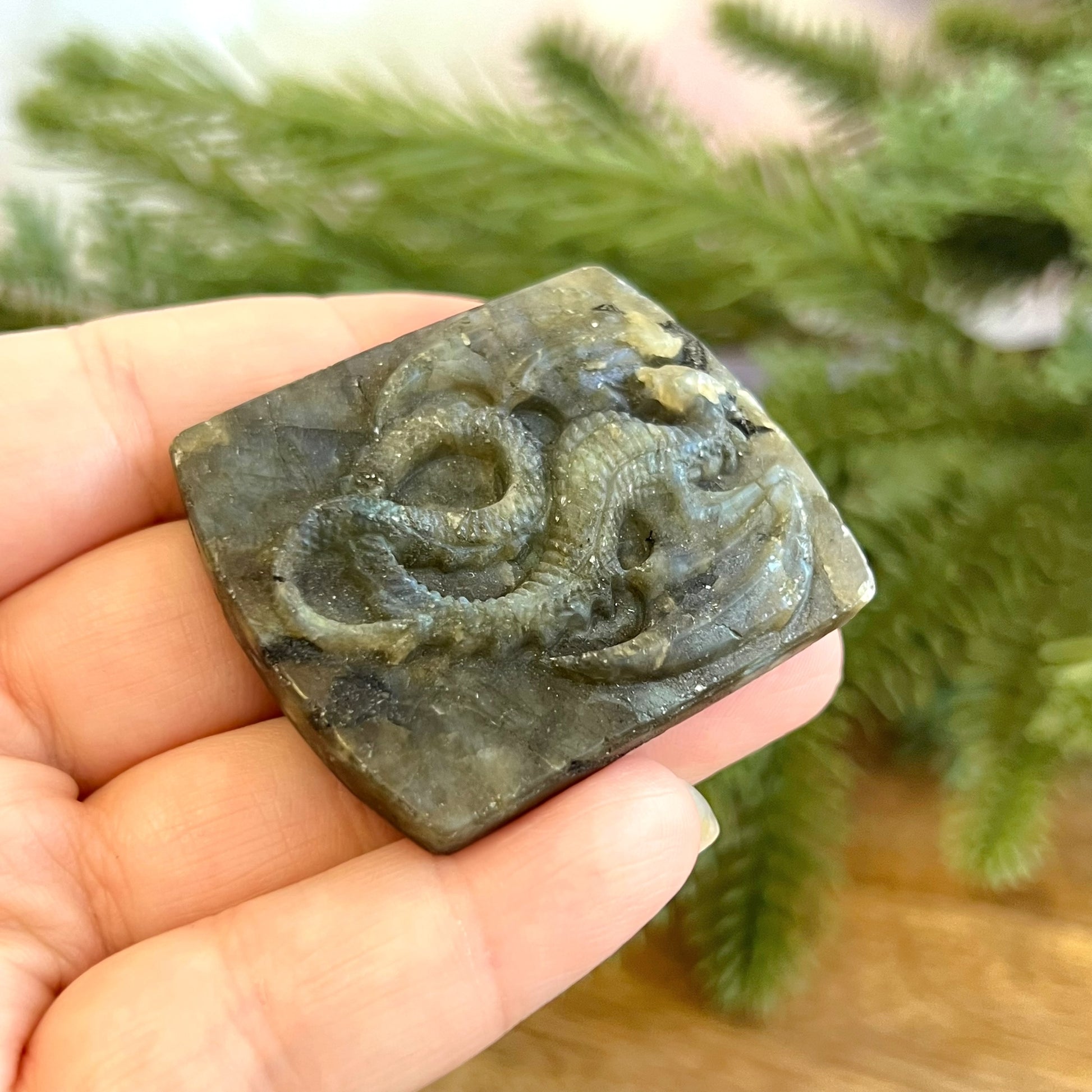 Enhance your spiritual practices with this beautiful Labradorite carved stone cabochon. This crystal features a detailed Dragon. Dragons are fantastical winged serpent creatures that soar and swim through our dreamscapes. They can be found across cultures, and symbolize prosperity, Good Fortune, courage, strength, perseverance, and our personal journeys.