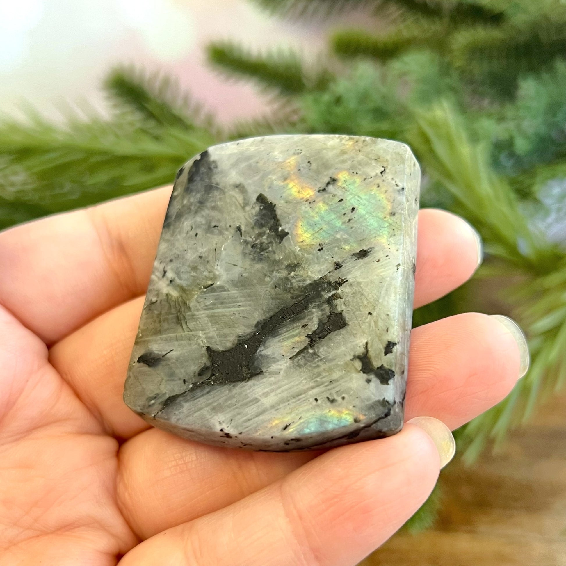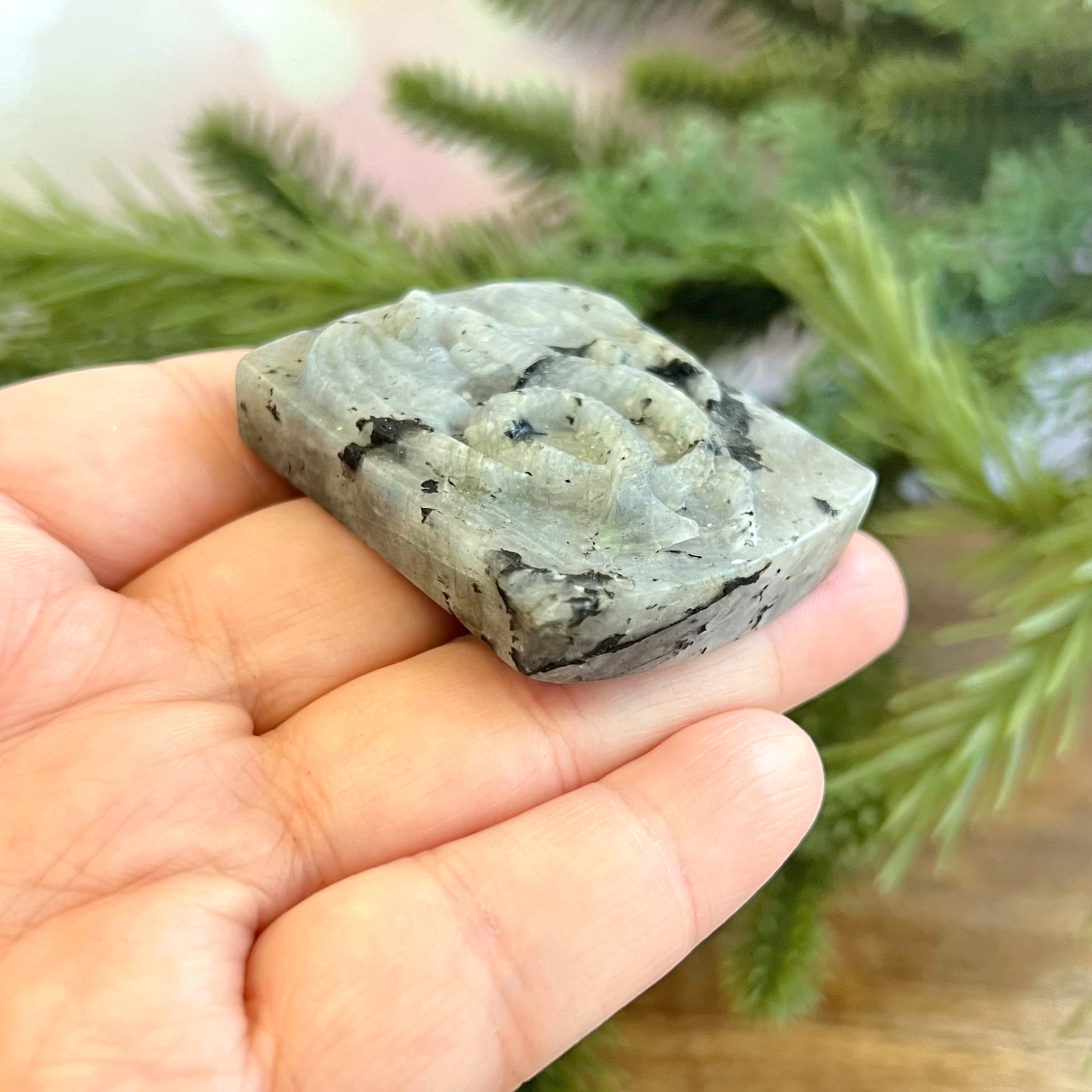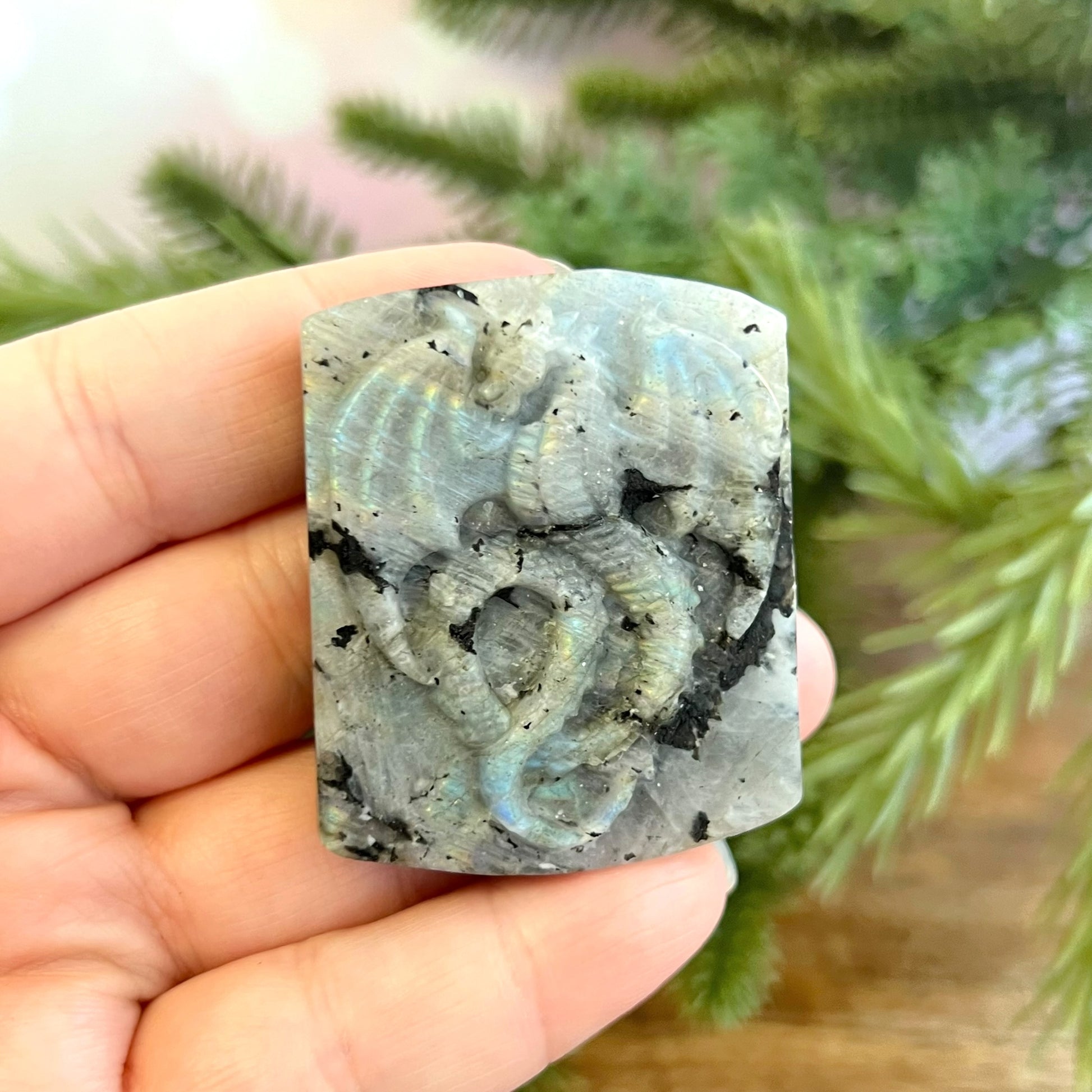 Enhance your spiritual practices with this beautiful Labradorite carved stone cabochon. This crystal features a detailed Dragon. Dragons are fantastical winged serpent creatures that soar and swim through our dreamscapes. They can be found across cultures, and symbolize prosperity, Good Fortune, courage, strength, perseverance, and our personal journeys.