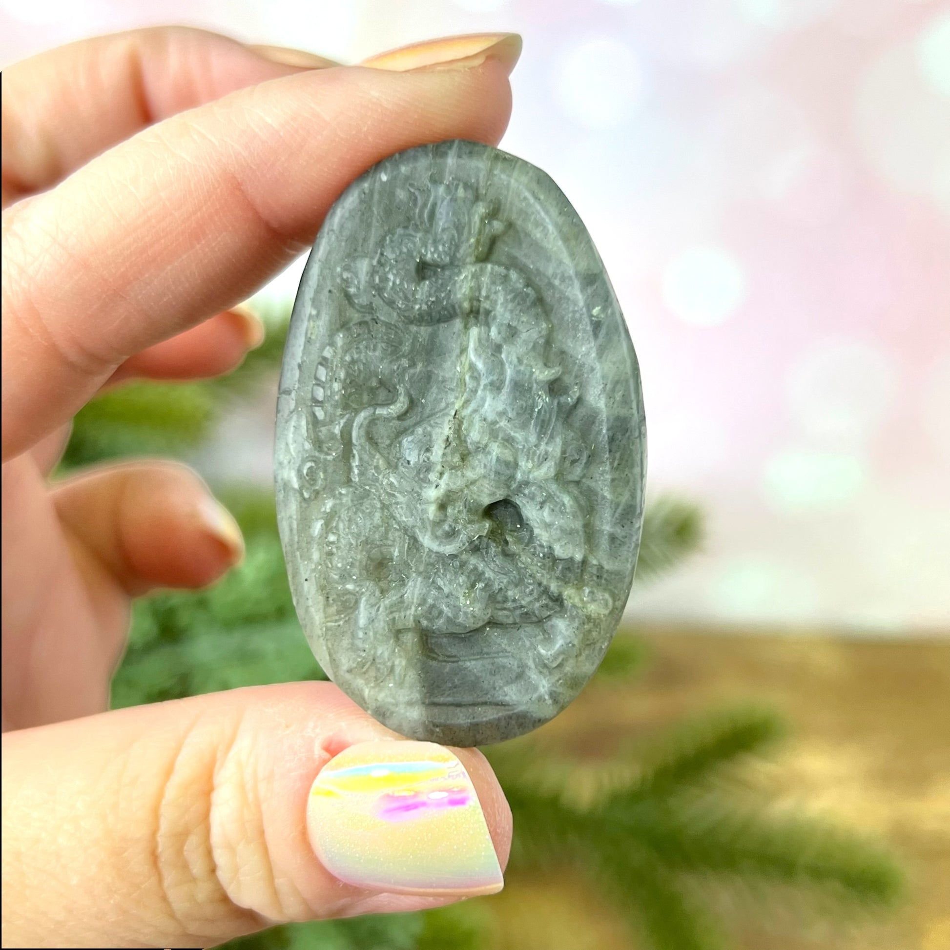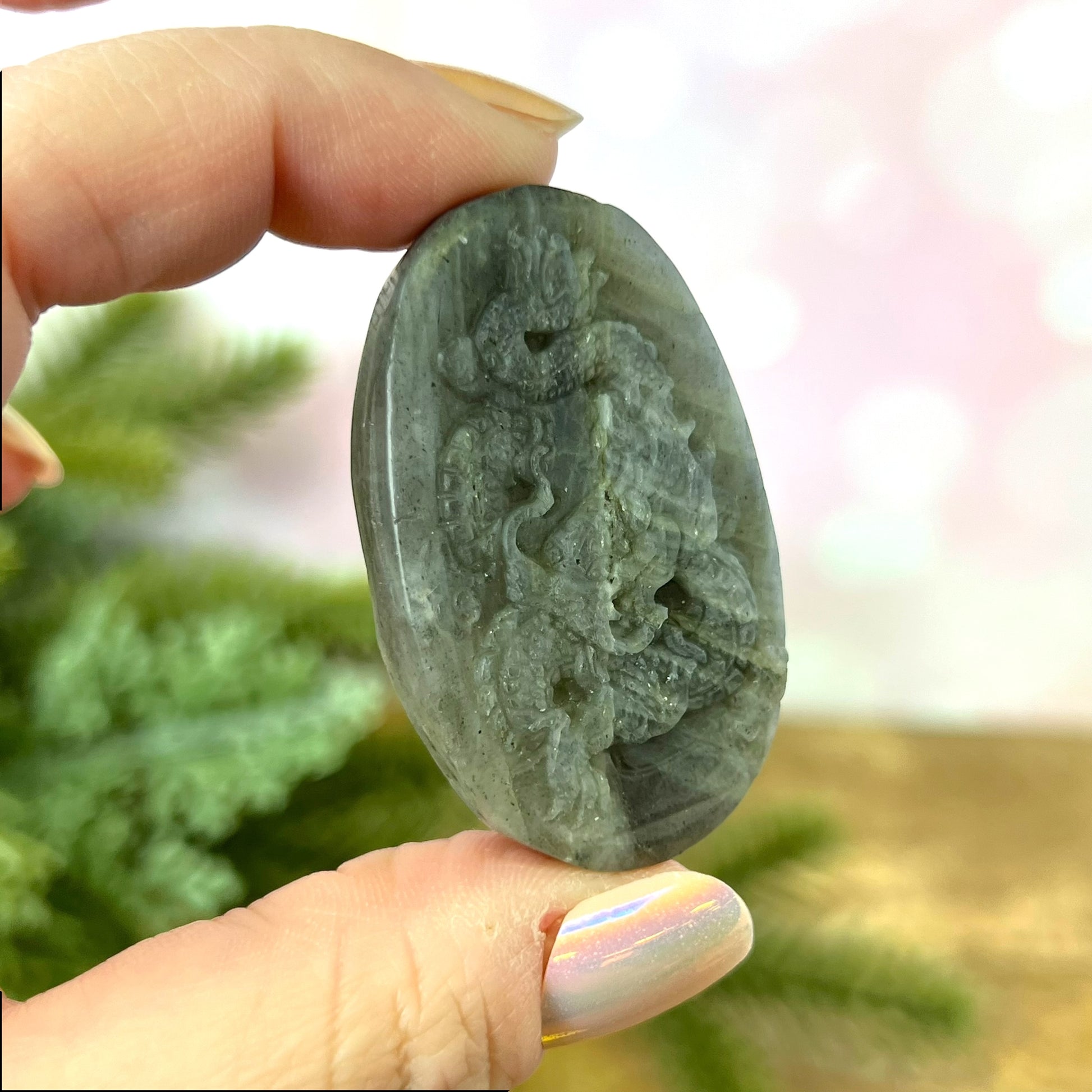 Enhance your spiritual practices with this beautiful Labradorite carved stone cabochon. This crystal features a detailed Dragon. Dragons are fantastical winged serpent creatures that soar and swim through our dreamscapes. They can be found across cultures, and symbolize prosperity, Good Fortune, courage, strength, perseverance, and our personal journeys.