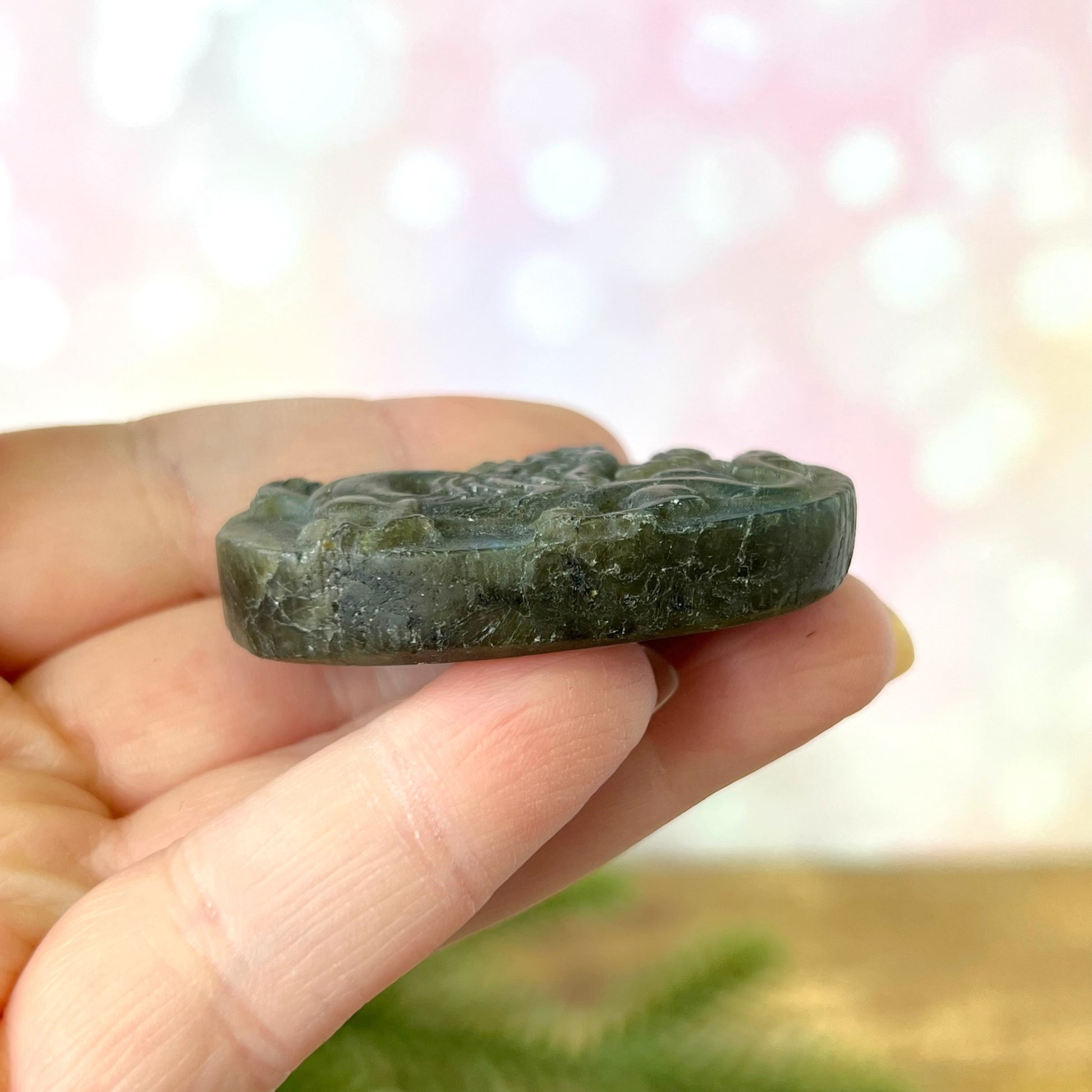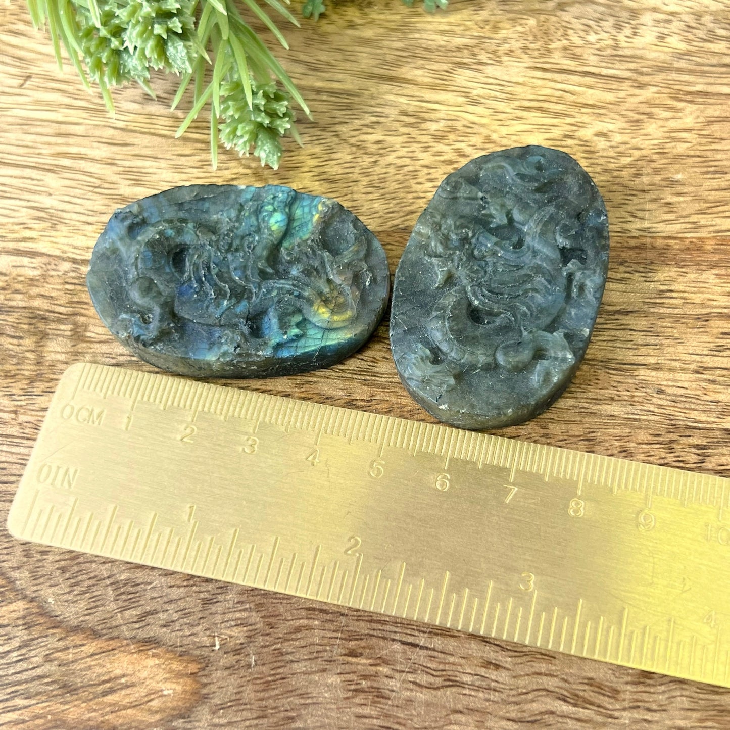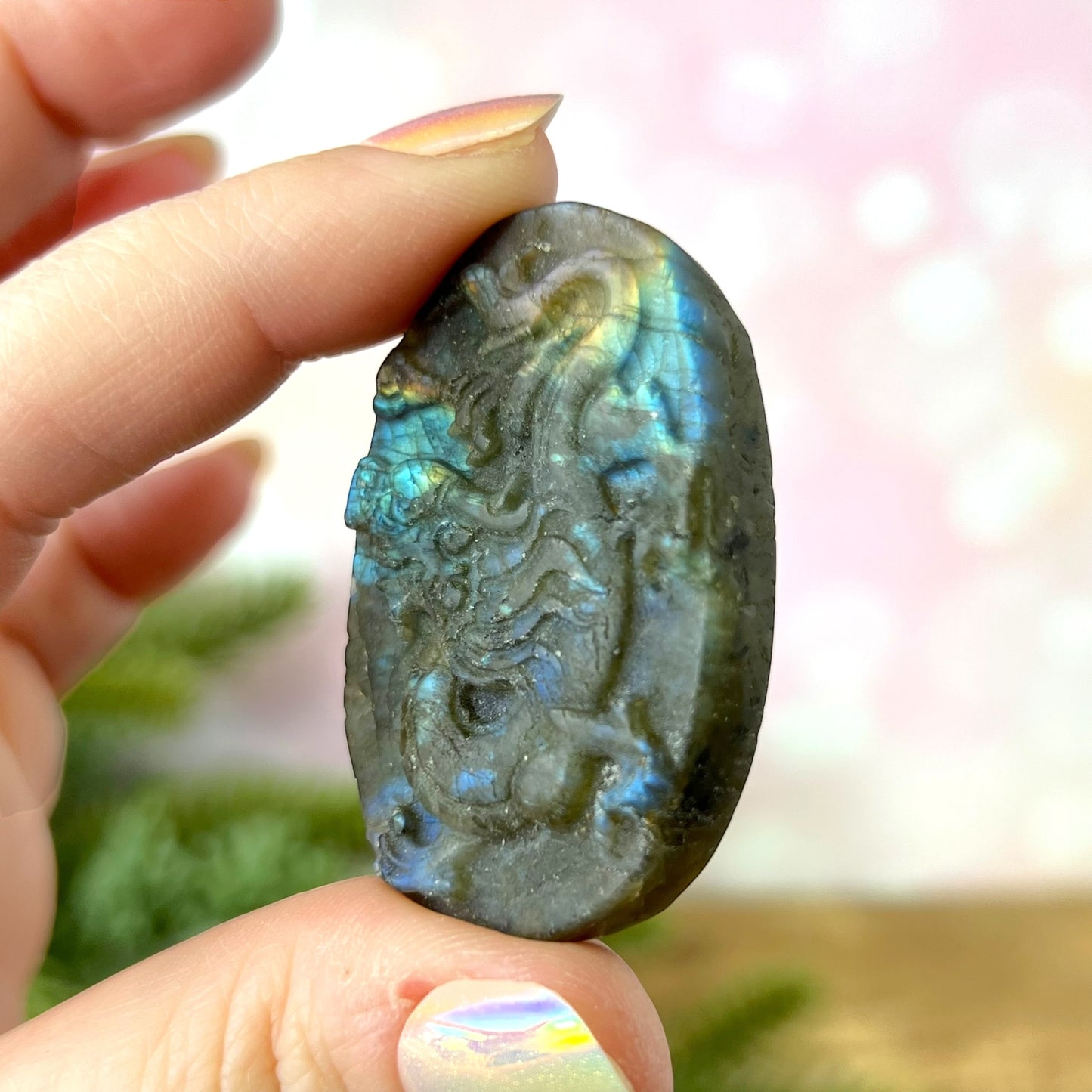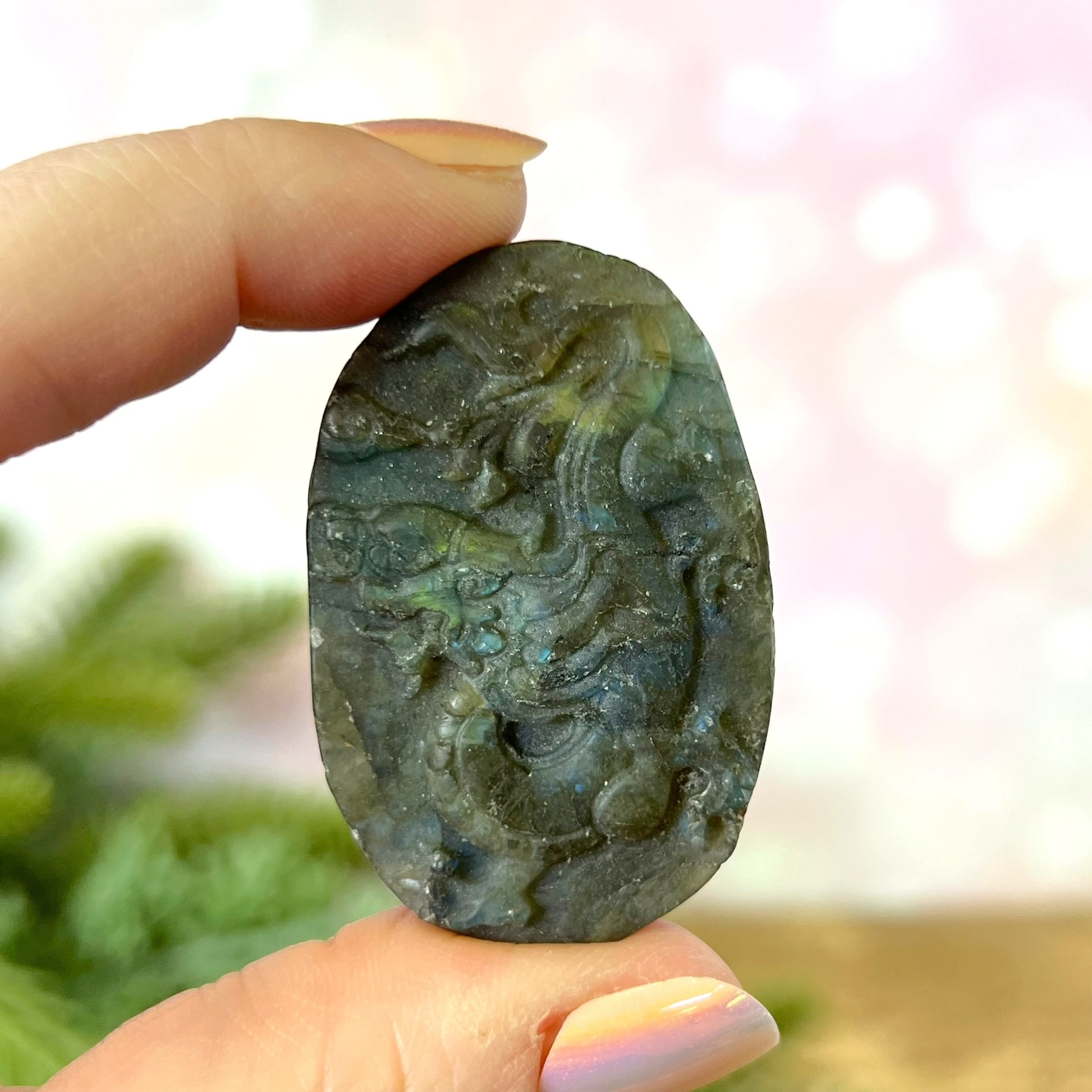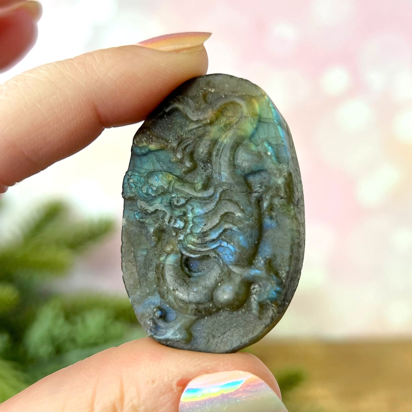 Enhance your spiritual practices with this beautiful Labradorite carved stone cabochon. This crystal features a detailed Dragon. Dragons are fantastical winged serpent creatures that soar and swim through our dreamscapes. They can be found across cultures, and symbolize prosperity, Good Fortune, courage, strength, perseverance, and our personal journeys.