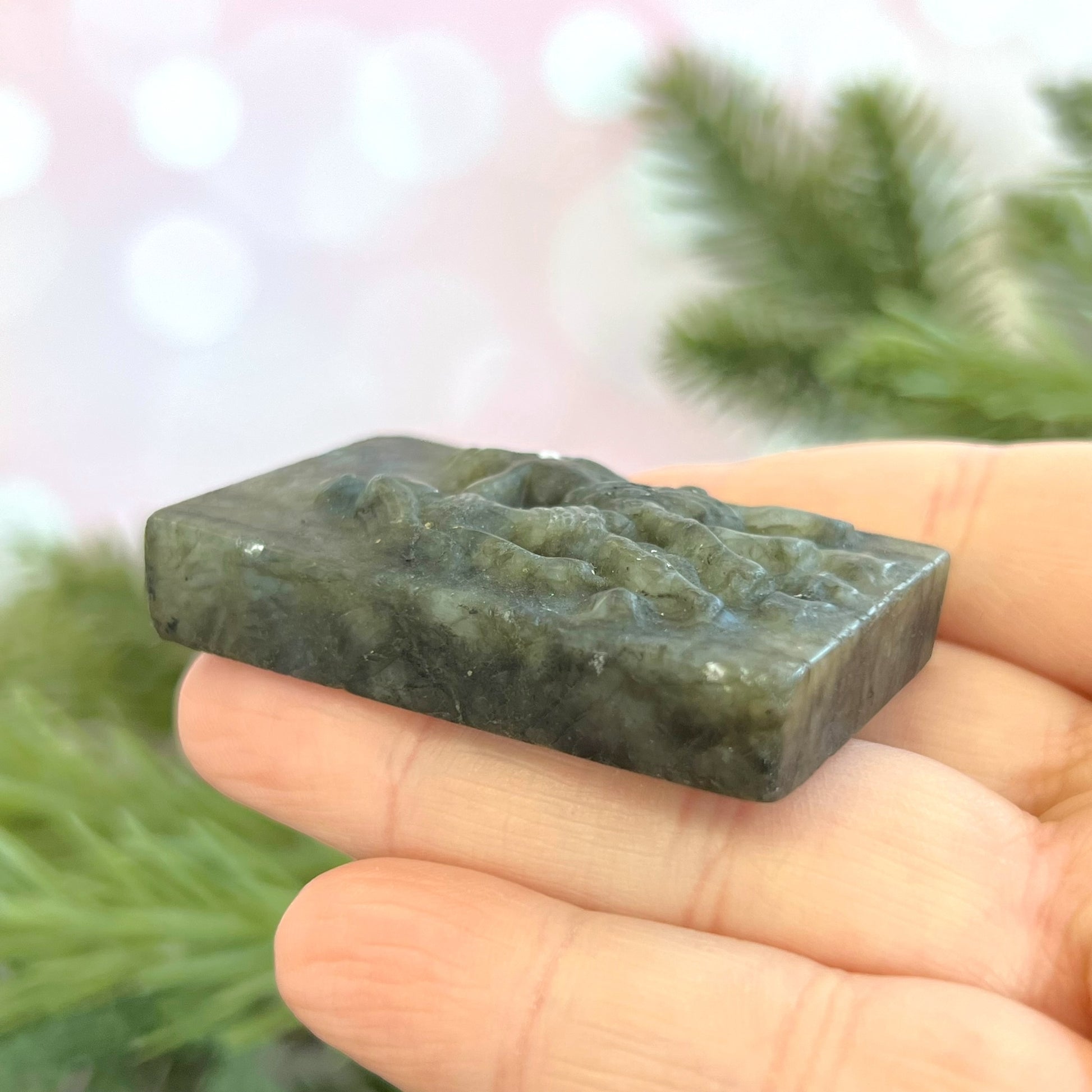 Enhance your spiritual practices with this beautiful Labradorite carved stone cabochon. This crystal features a detailed carving of two twins, for the zodiac sign Gemini.