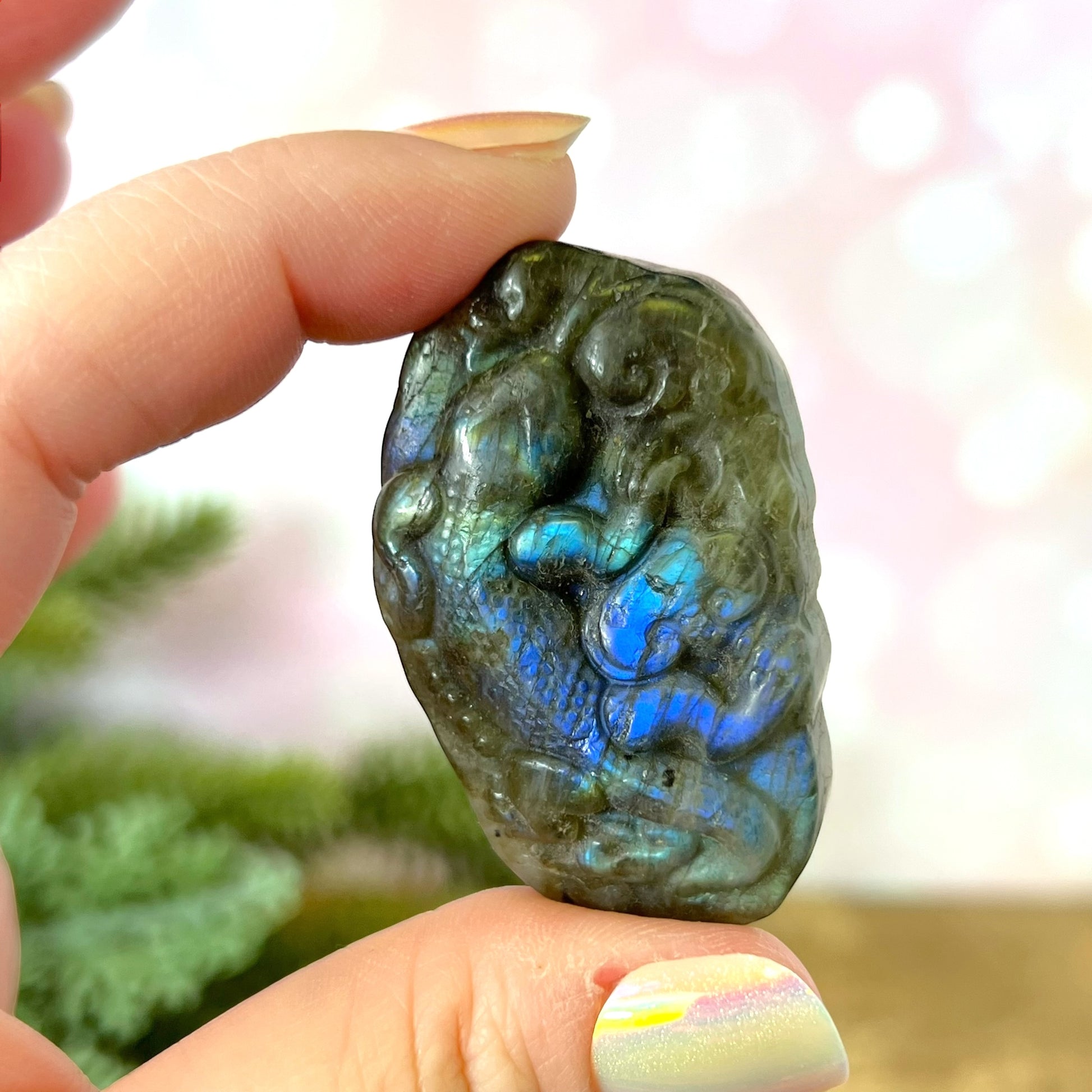 Enhance your spiritual practices with this beautiful Labradorite carved stone cabochon. This crystal features a detailed Iguana lizard carving.