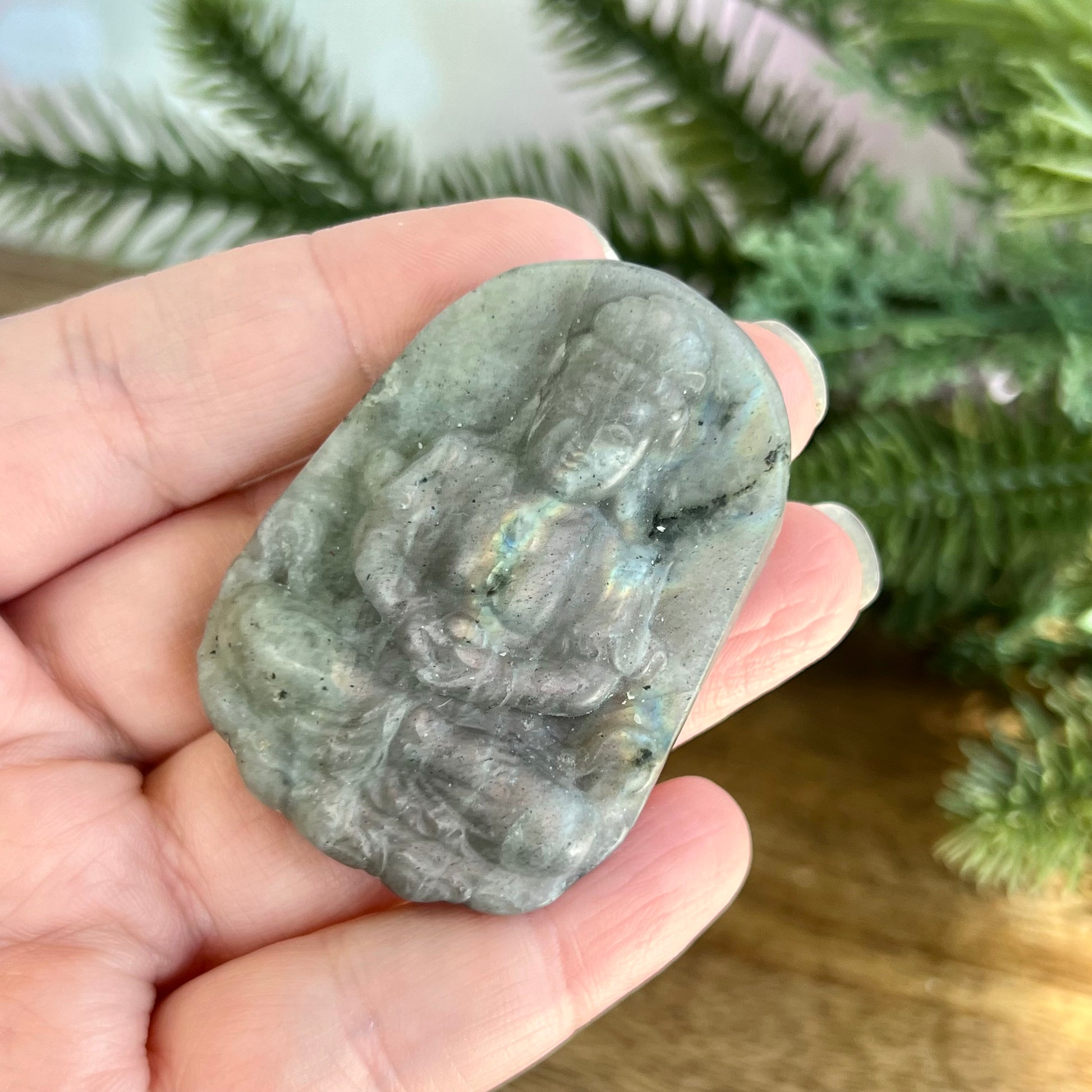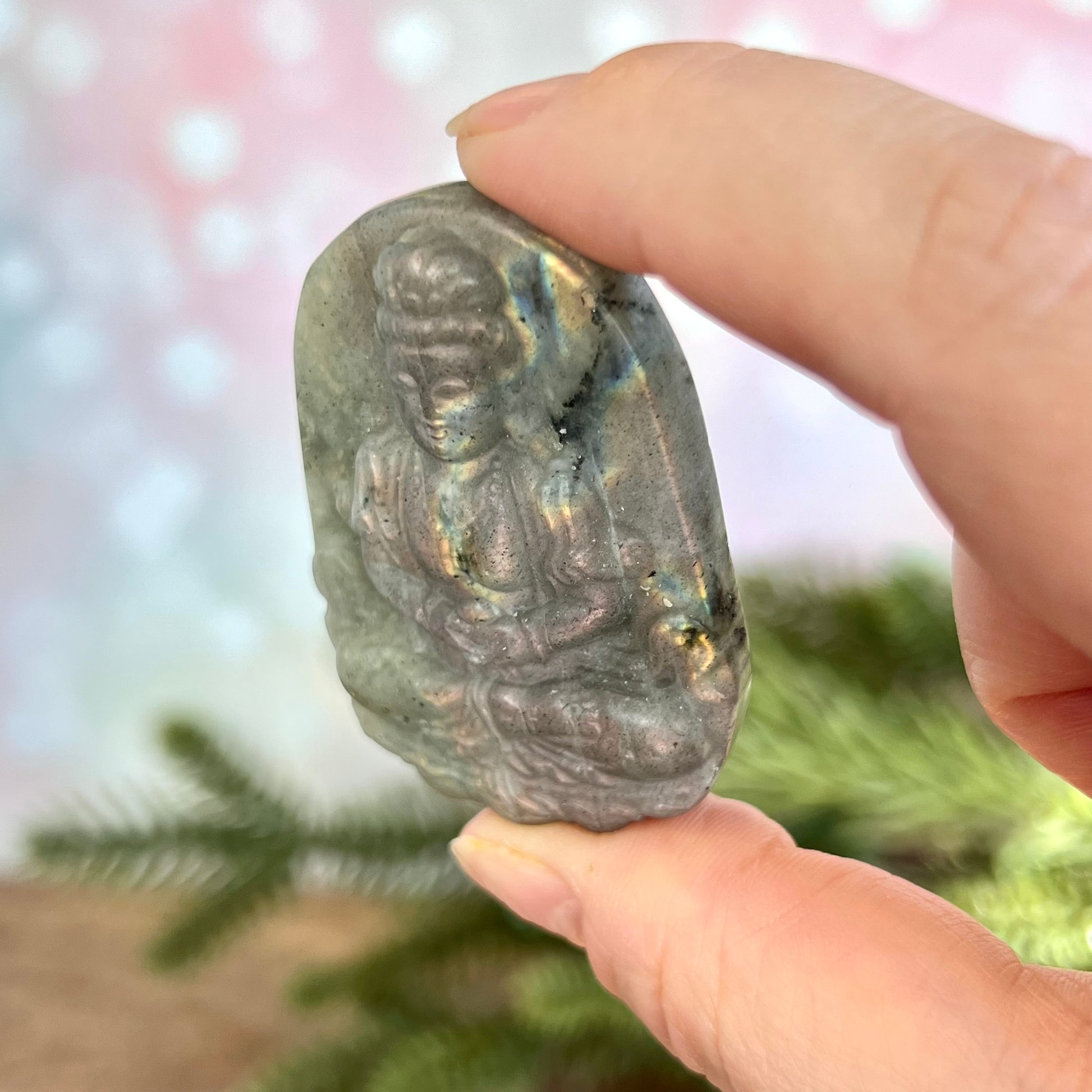 Enhance your spiritual practices with this beautiful Labradorite carved stone cabochon. This crystal has been intricately carved into Meditating Buddha, a perfect reminder to stay mindful.