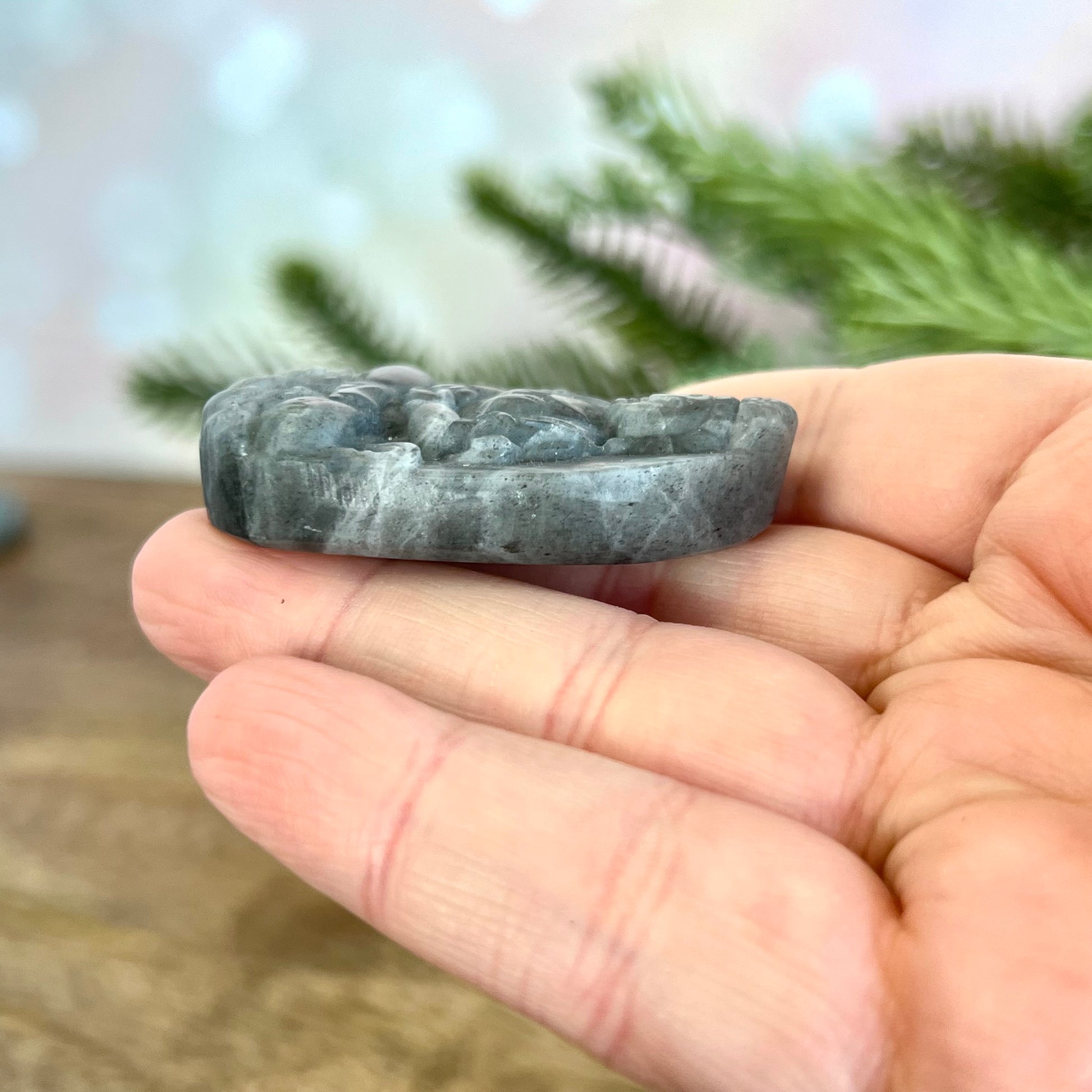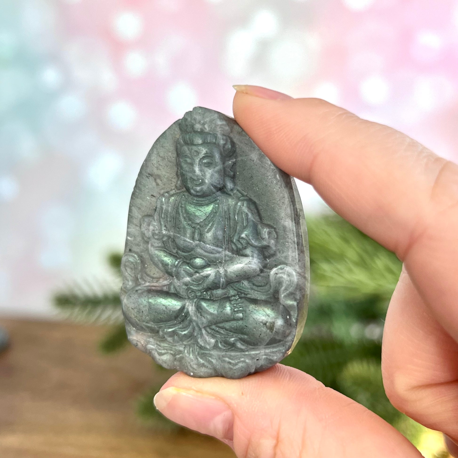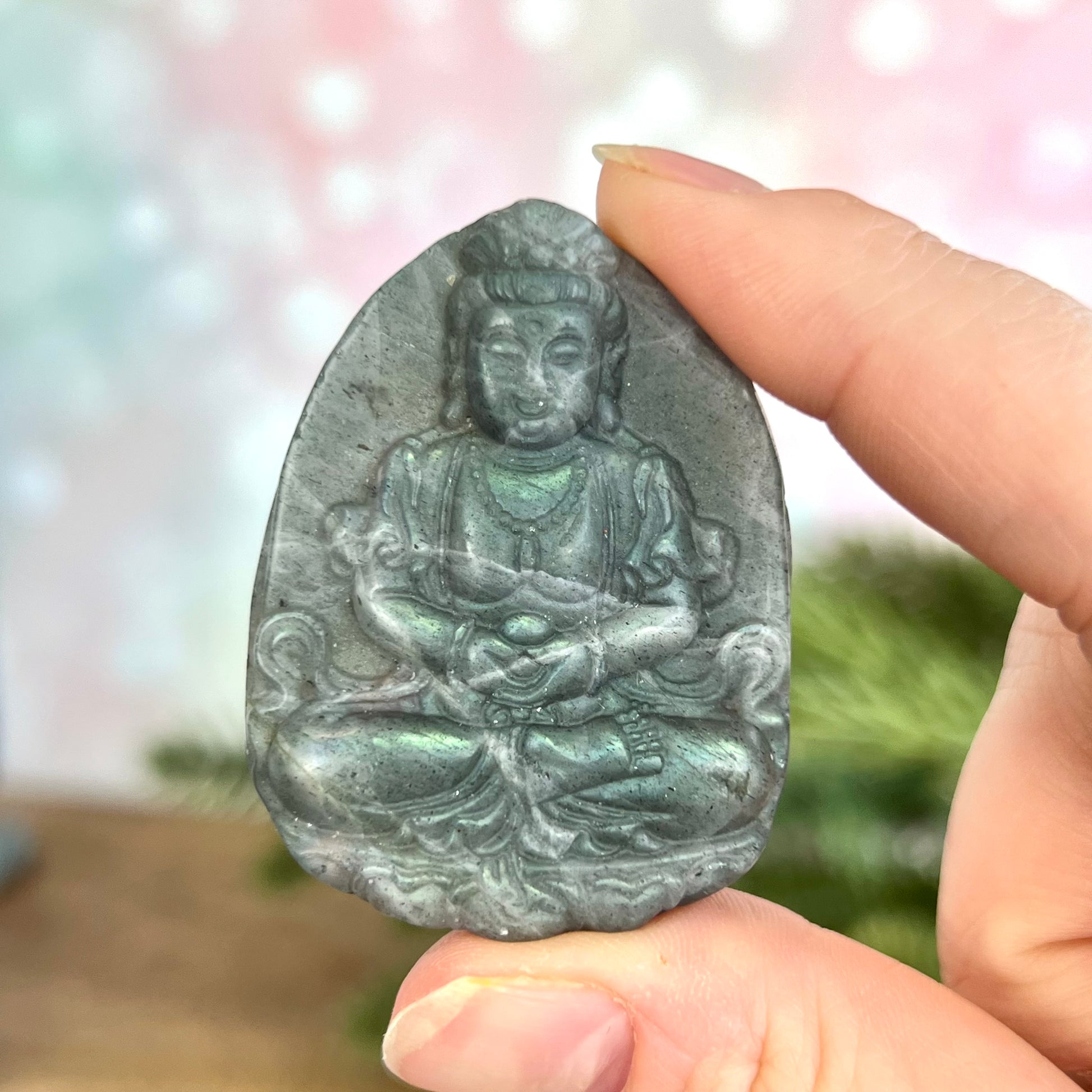 Enhance your spiritual practices with this beautiful Labradorite carved stone cabochon. This crystal has been intricately carved into Meditating Buddha, a perfect reminder to stay mindful.