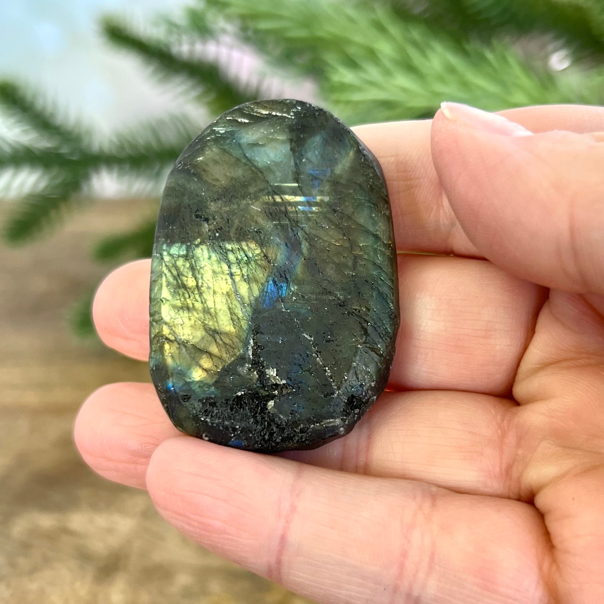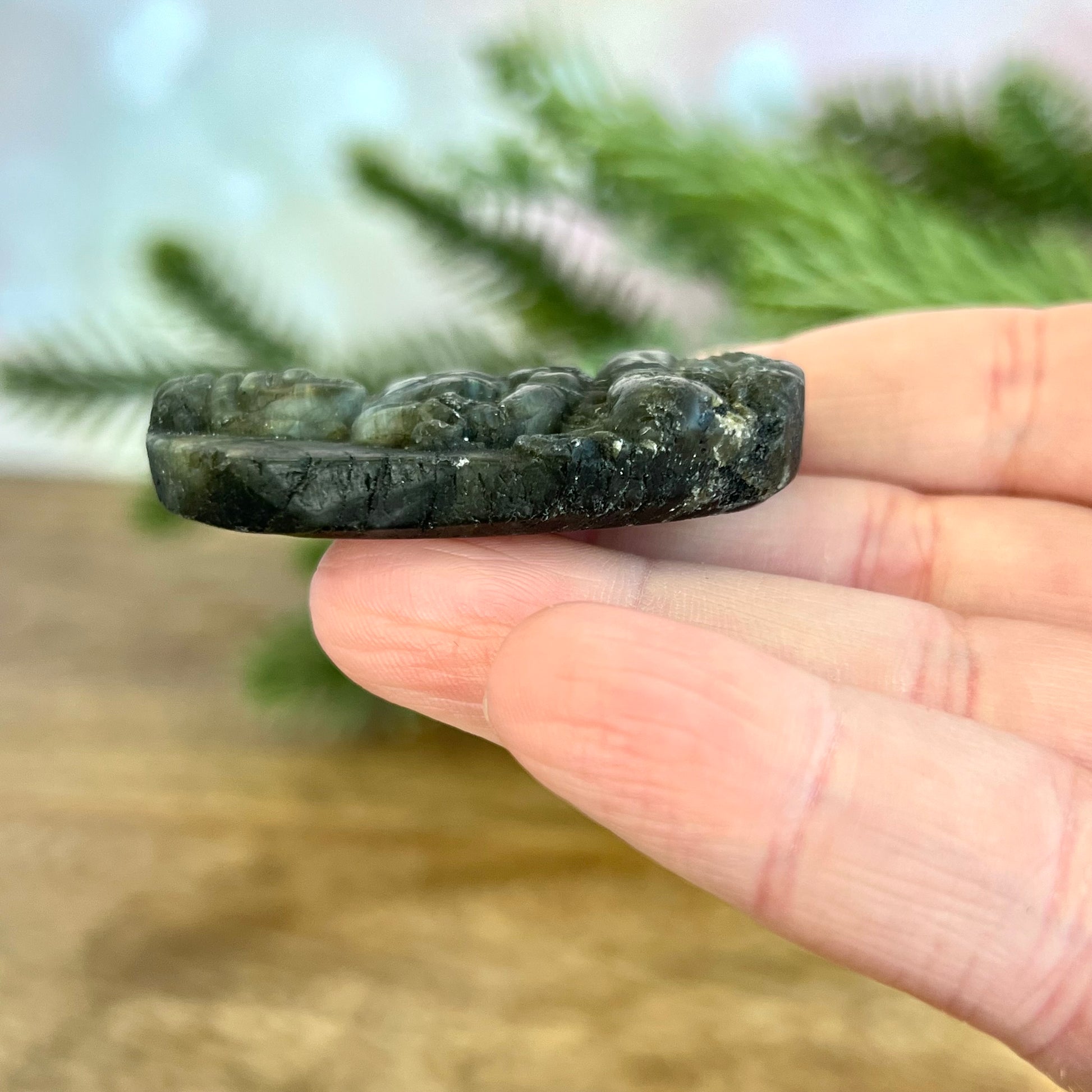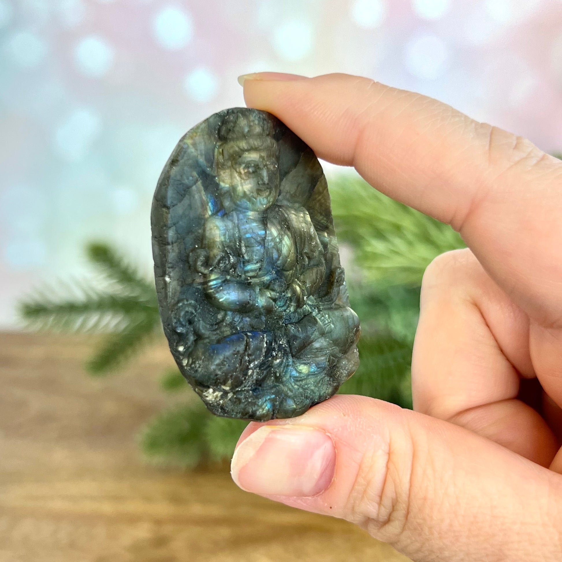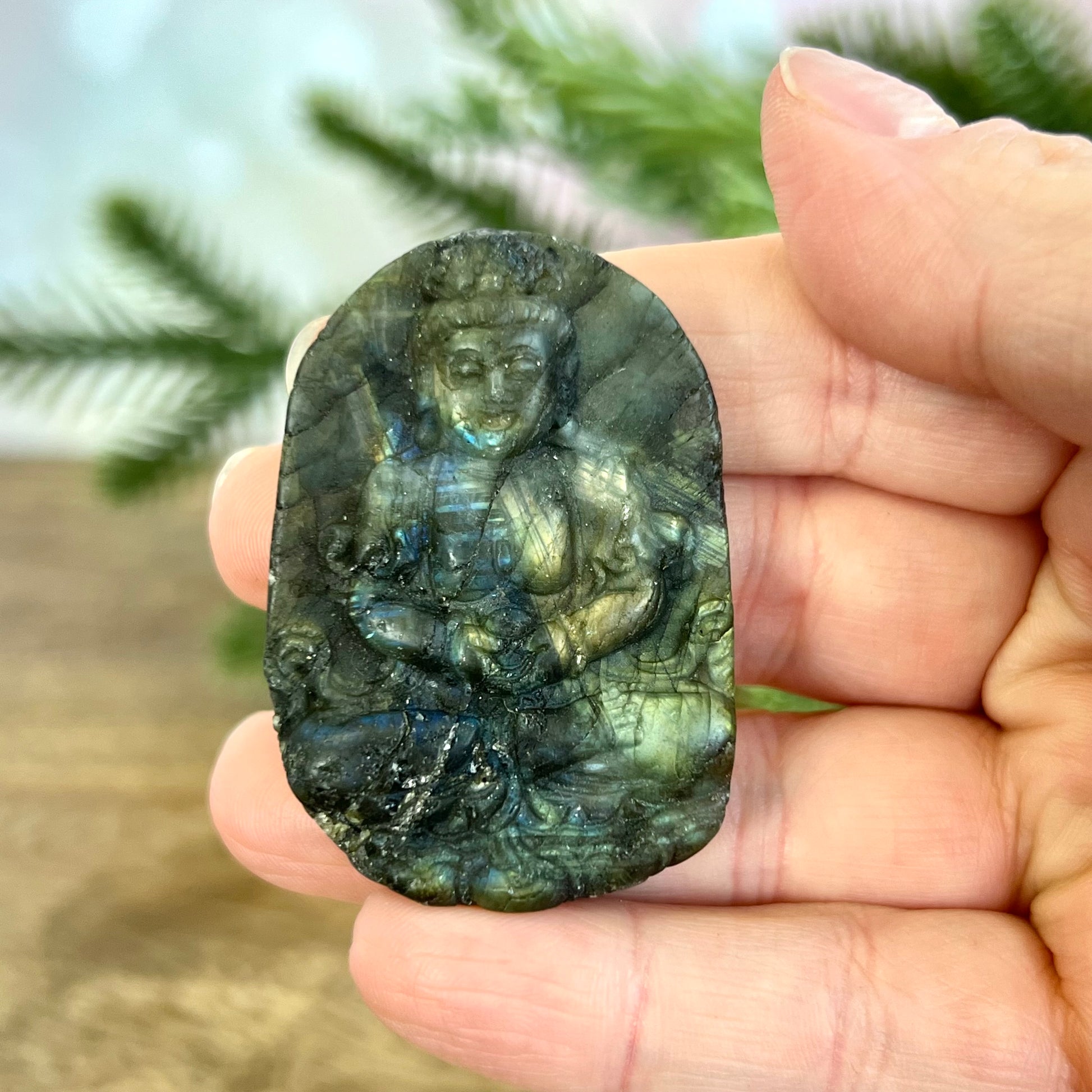 Enhance your spiritual practices with this beautiful Labradorite carved stone cabochon. This crystal has been intricately carved into Meditating Buddha, a perfect reminder to stay mindful.
