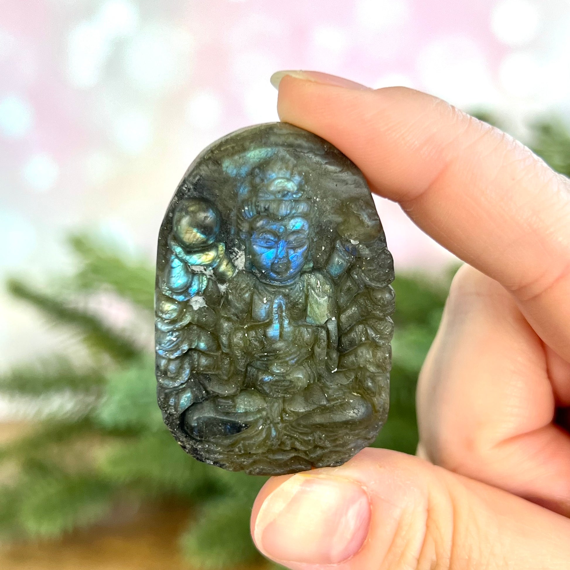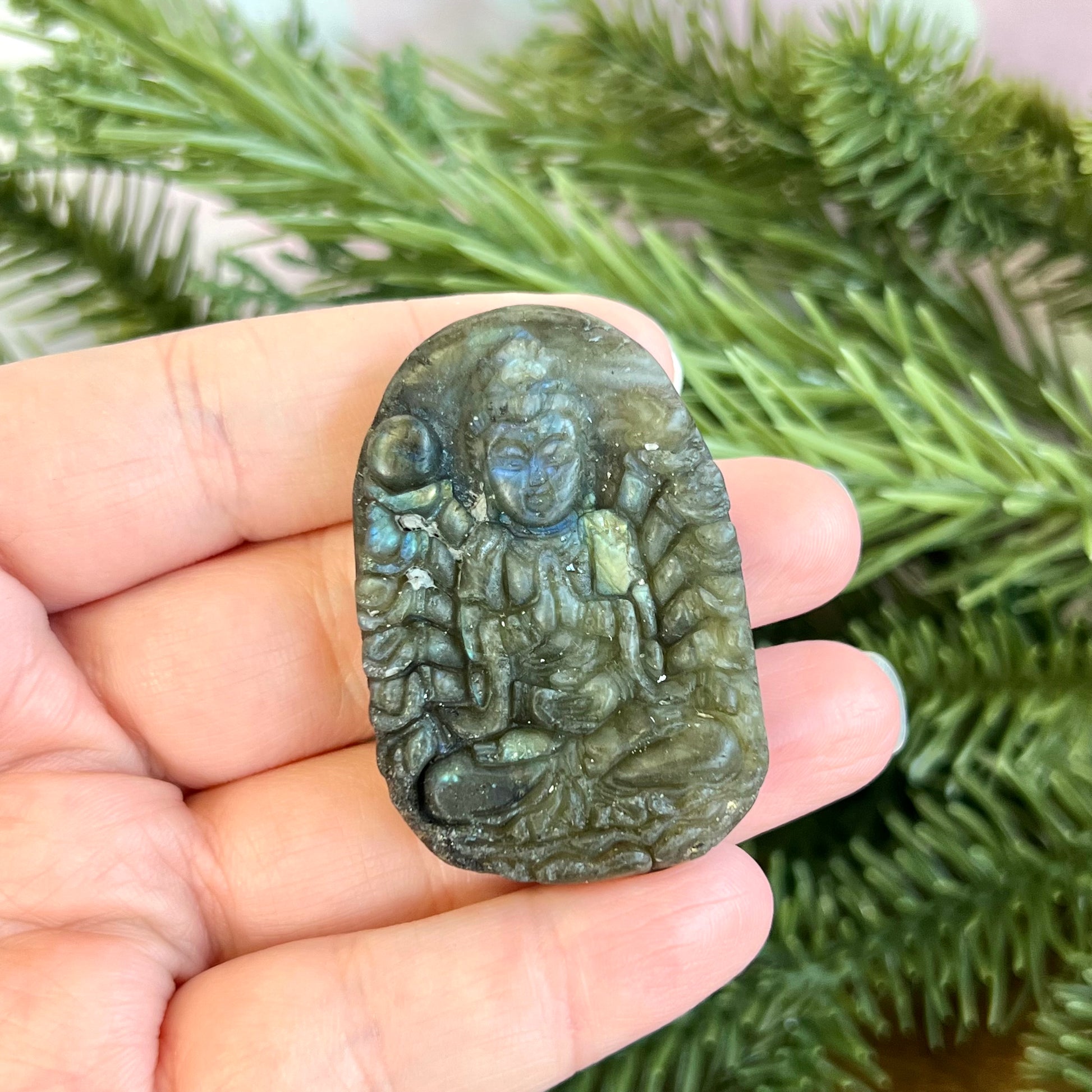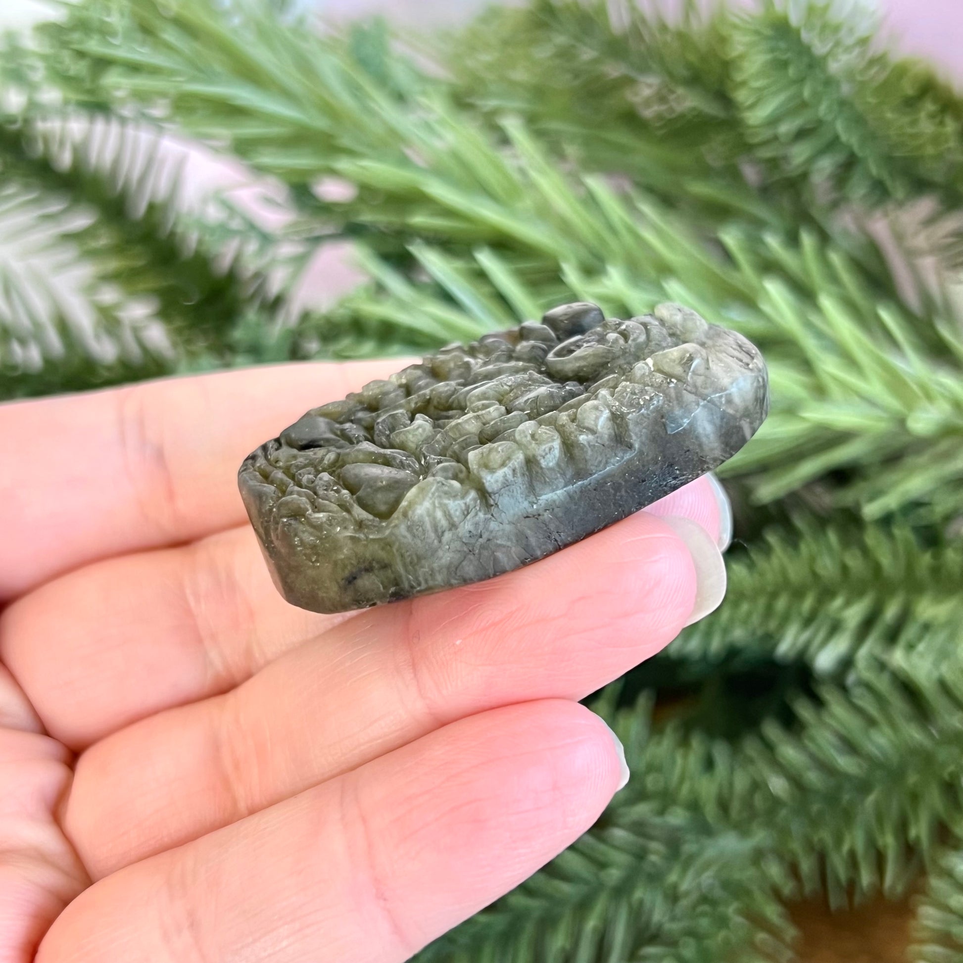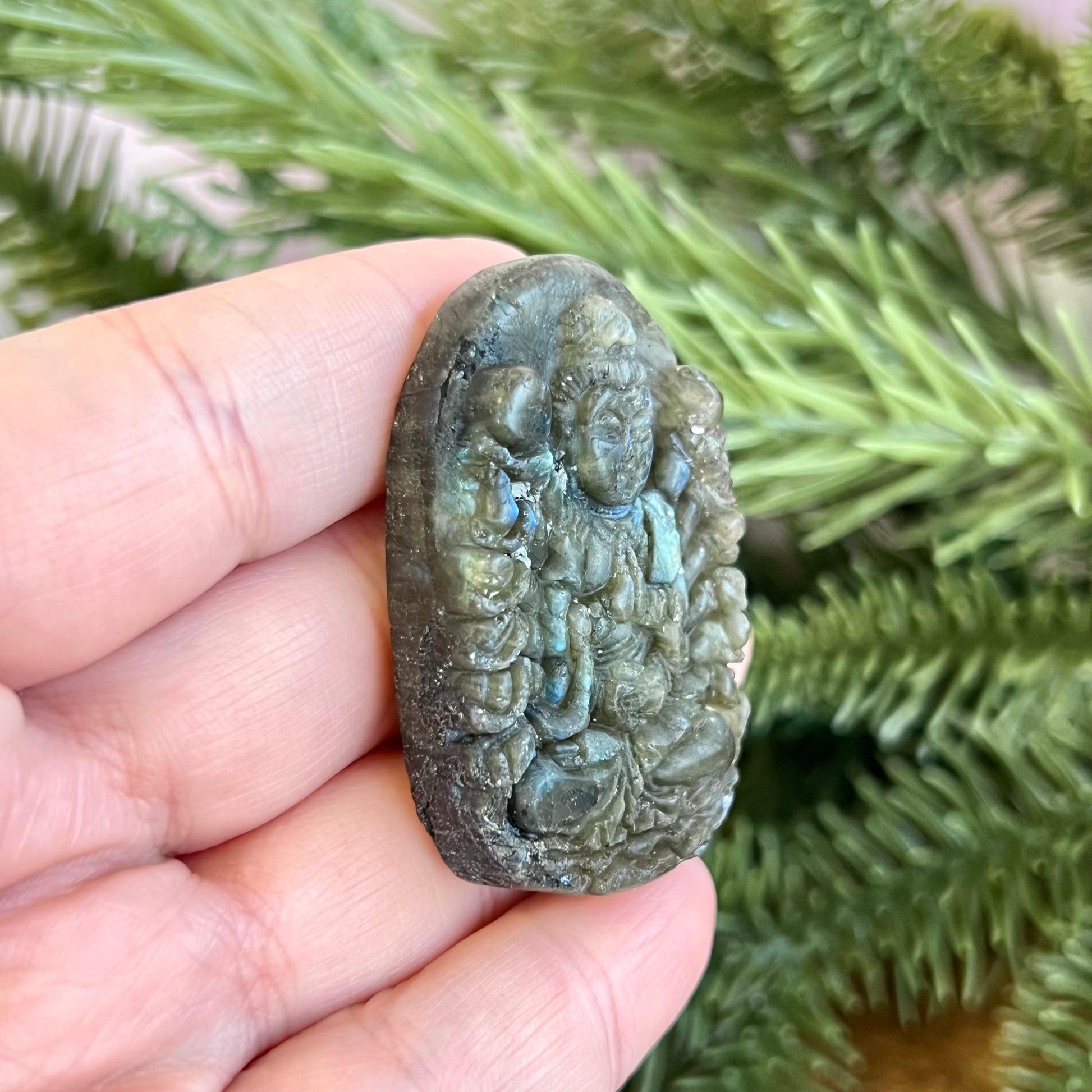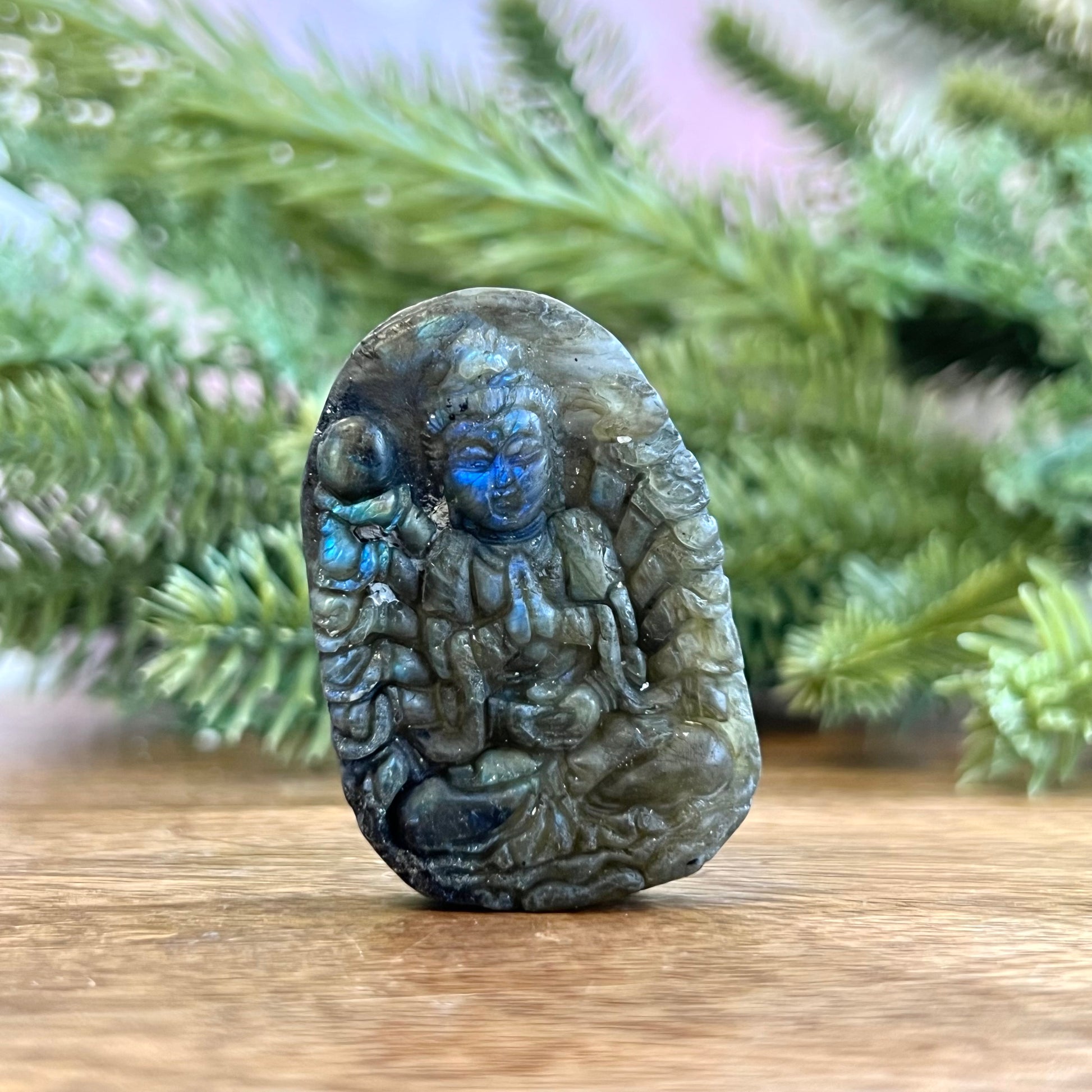 Enhance your spiritual practices with this beautiful Labradorite carved stone cabochon. This crystal has been intricately carved into Meditating Buddha, a perfect reminder to stay mindful.