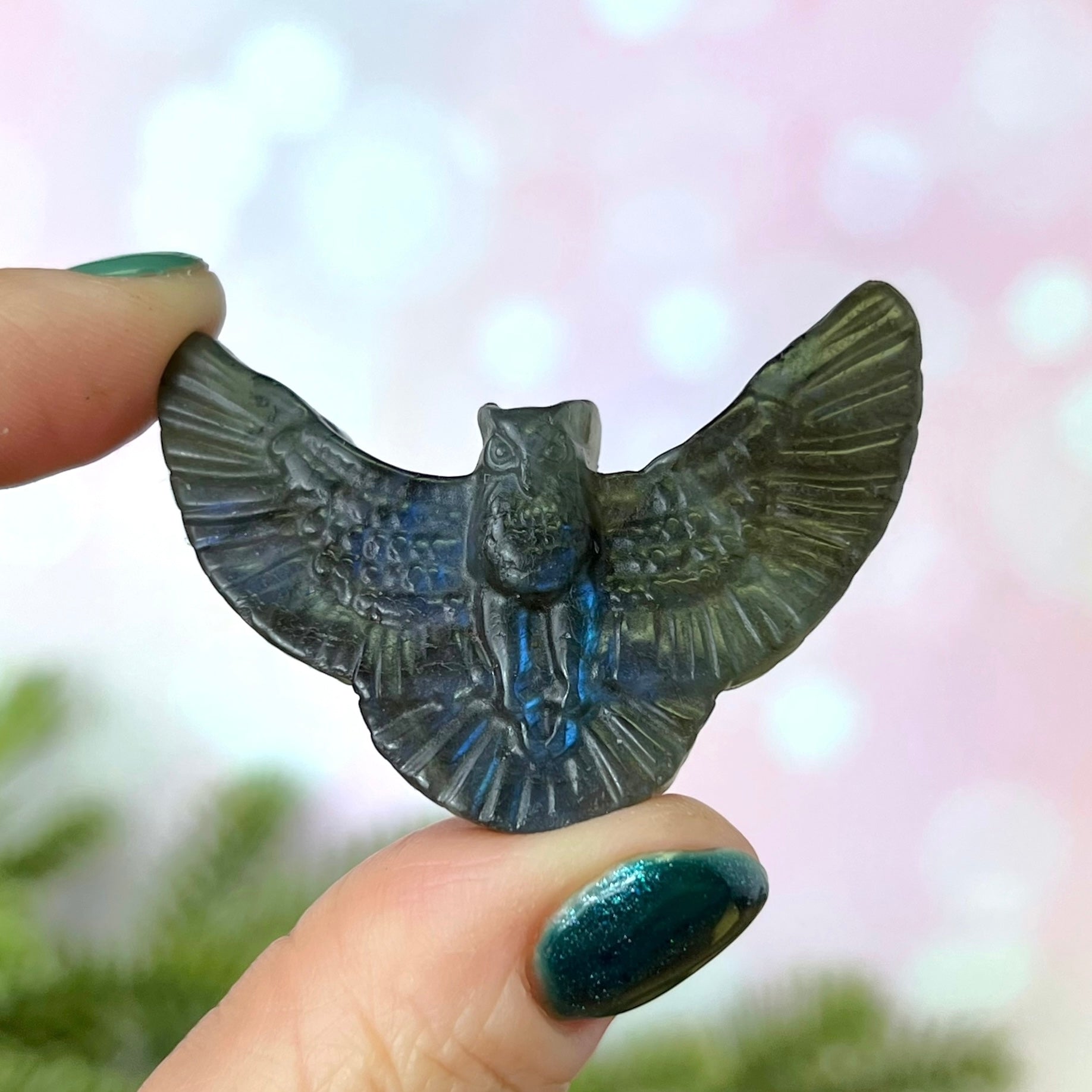 Enhance your spiritual practices with this beautiful Labradorite carved stone cabochon. This crystal features a detailed owl with its wings spread in flight. Owls are nocturnal birds steeped heavily in meaning across cultures. For some people, they represent wisdom, guidance, and prowess. Some cultures see them as messengers of the Dead, here to deliver warnings.