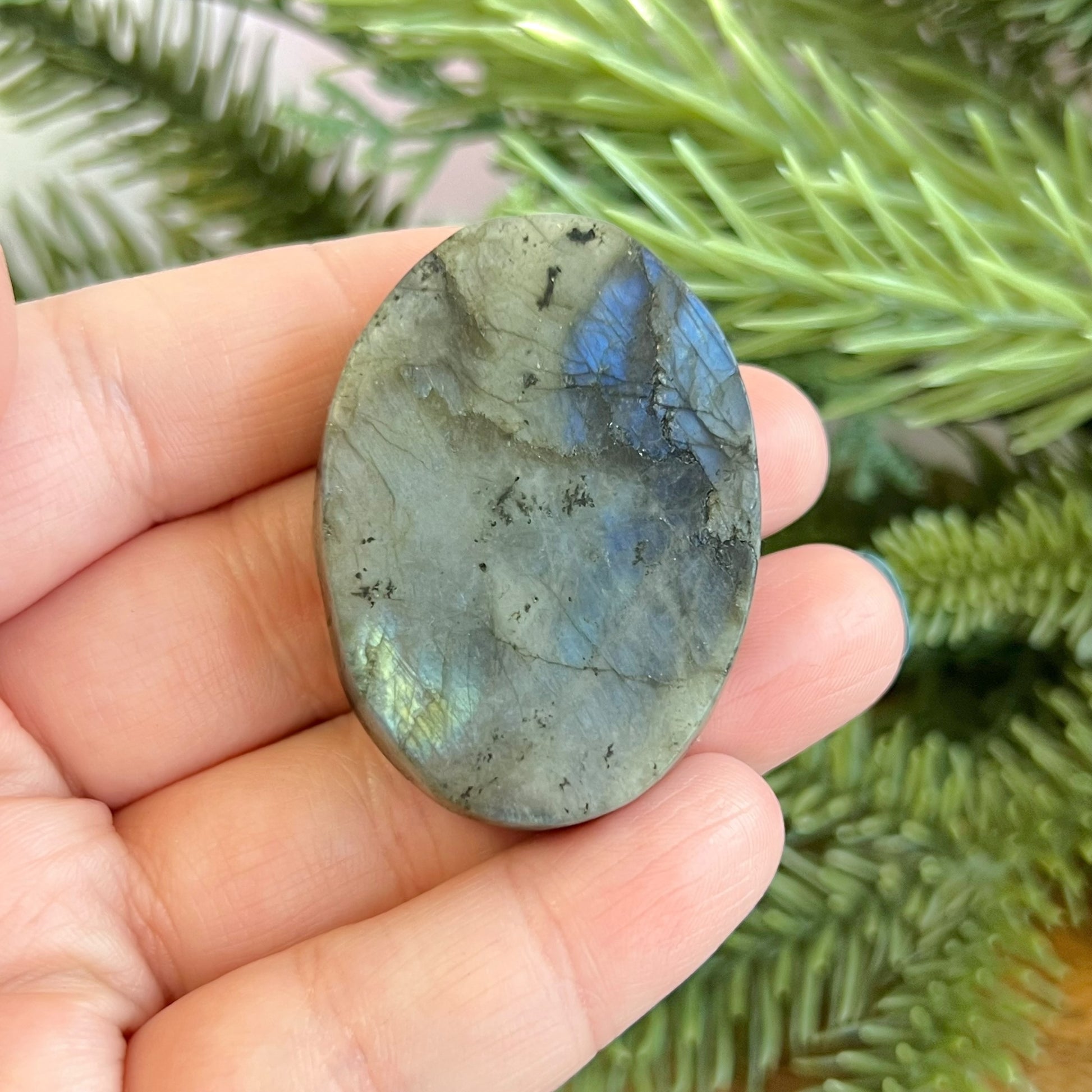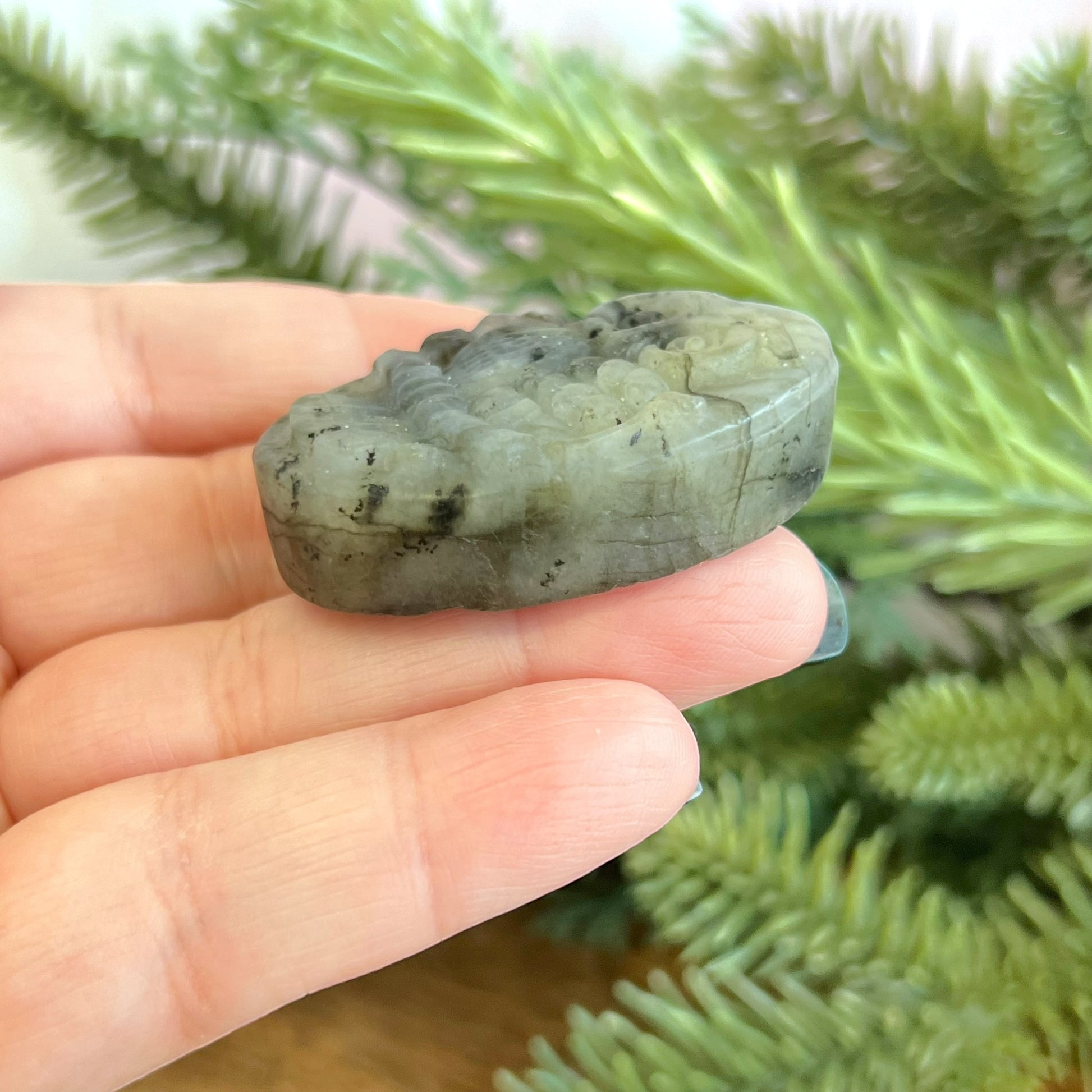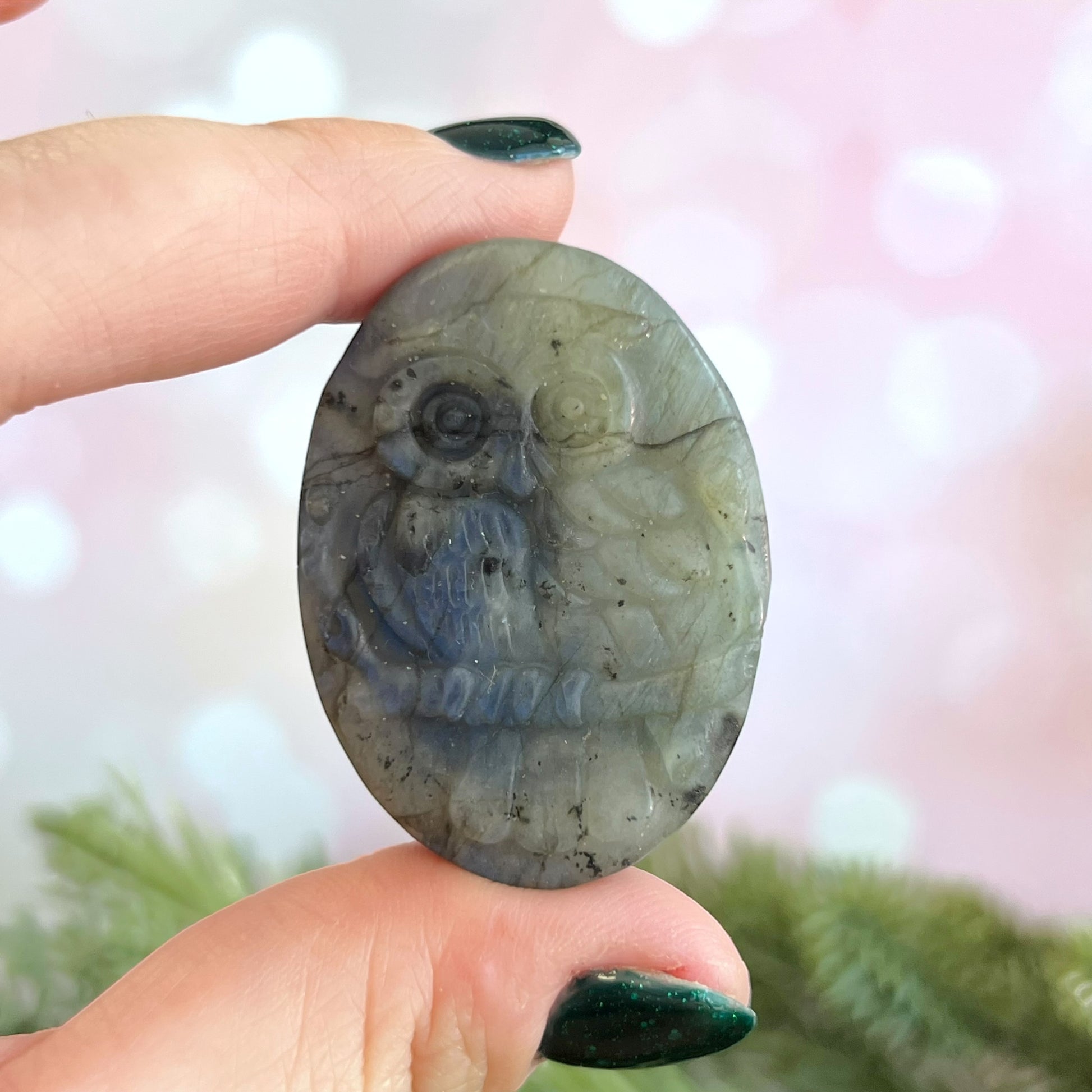 Enhance your spiritual practices with this beautiful Labradorite carved stone cabochon. This crystal features a detailed owl carving.