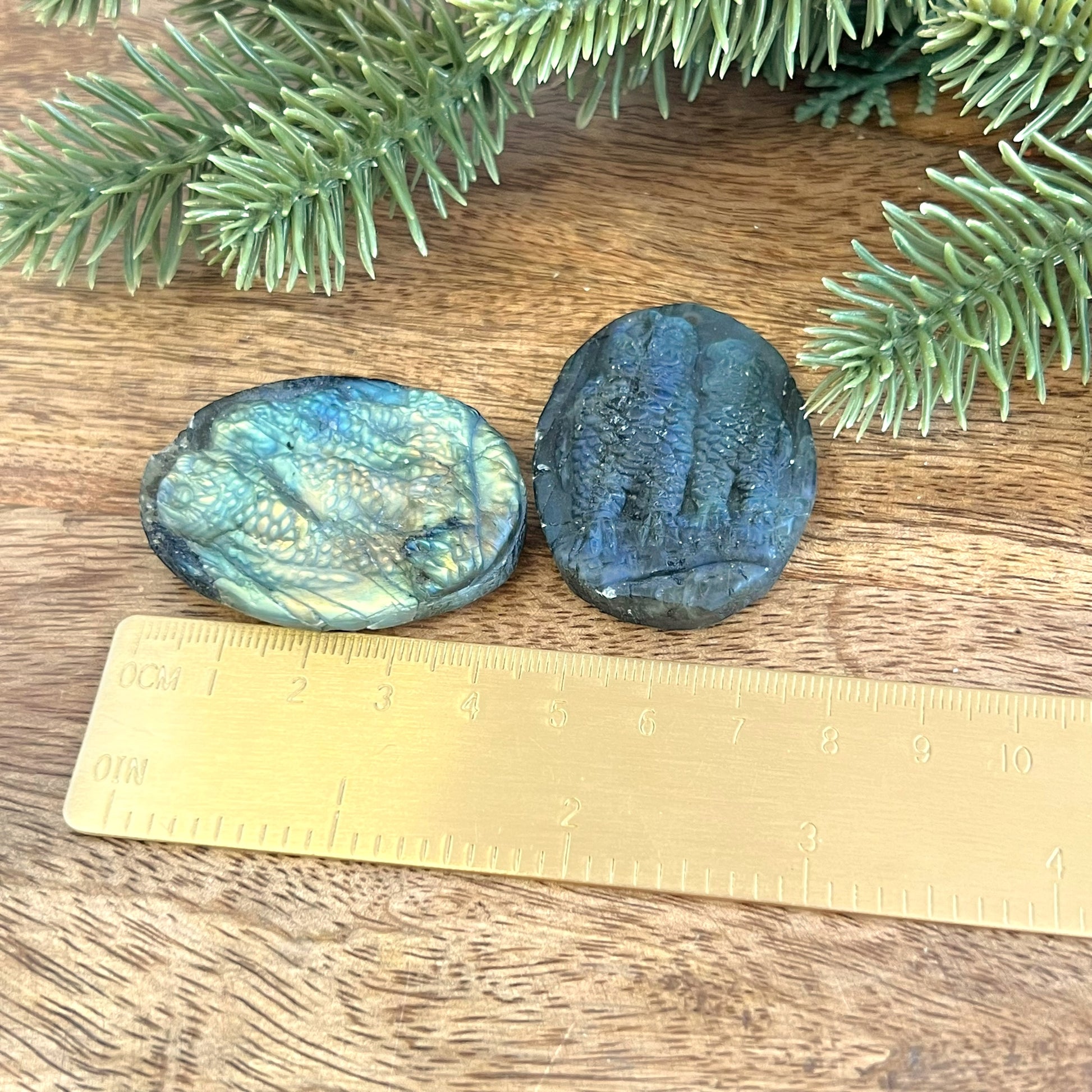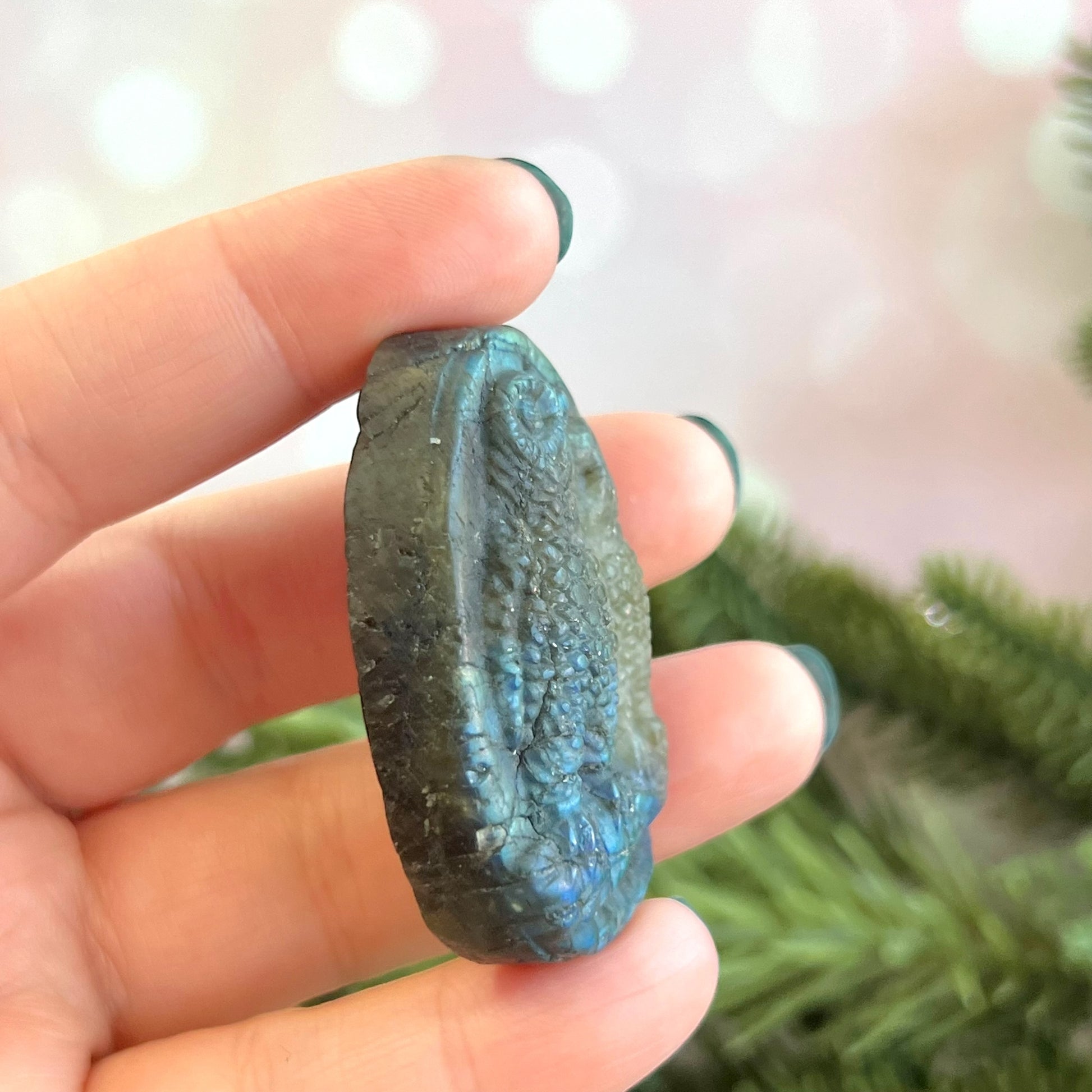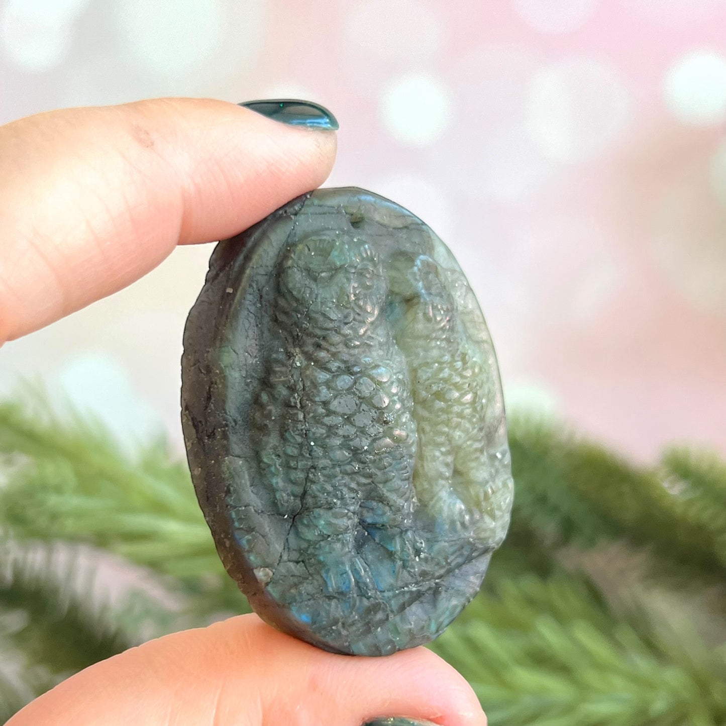 Enhance your spiritual practices with this beautiful Labradorite carved stone cabochon. This crystal features a detailed carving of two snuggling owls.
