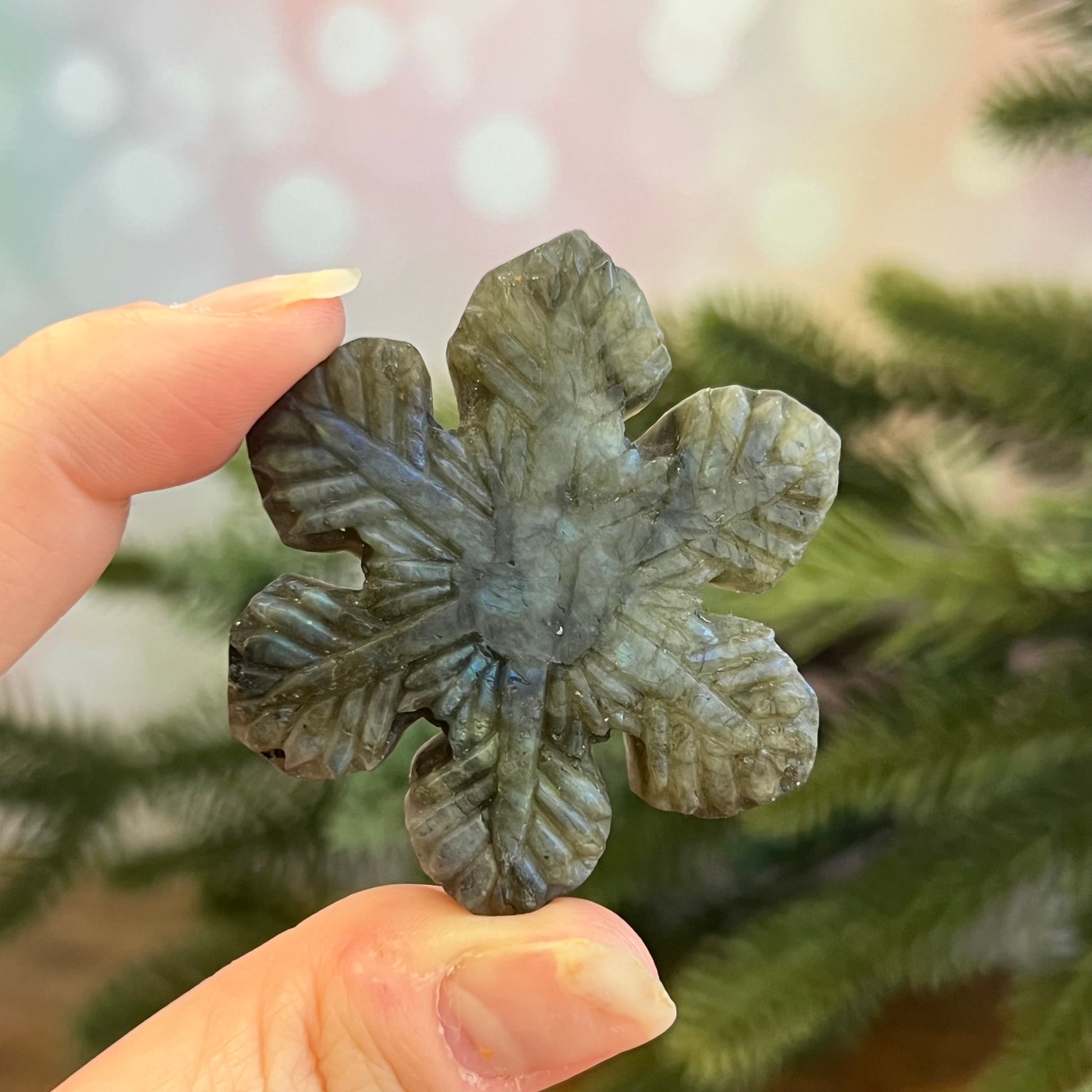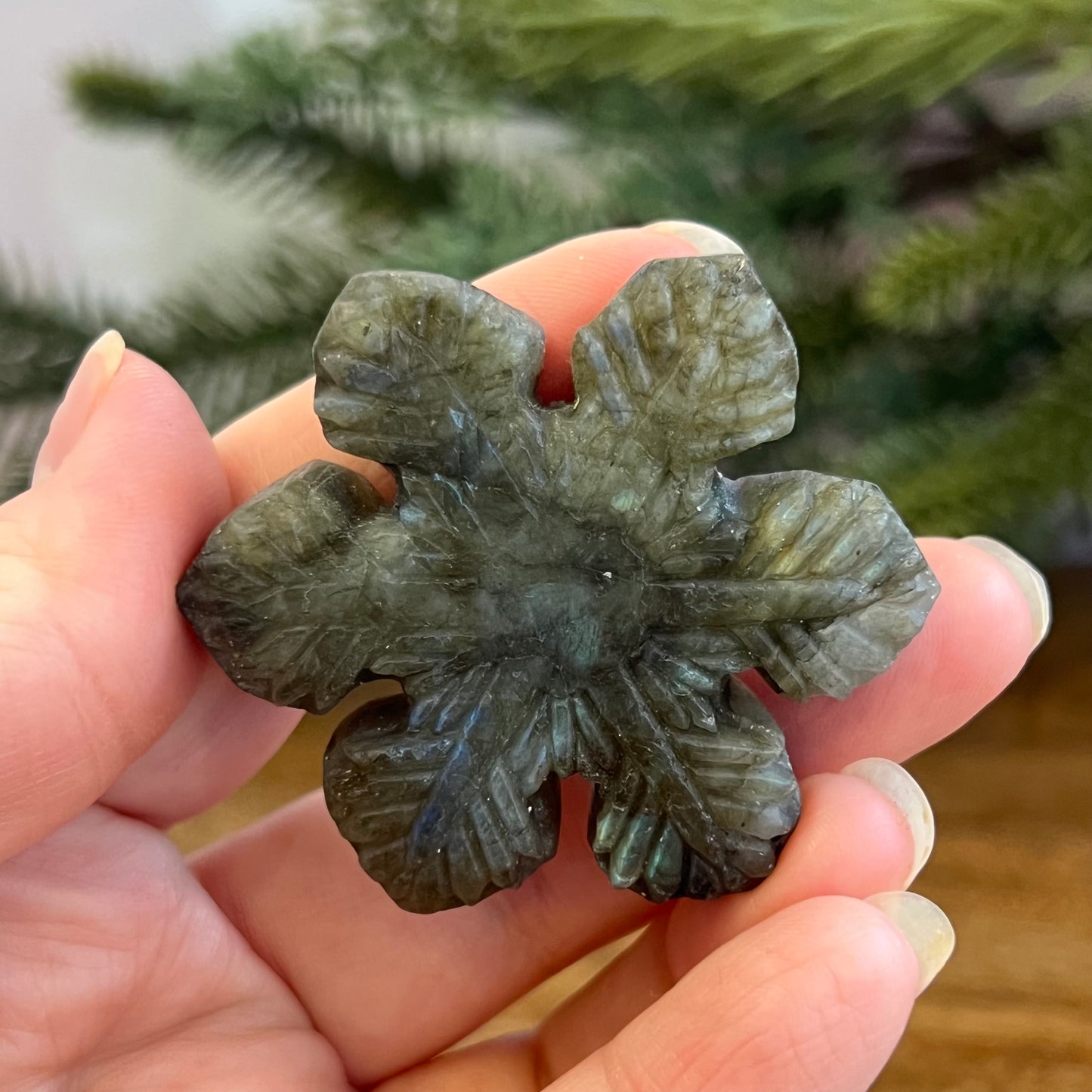 Enhance your spiritual practices with this beautiful Labradorite crystal carved stone cabochon. Featuring an intricately carved snowflake, perfect for getting into cozy winter vibes. Also makes a great Amulet for weather spell work.
