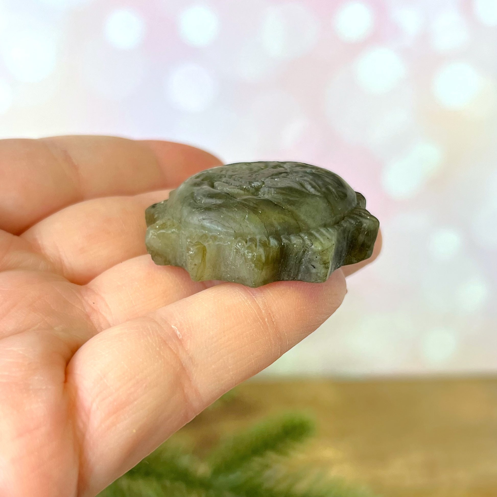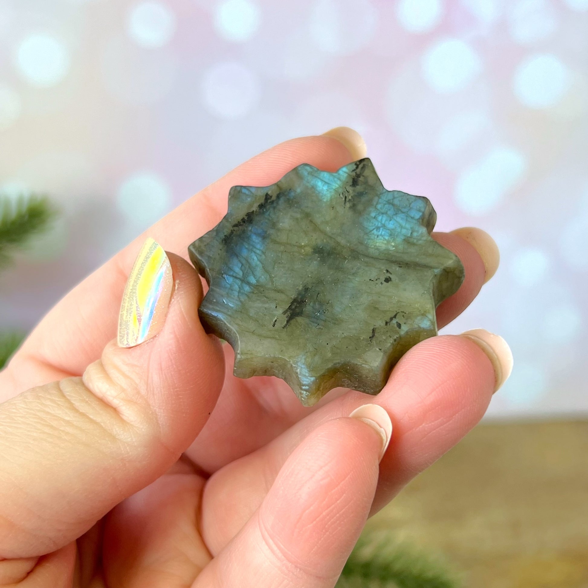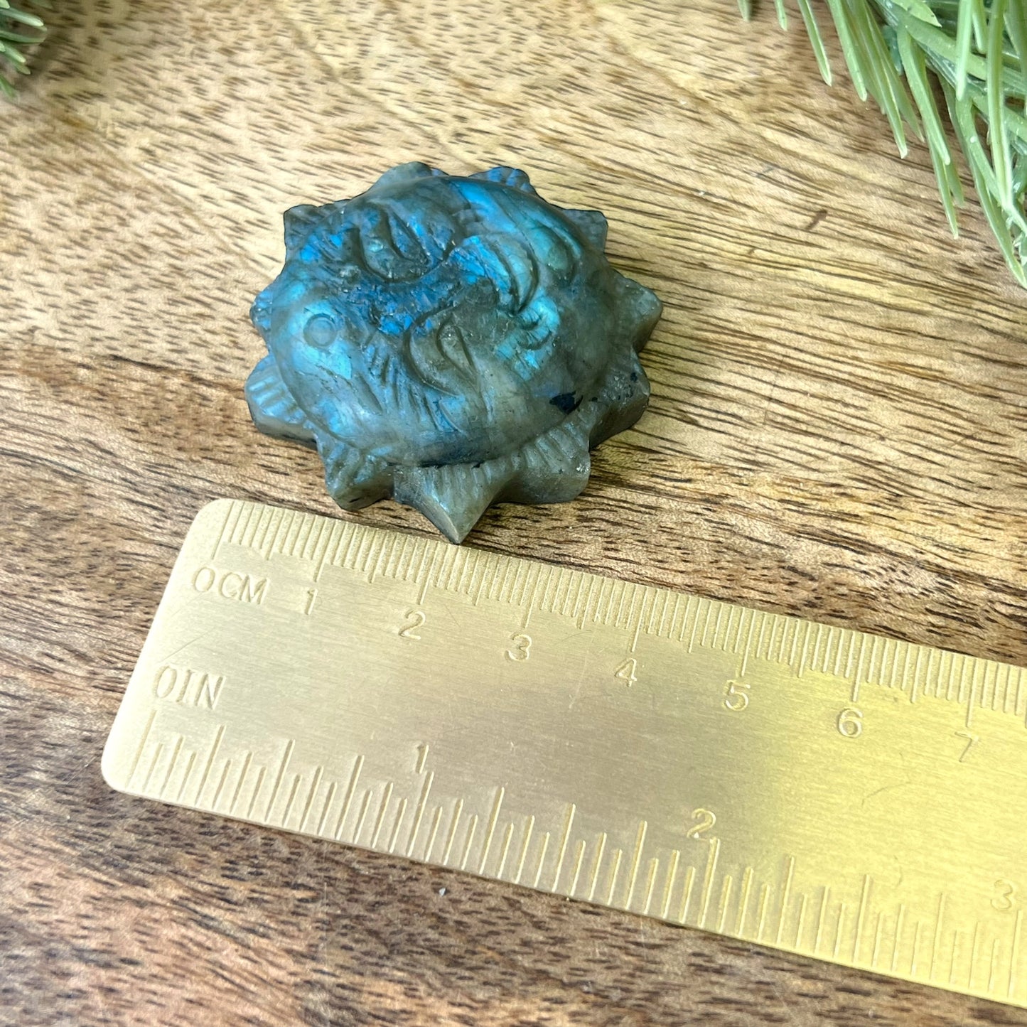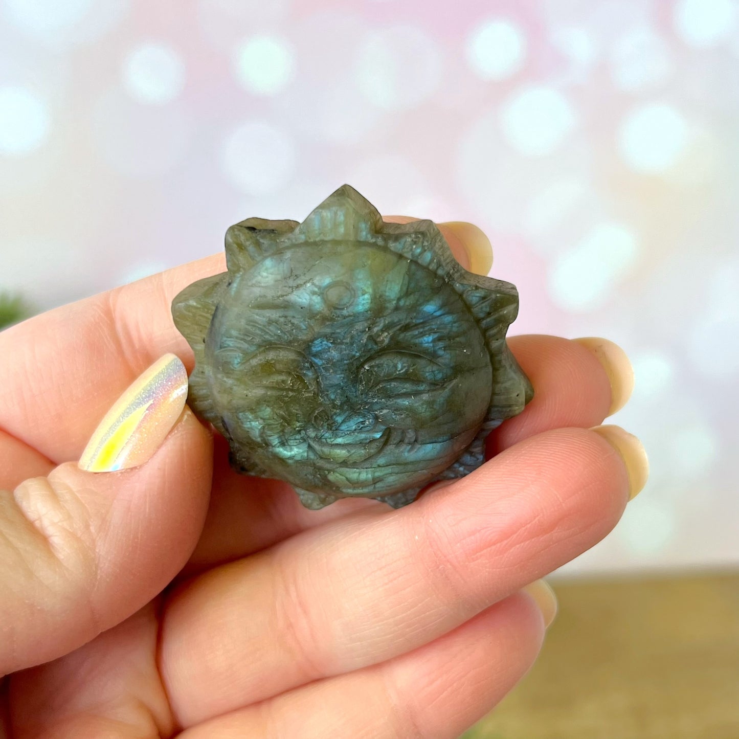 Enhance your spiritual practices with this beautiful Labradorite carved stone cabochon. This crystal features a smiling sun.