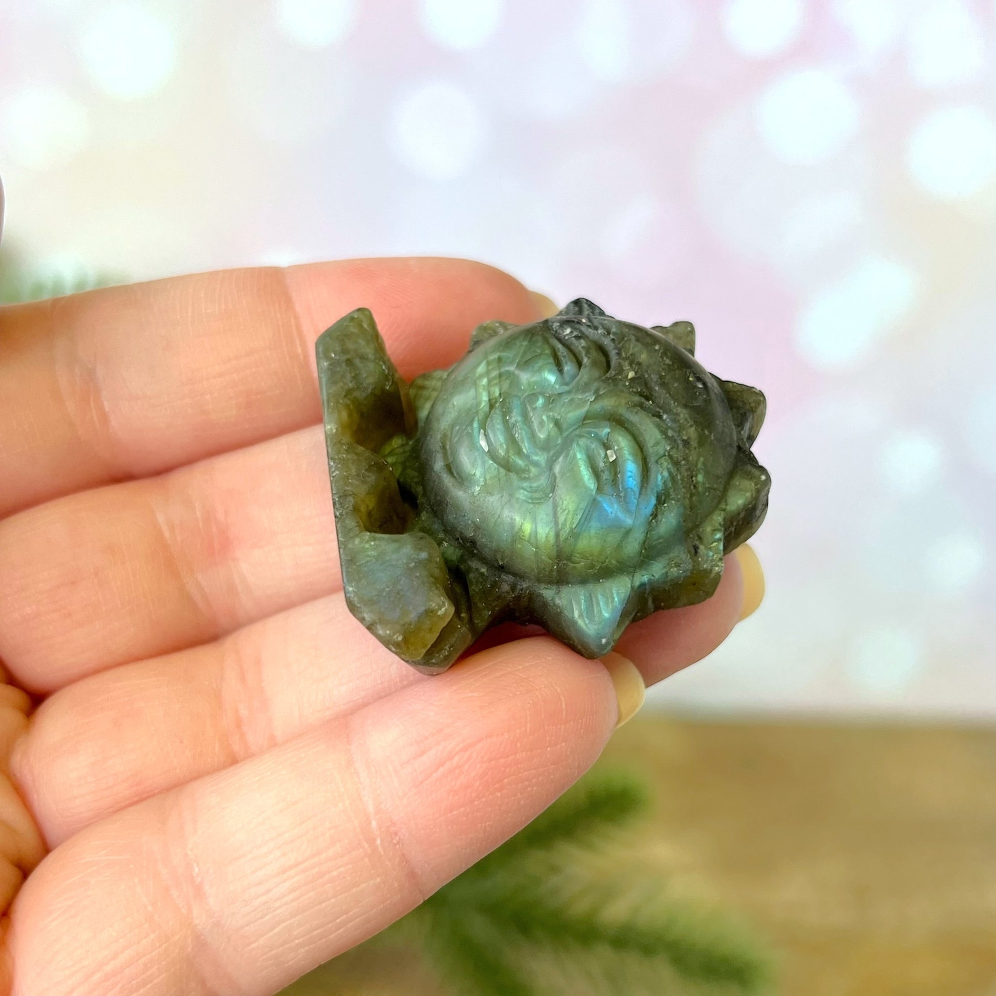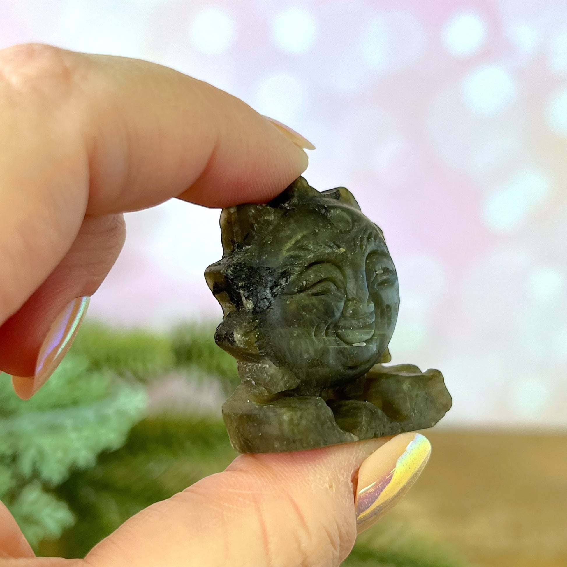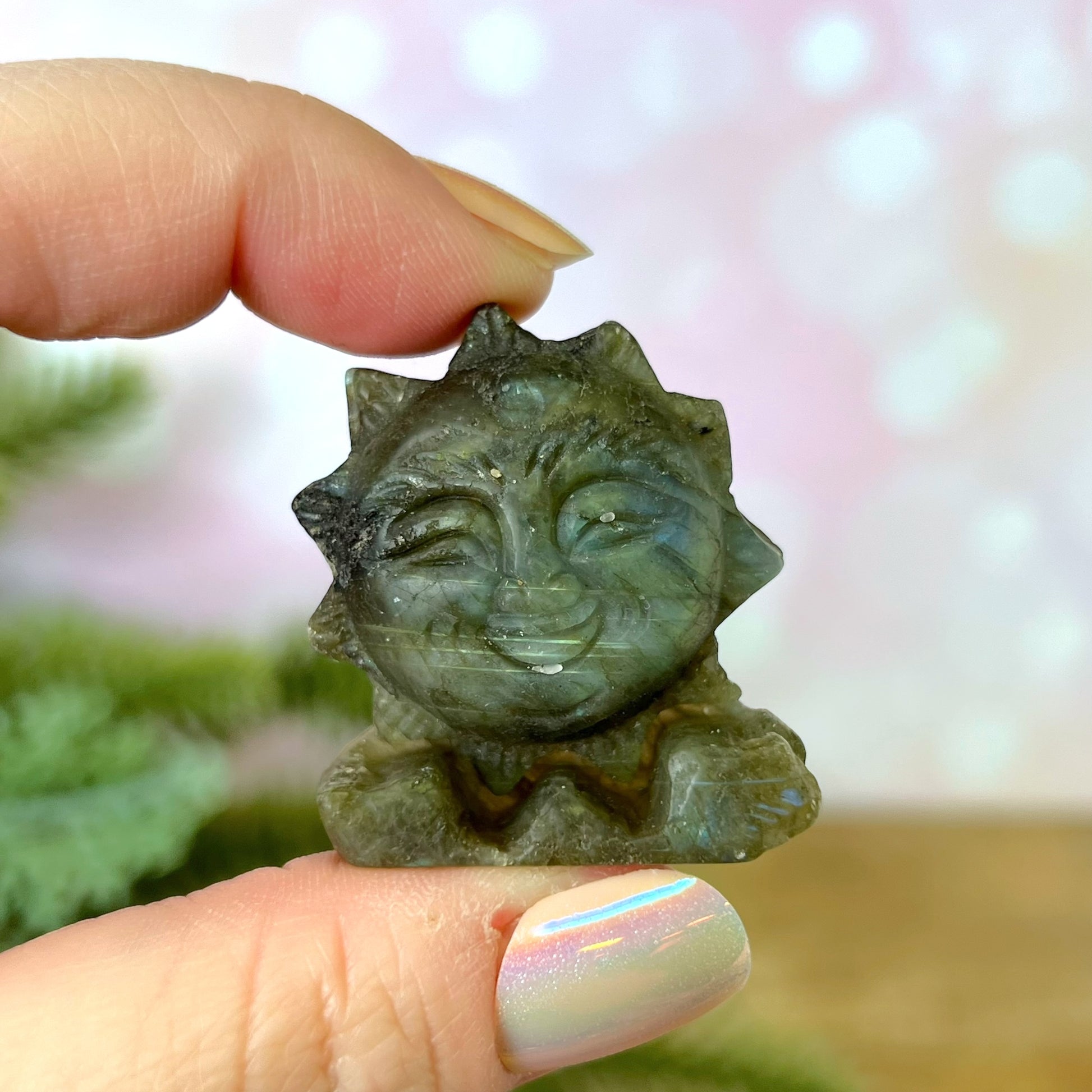 Enhance your spiritual practices with this beautiful Labradorite carved stone cabochon. This crystal features a smiling sun.