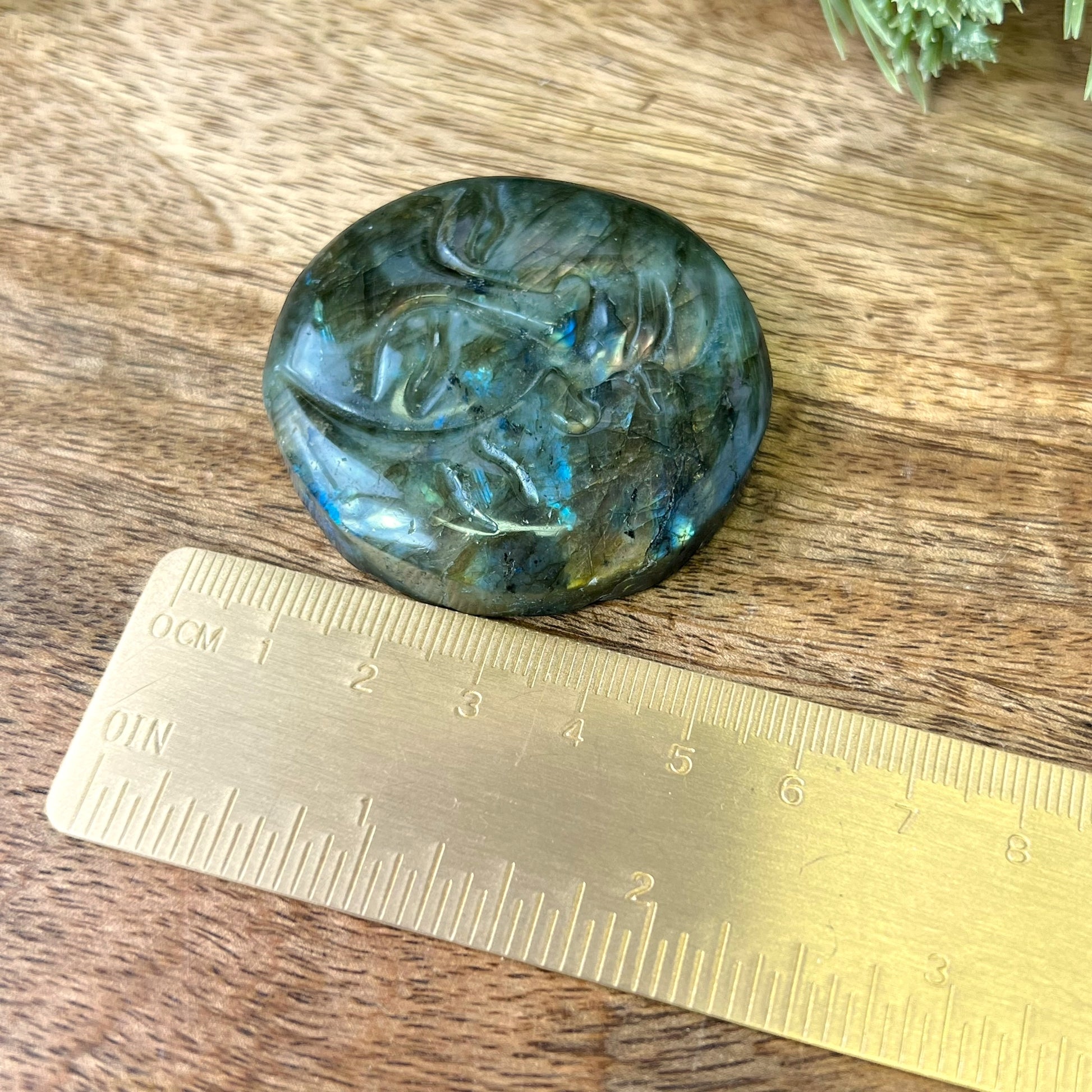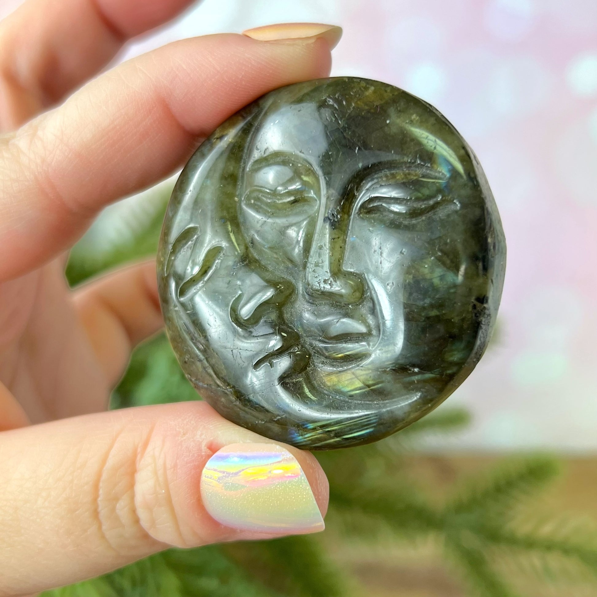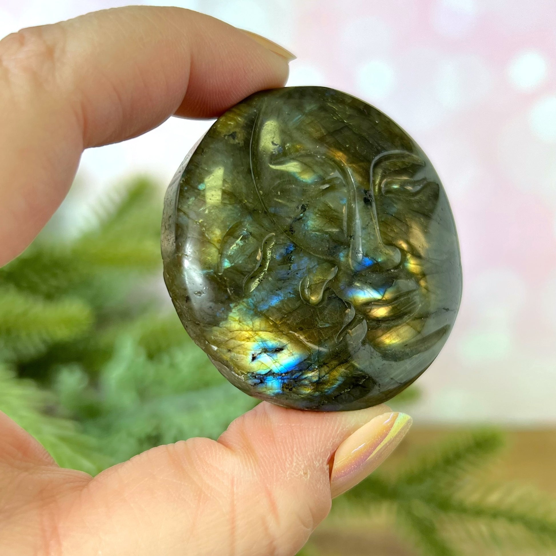 Enhance your spiritual practices with this beautiful Labradorite carved stone cabochon. This crystal features a detailed sun and moon face.