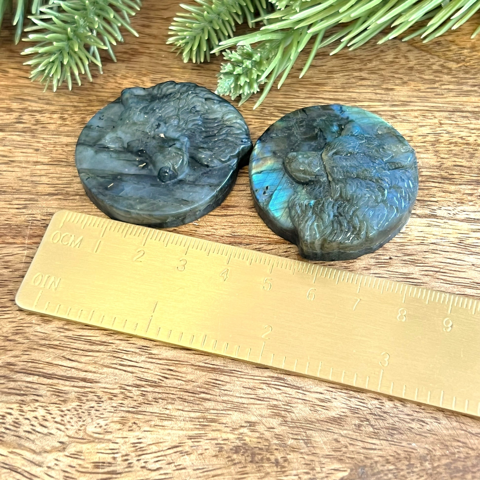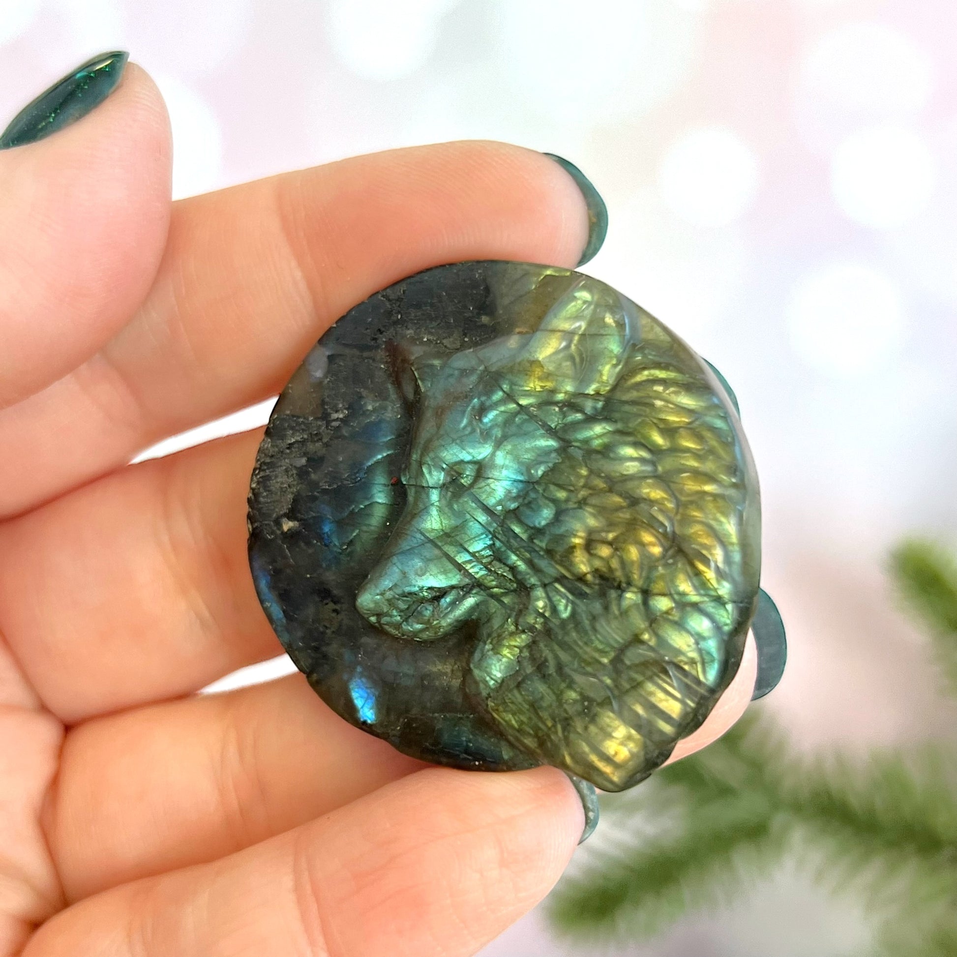 Enhance your spiritual practices with this beautiful Labradorite carved stone cabochon. This crystal features a detailed Wolf. Wolves are a beautiful animal associated with strength, endurance, majesty, and danger. We may often think of the "lone wolf" stereotype, but wolves are actually very social. Choose a wolf when you're creating new paths in your life and need some companionship in tough times.