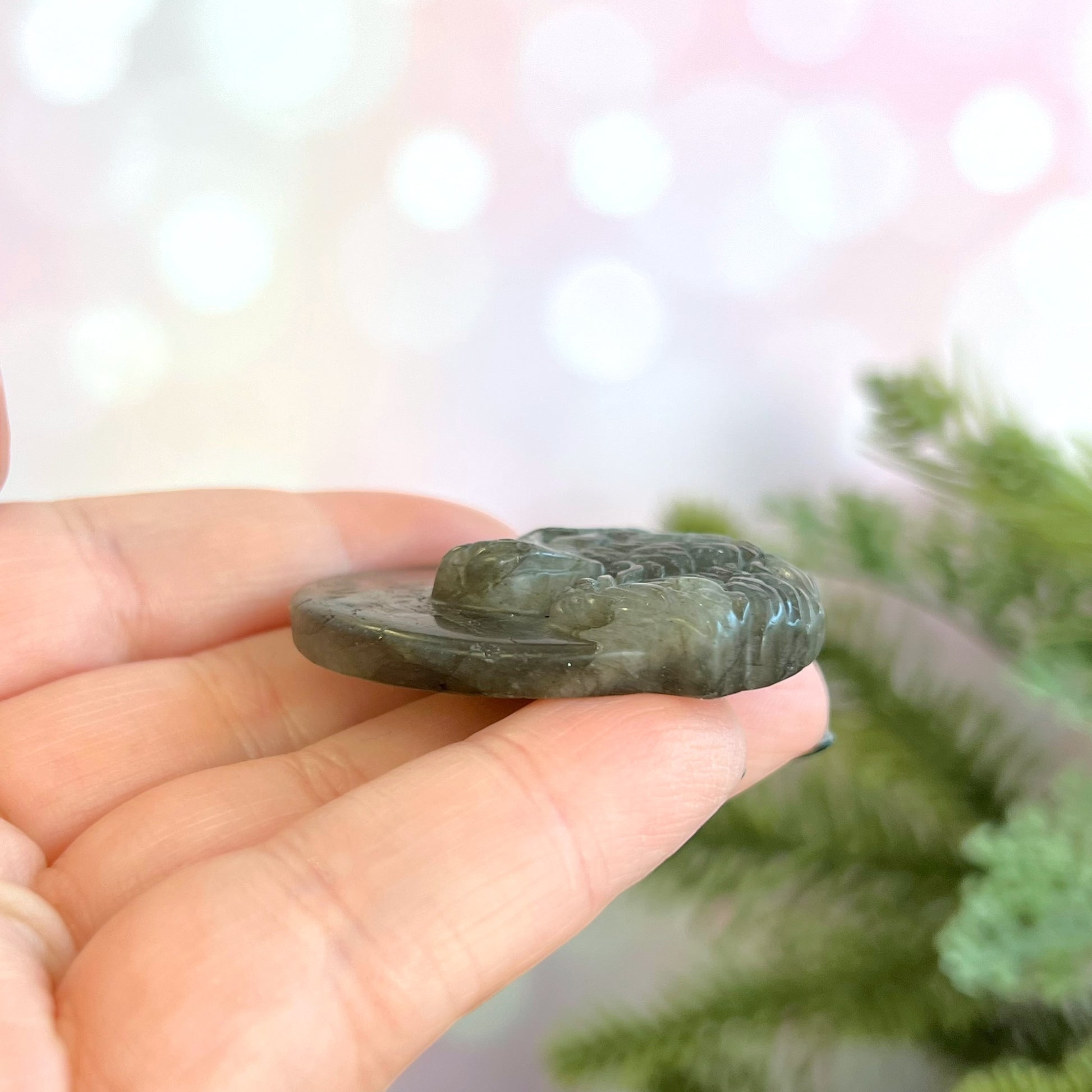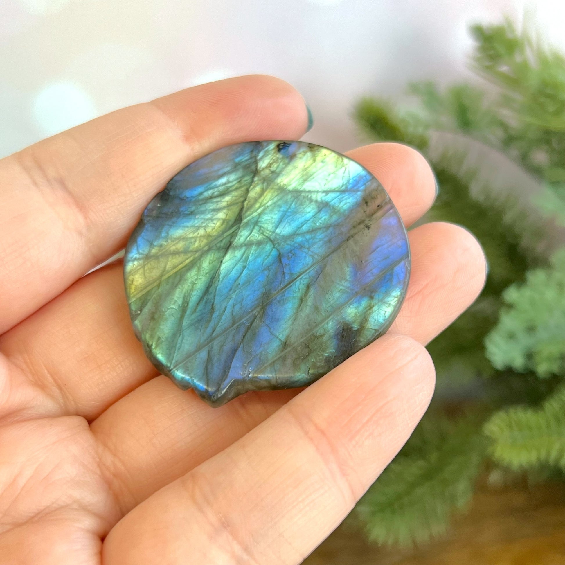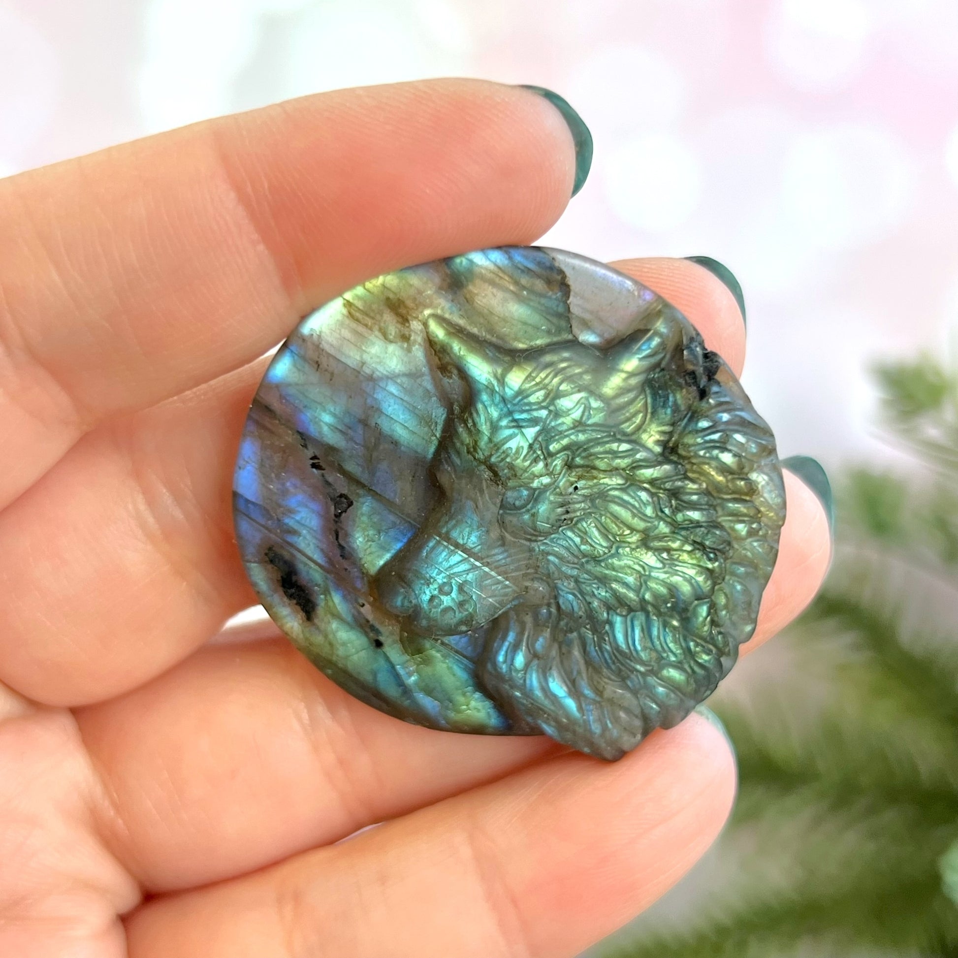 Enhance your spiritual practices with this beautiful Labradorite carved stone cabochon. This crystal features a detailed Wolf. Wolves are a beautiful animal associated with strength, endurance, majesty, and danger. We may often think of the "lone wolf" stereotype, but wolves are actually very social. Choose a wolf when you're creating new paths in your life and need some companionship in tough times.