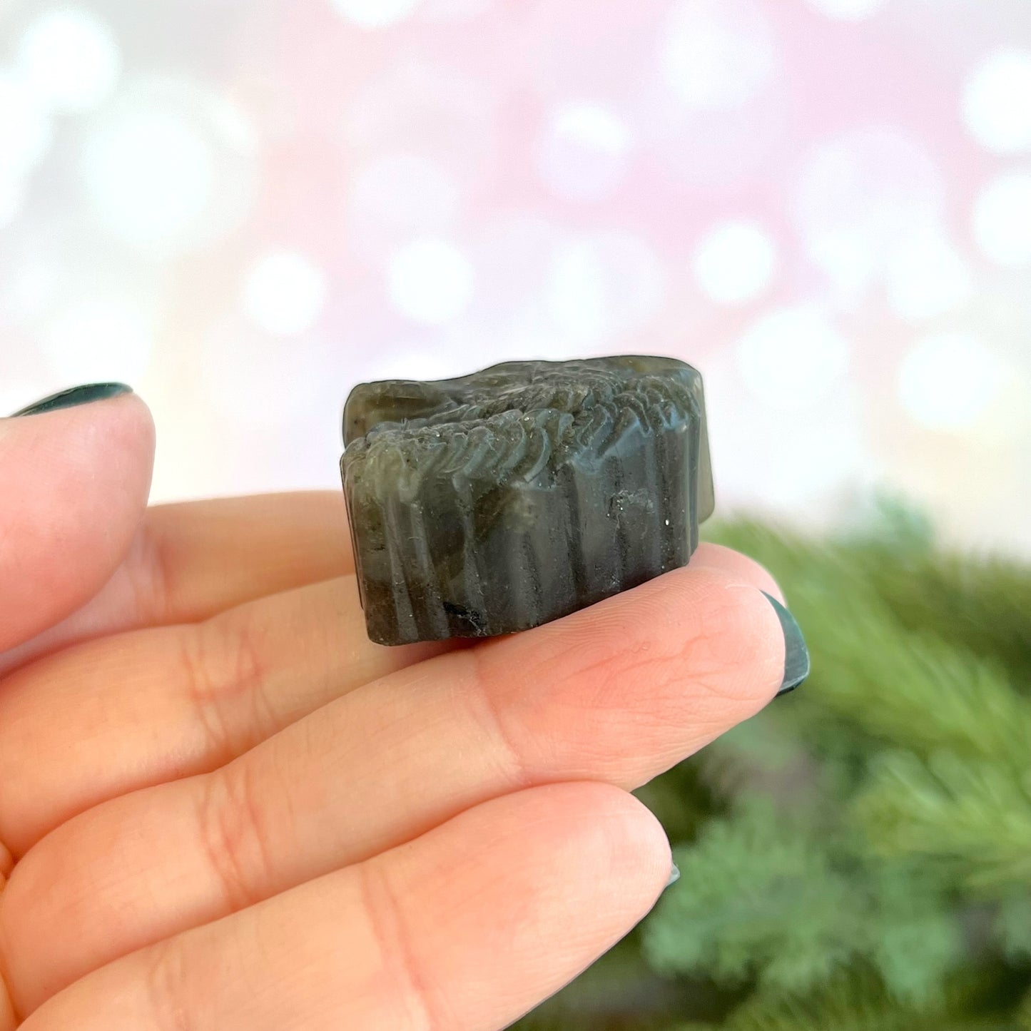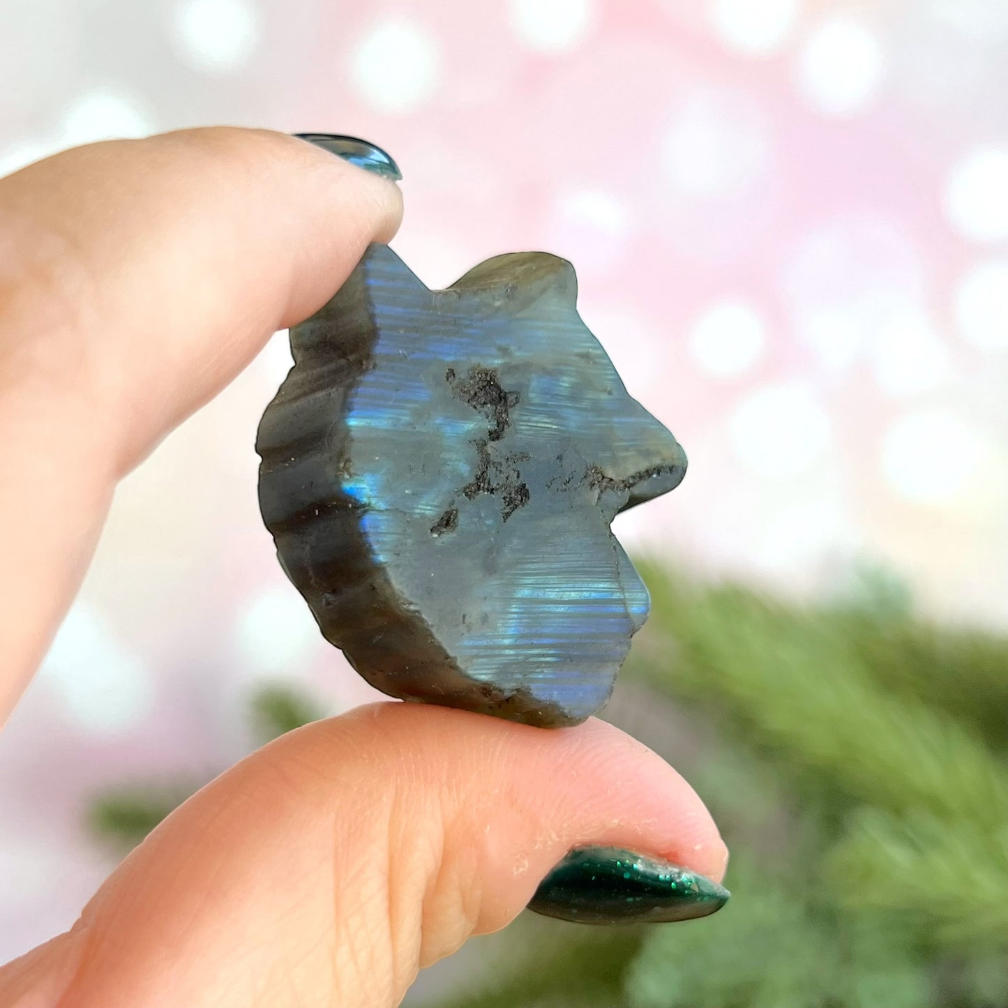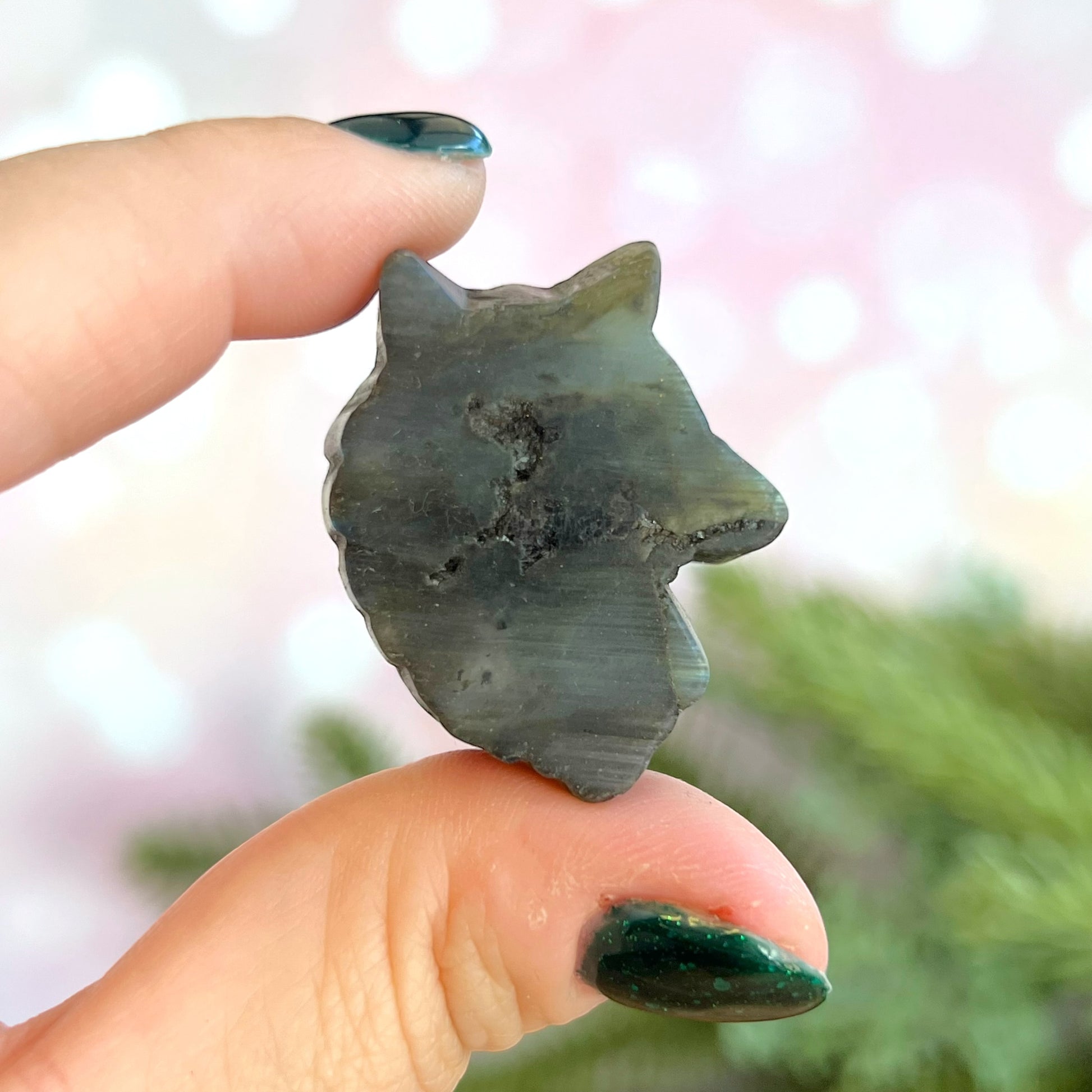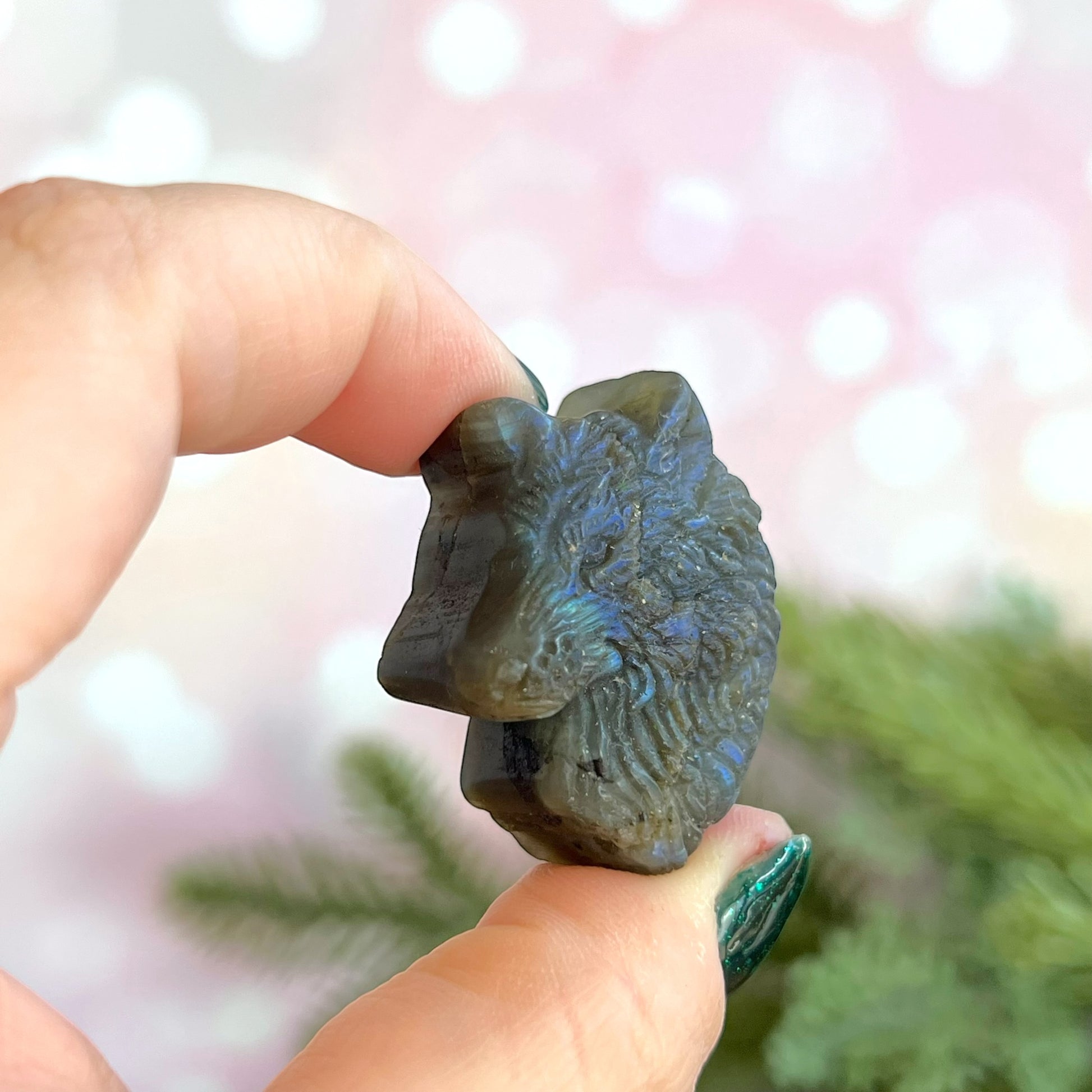 Enhance your spiritual practices with this beautiful Labradorite carved stone cabochon. This crystal features a detailed wolf's head carving.