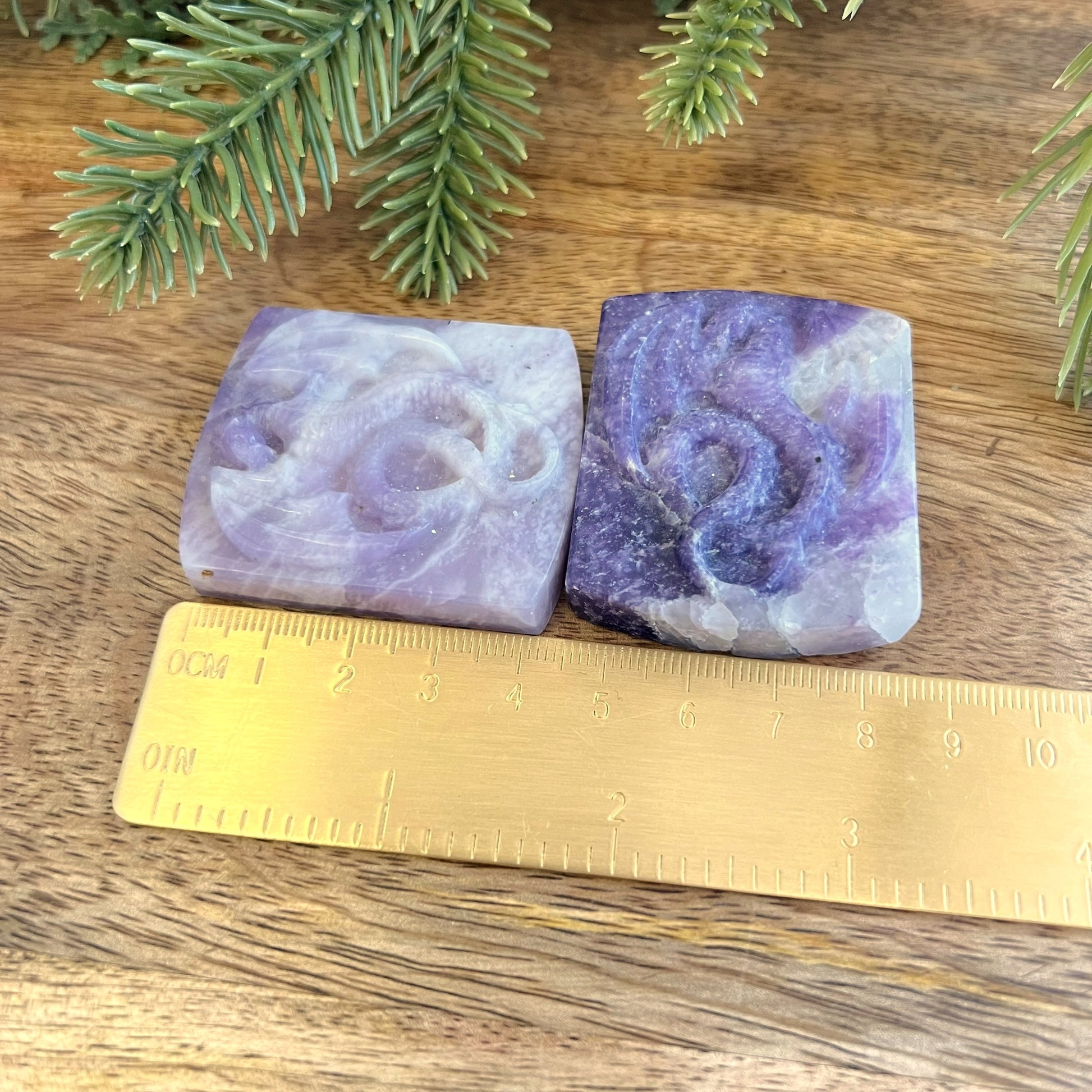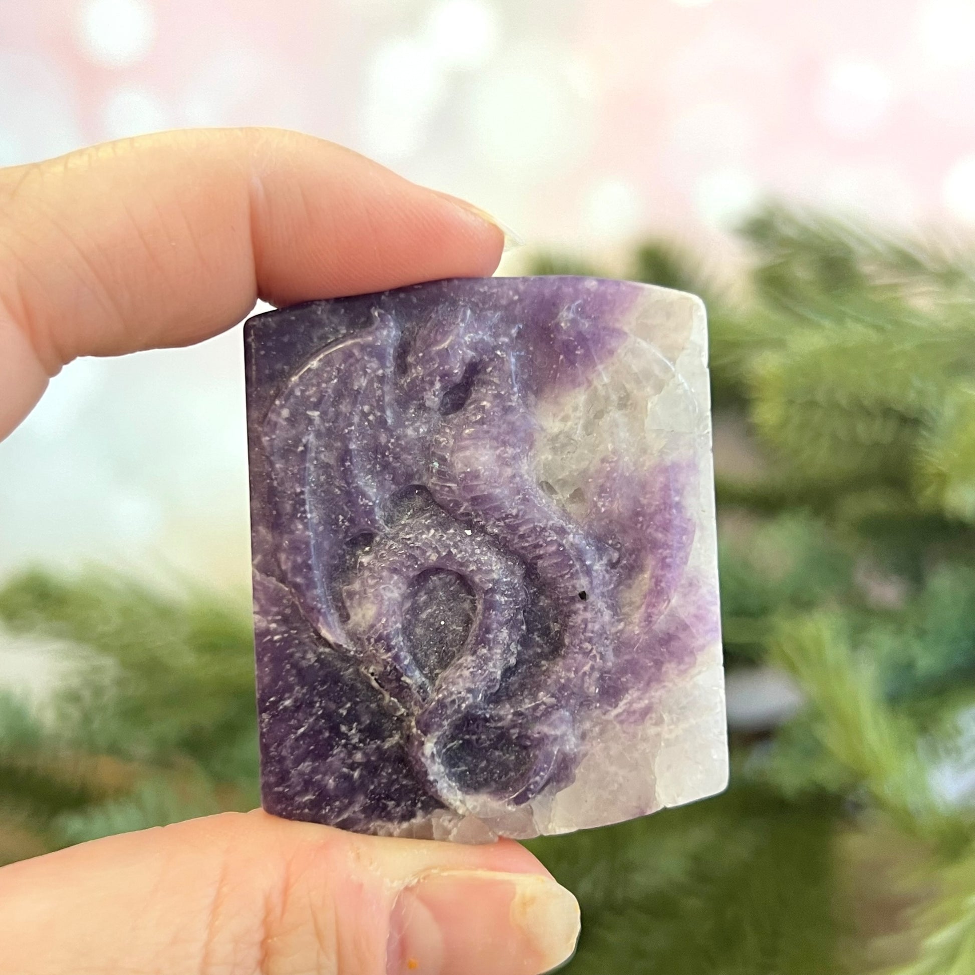 Enhance your spiritual practices with this beautiful purple Lepidolite carved stone cabochon. This crystal features a detailed, coiled dragon Carved onto a rectangular shape.