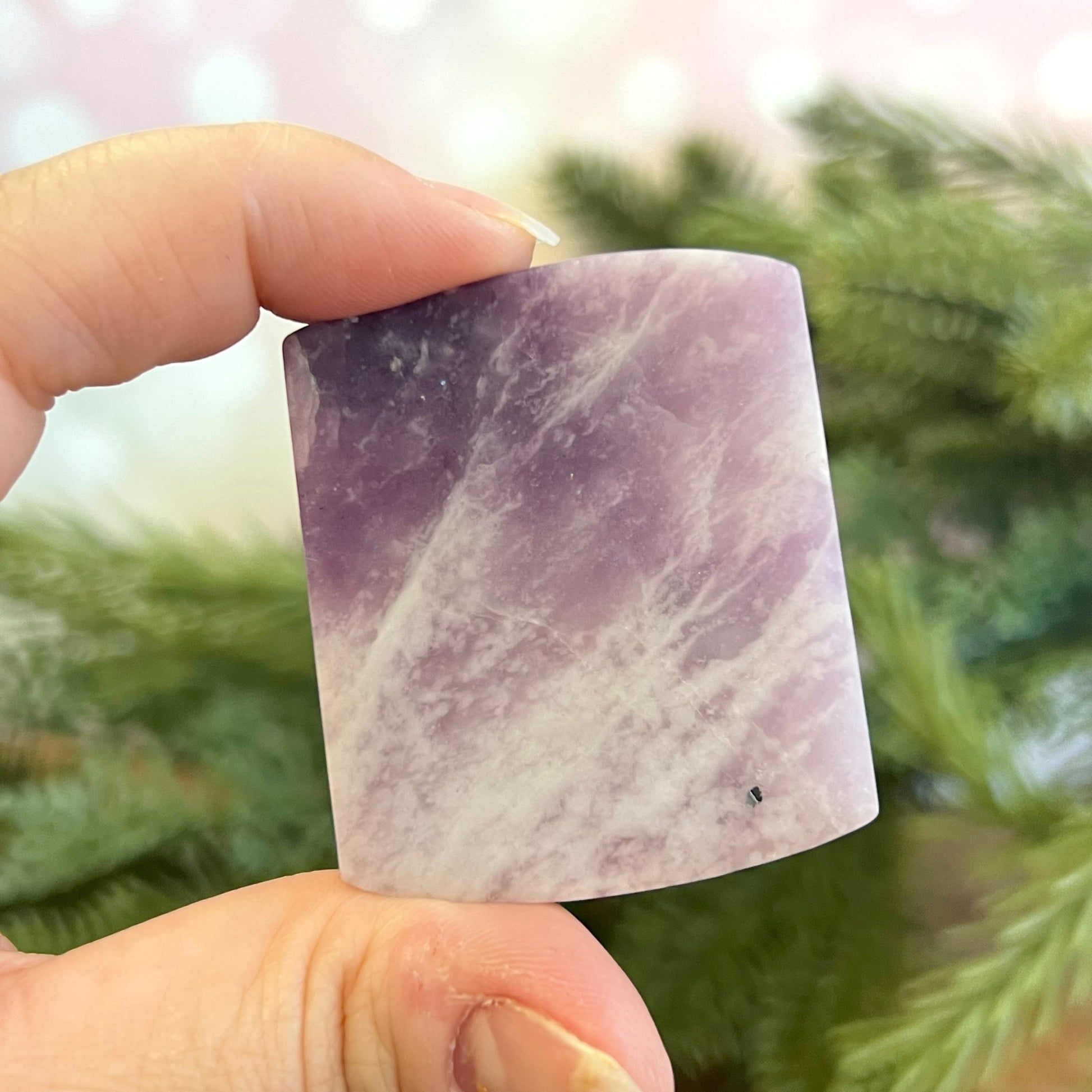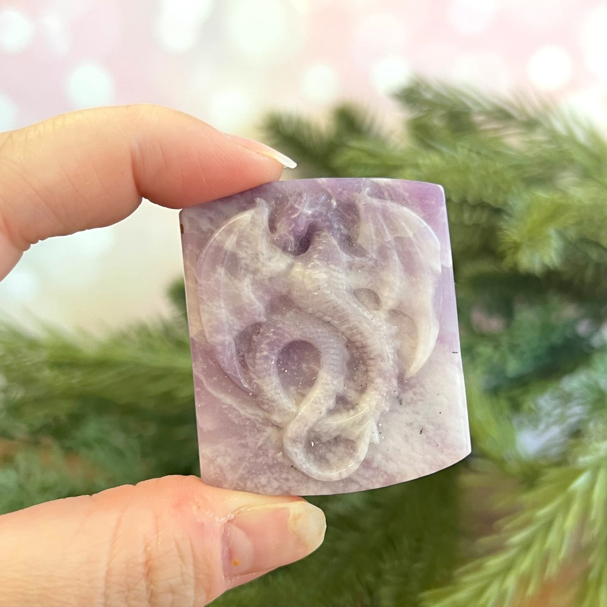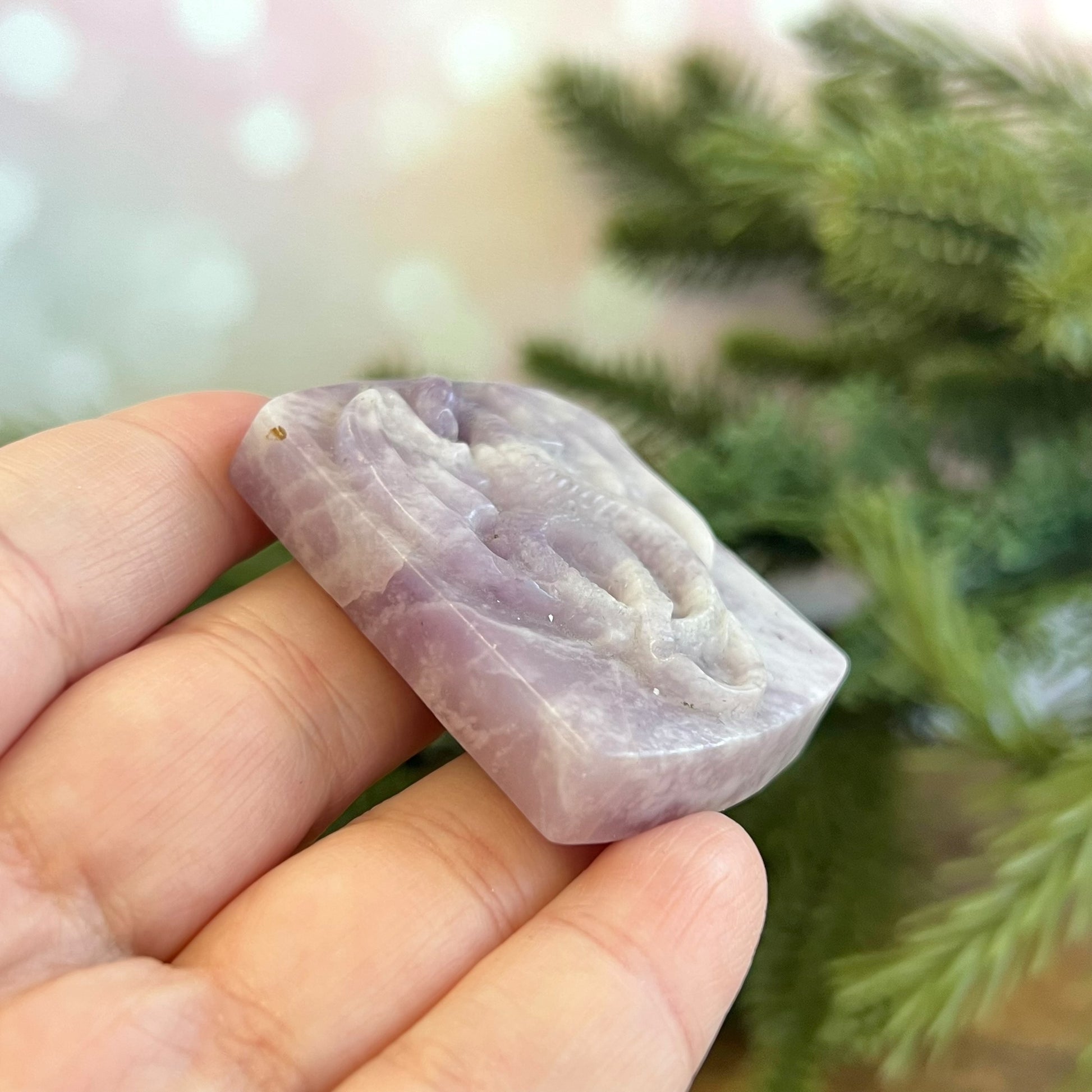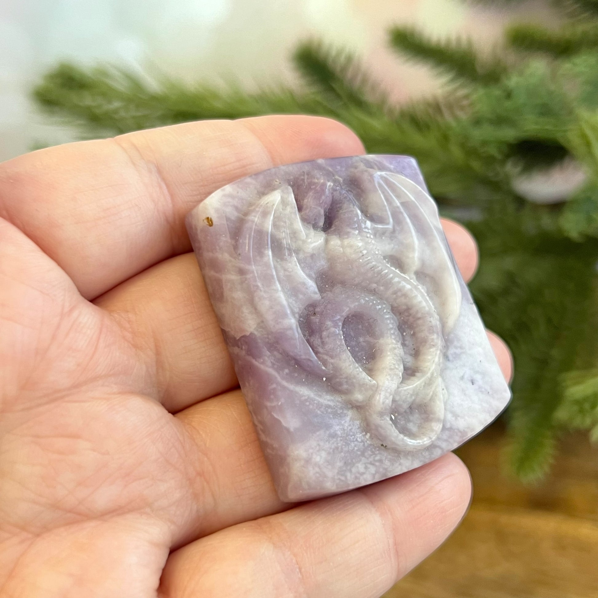 Enhance your spiritual practices with this beautiful purple Lepidolite carved stone cabochon. This crystal features a detailed, coiled dragon Carved onto a rectangular shape.